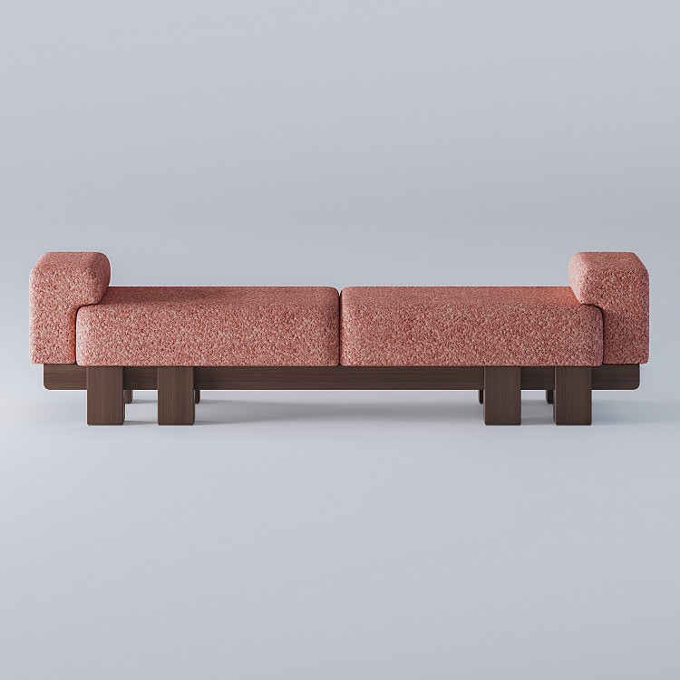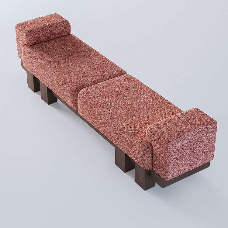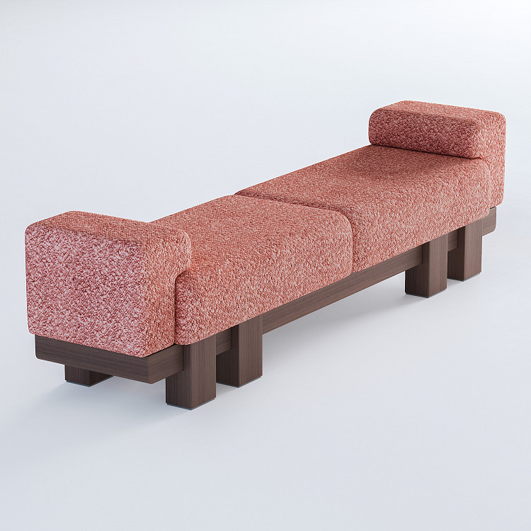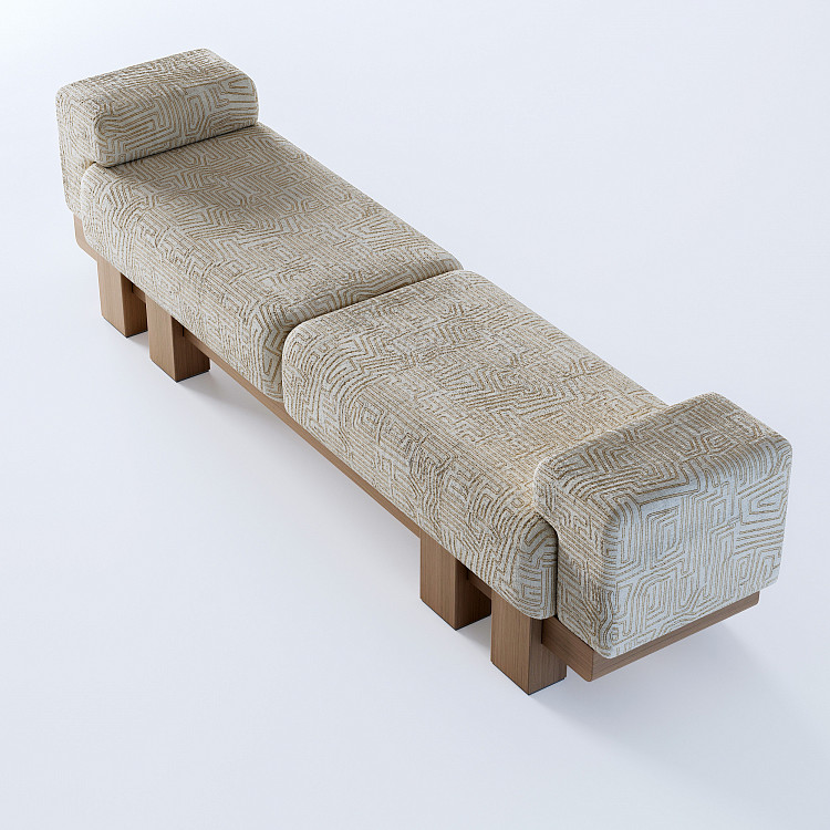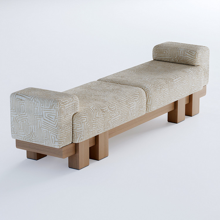 Банкетка Modénature Ester Bench от Alexander Beloborodov имеет симметричную композицию из трех мягких блоков. Боковые модули выполняют функцию подлокотников, центральный блок служит сиденьем. Под ними проходит длинная деревянная балка из светлого дерева. Четыре прямоугольные ножки, сгруппированные попарно, завершают строгий геометрический облик.
