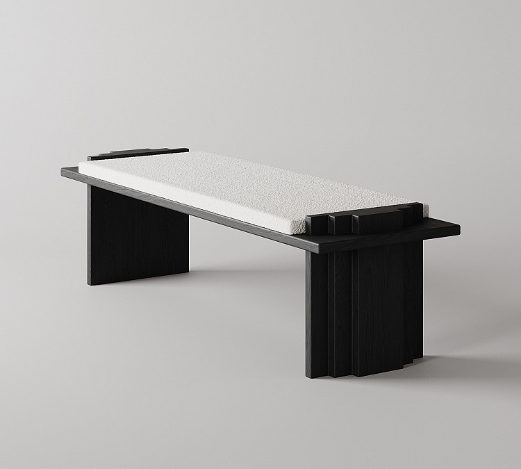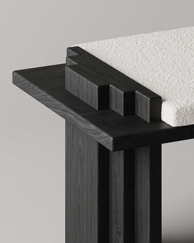Банкетка Modénature Gema Bench от Daria Zakharrian — модель, конструкция которой напоминает архитектурный объект. Две боковые опоры собраны из планок разной ширины и создают графичный ступенчатый силуэт. Темное деревянное основание служит основой для светлой подушки. Углы украшены декоративными ступенчатыми элементами.