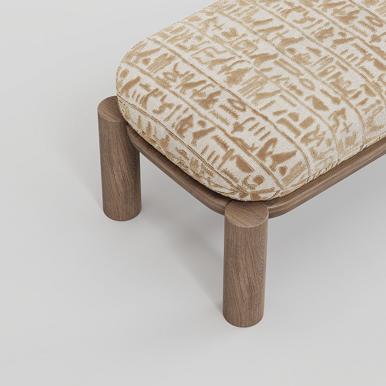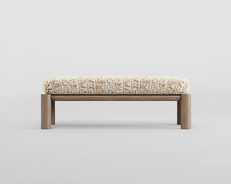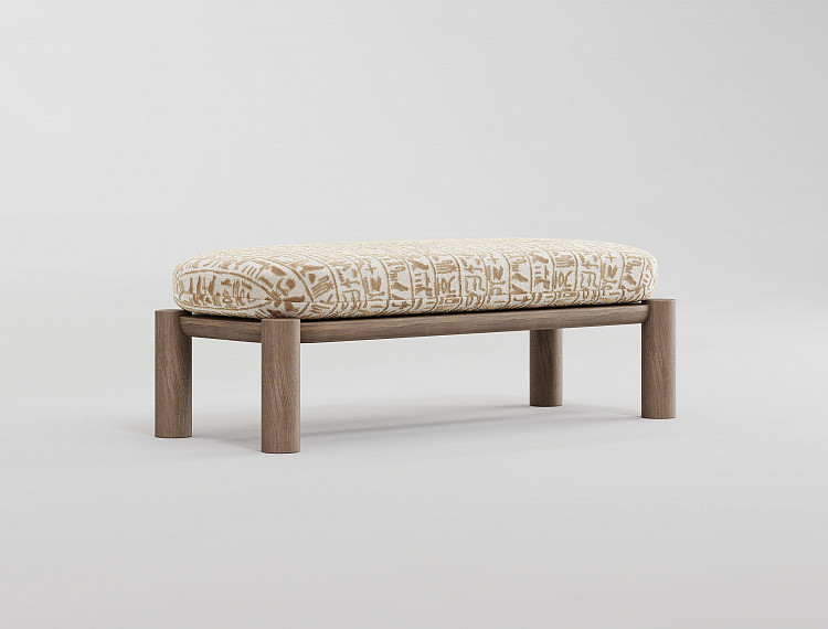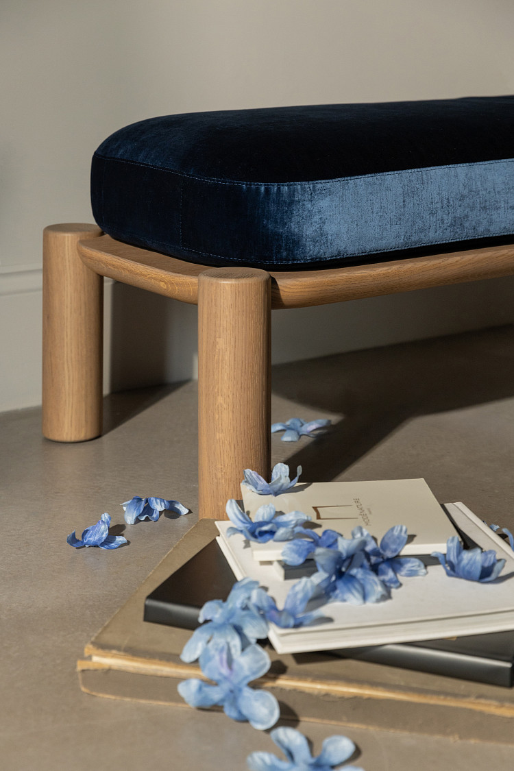 Банкетка Modénature Kova Bench от Alexandra Lykova — модель с цилиндрическими ножками, собранными в устойчивую конструкцию с помощью деревянной рамы. Мягкая подушка сиденья имеет скругленные углы. Ее объем зрительно смягчает геометрию основания. Форма сохраняет ясность линий и тактильную привлекательность.