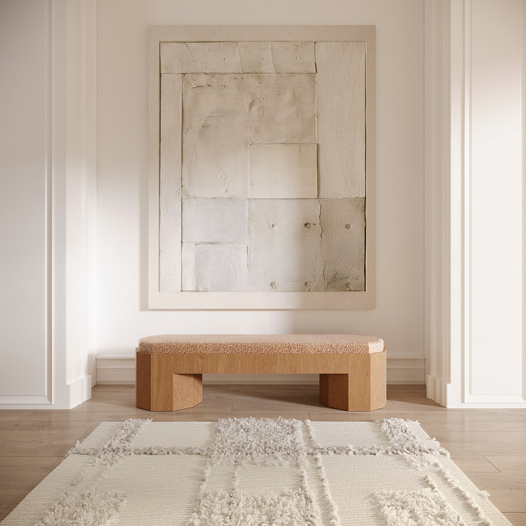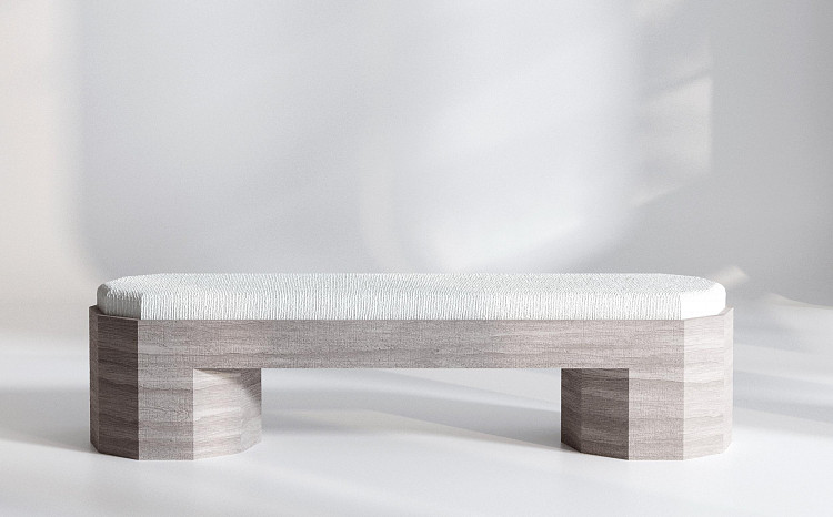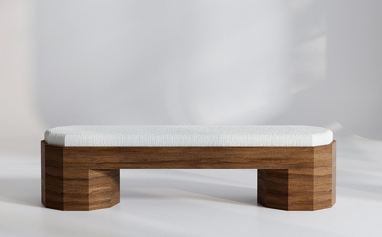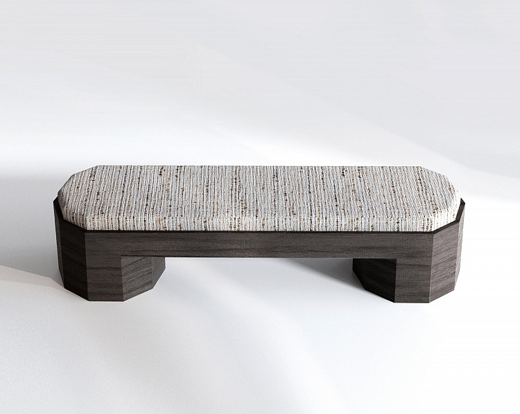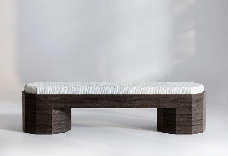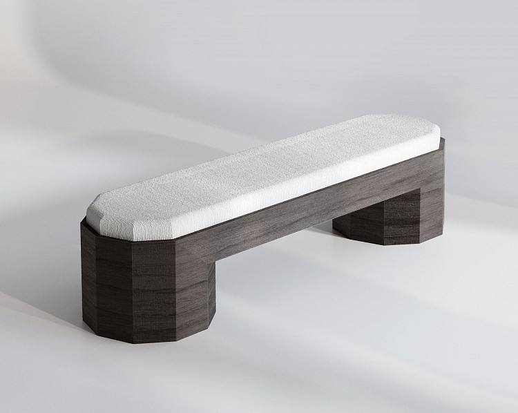 Банкетка Modénature Ozawa Bench от Olga Silanteva. Две массивные граненые опоры соединены основанием сиденья и формируют единую несущую конструкцию. Сиденье дополнено объемной мягкой подушкой. Многогранность ножек оживляет игру светотени и силуэт читается как скульптурная композиция.