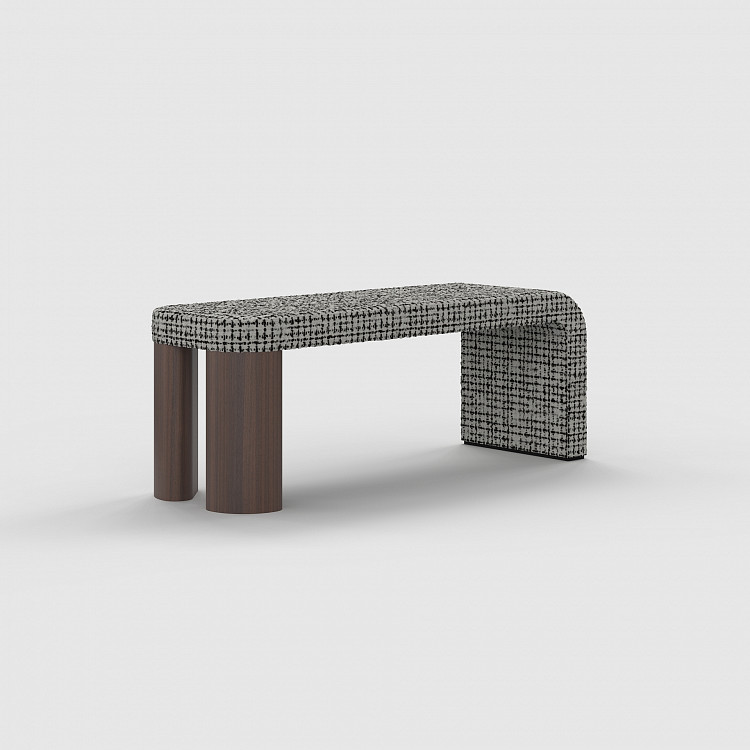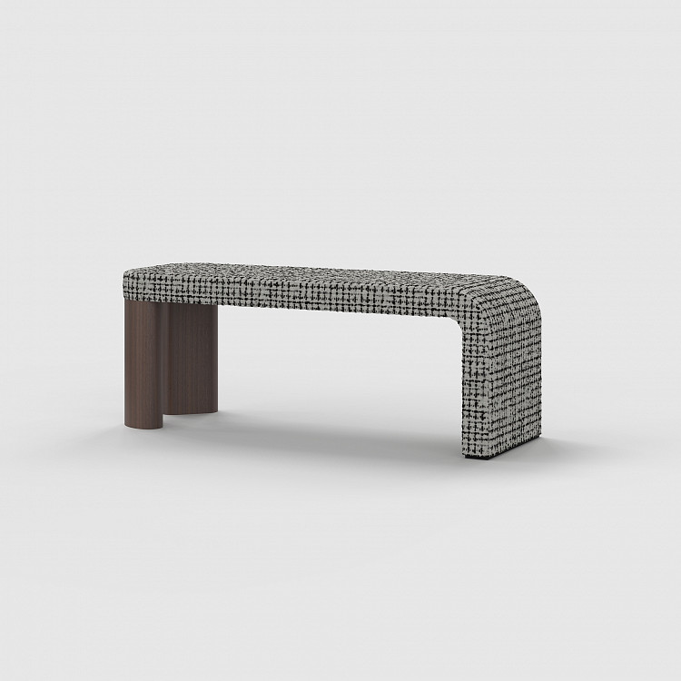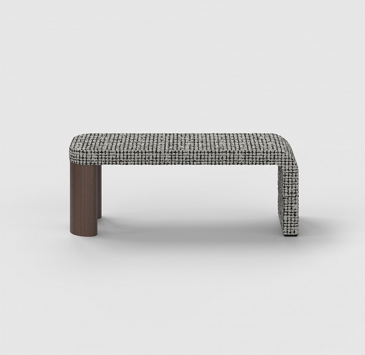 Банкетка Modénature Taiga Plus Bench от Zakhar Zylkov. Ее сиденье прямоугольной формы плавно изгибается вниз с одной стороны, образуя мягкую опору. Две отдельные деревянные ножки цилиндрической формы поддерживают другую сторону. Вся мягкая часть, включая сиденье и ногу-скобу, имеет единую обивку.