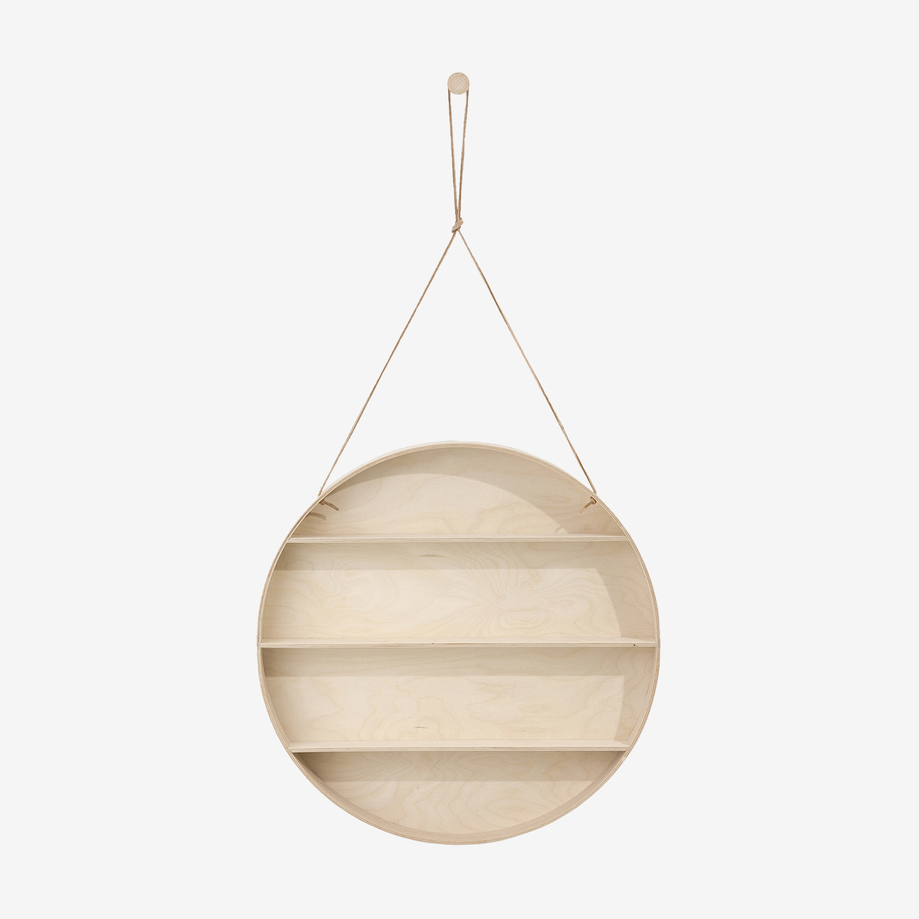 Навесная полка изготовлена из буковой и берёзовой фанеры. В комплект входит кожаный шнурок для подвешивания.