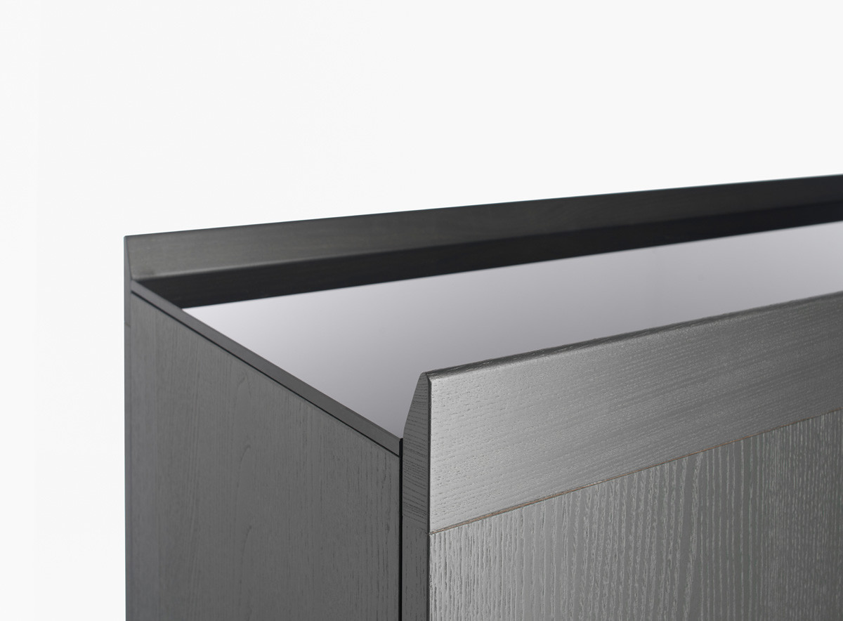 Корпус: шпонированный ясень. Кромка: массив ясеня. Внутренние полки: тонированное стекло черное. Столешница: мрамор или тонированное стекло. Ножки: бронзированная латунь. Фурнитура: системы мягкого закрывания.