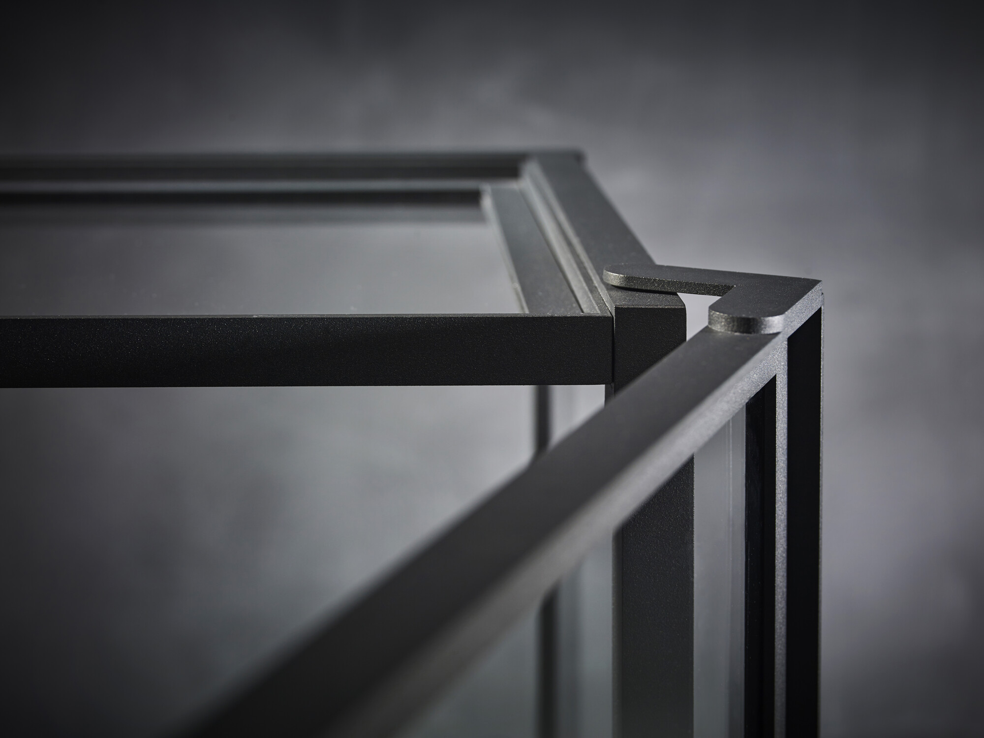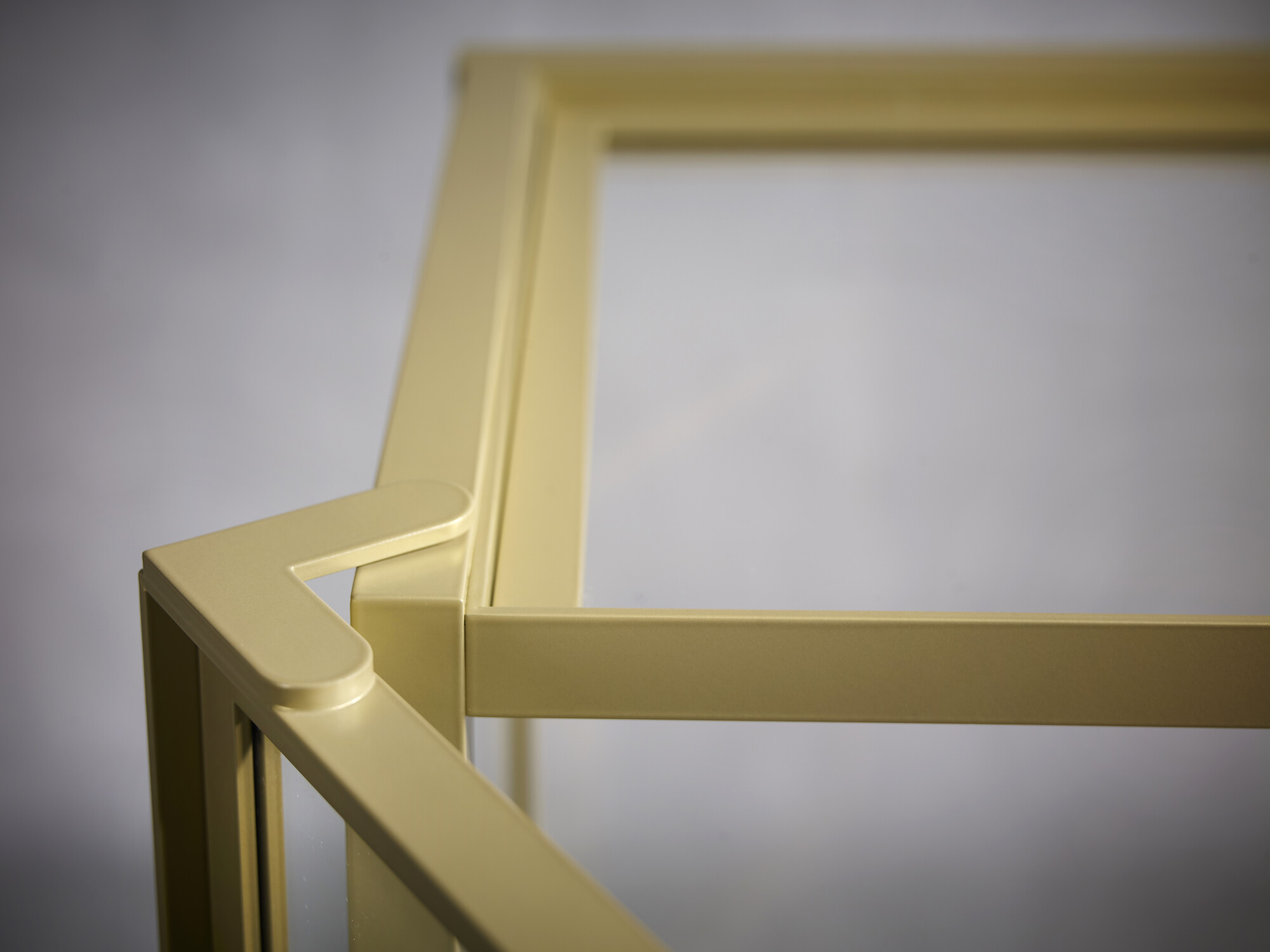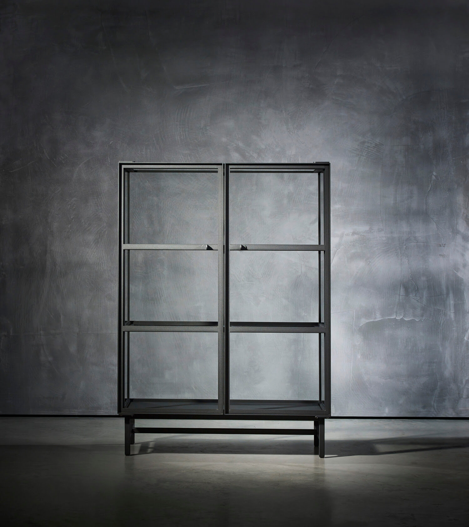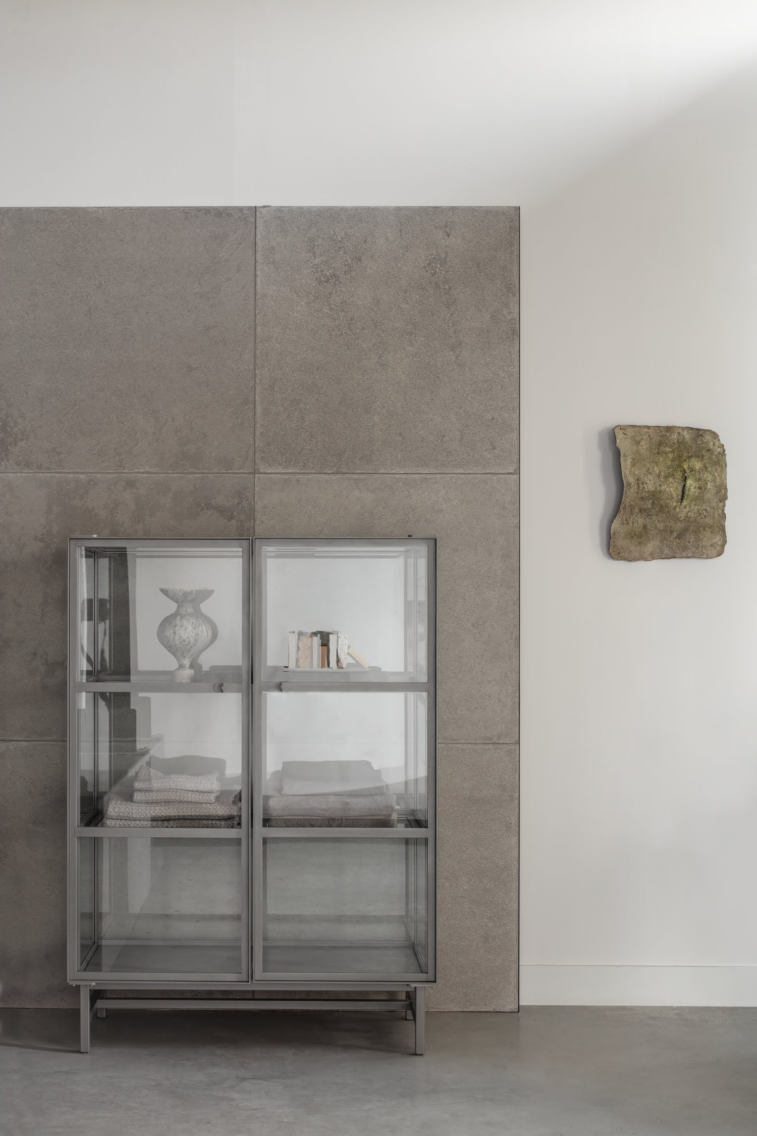 Витрина Finn Cabinet имеет каркас из стали с порошковым покрытием и безопасные стёкла. Двери закрываются с помощью магнита.