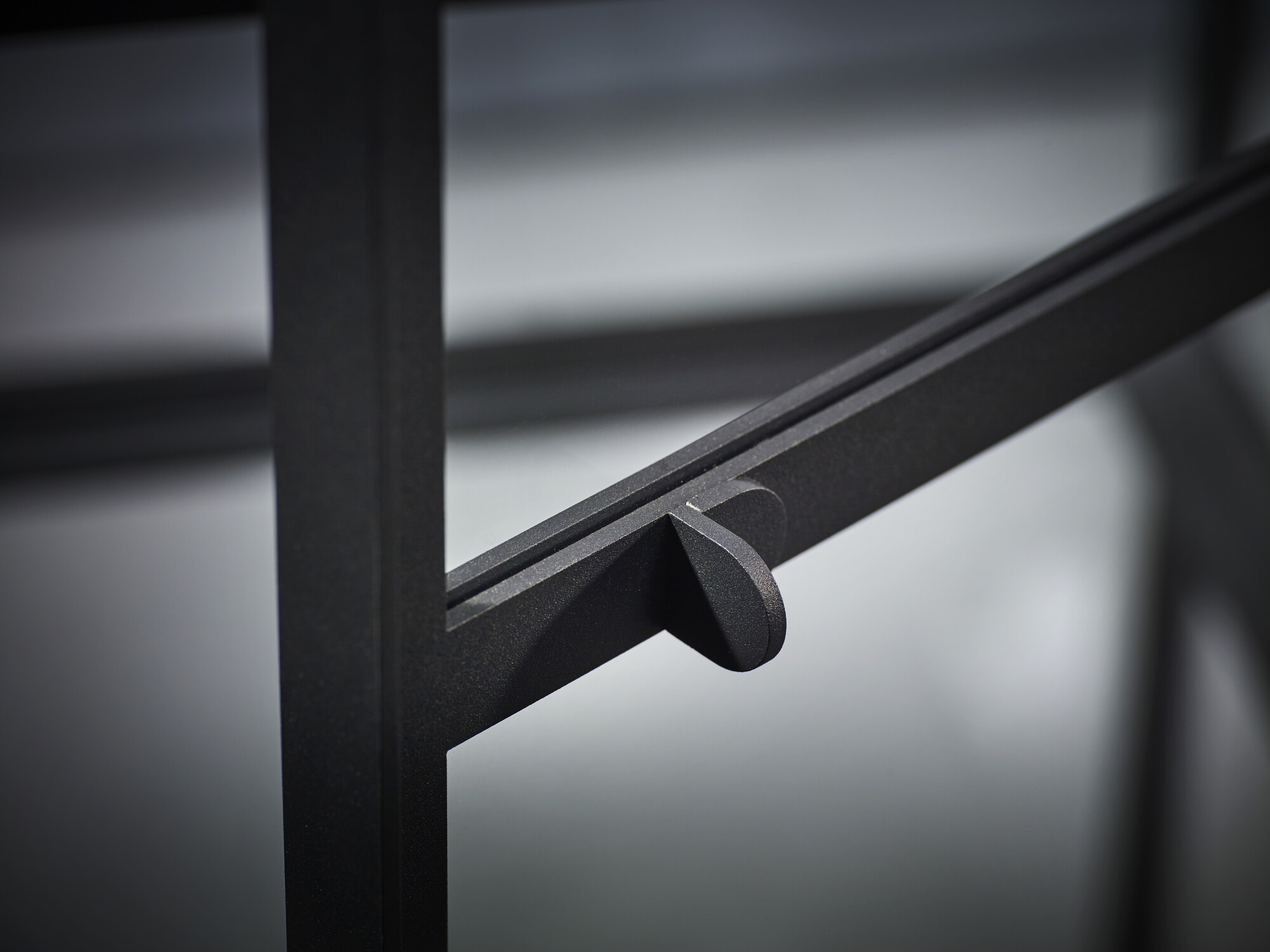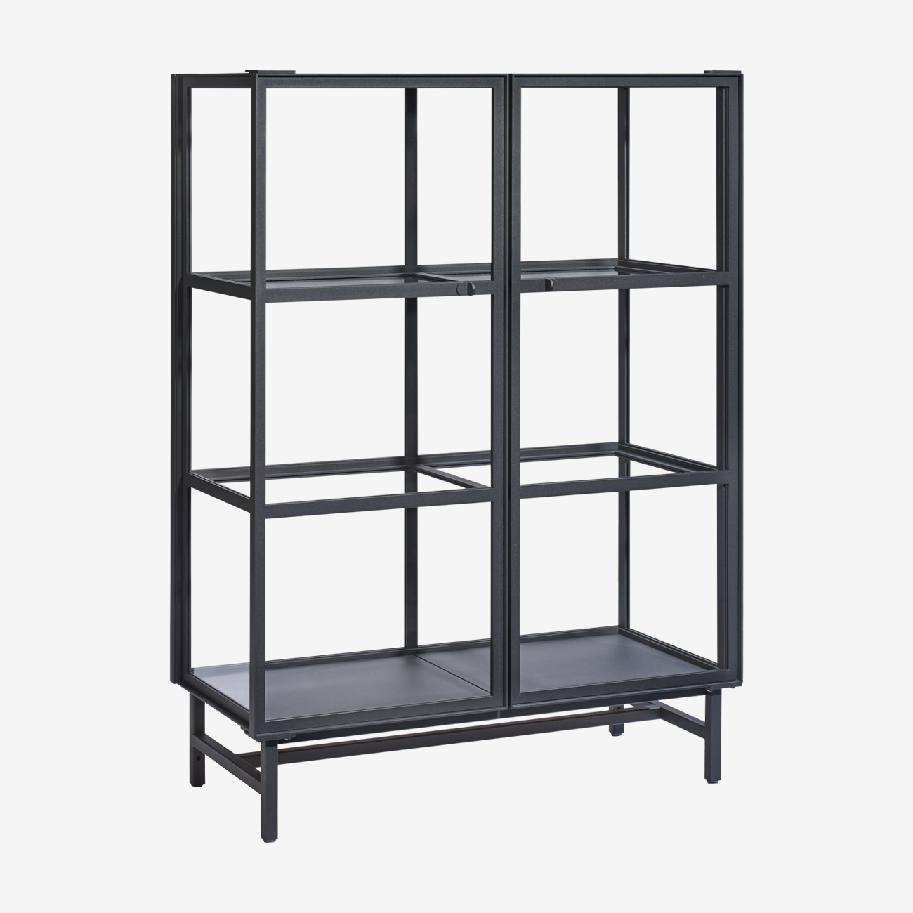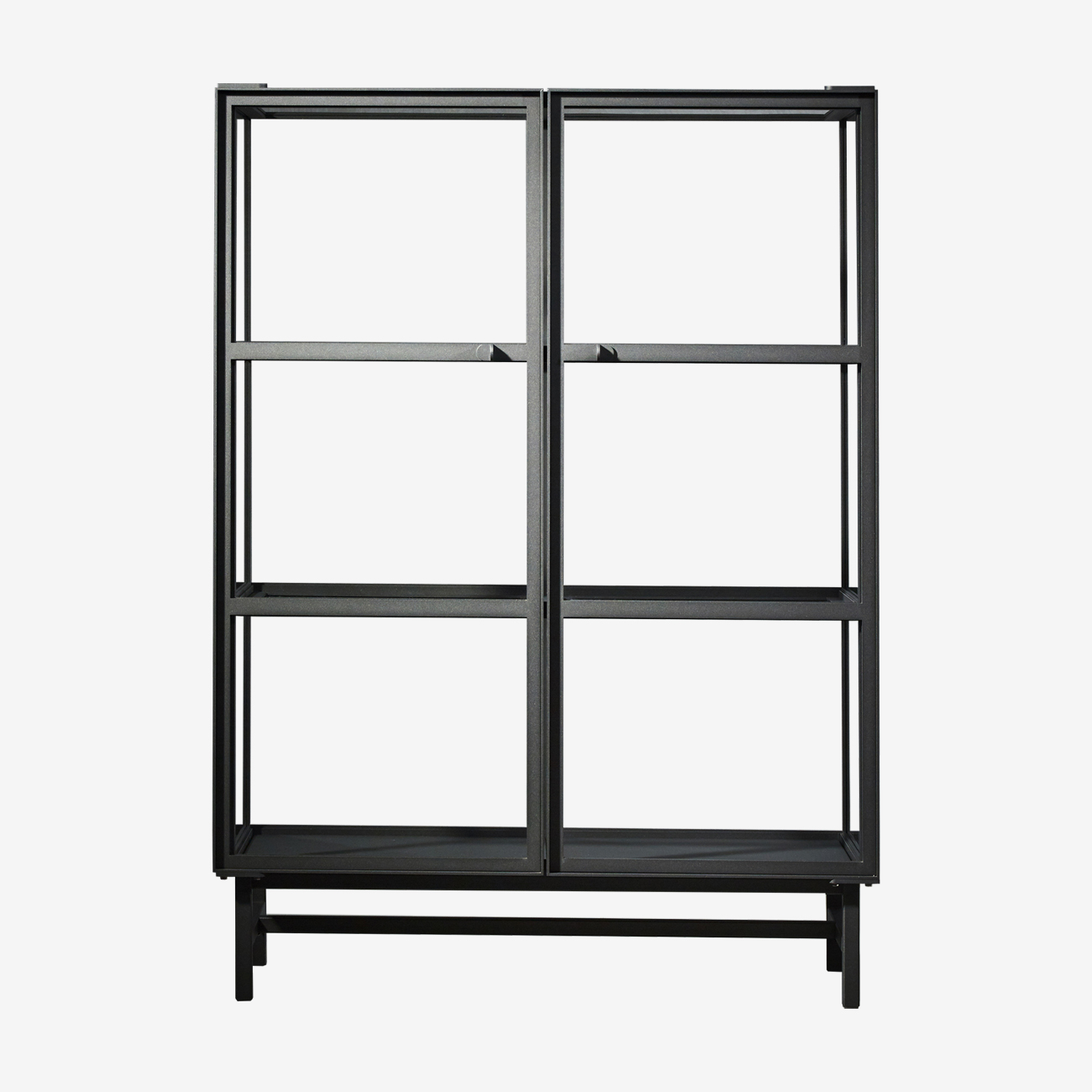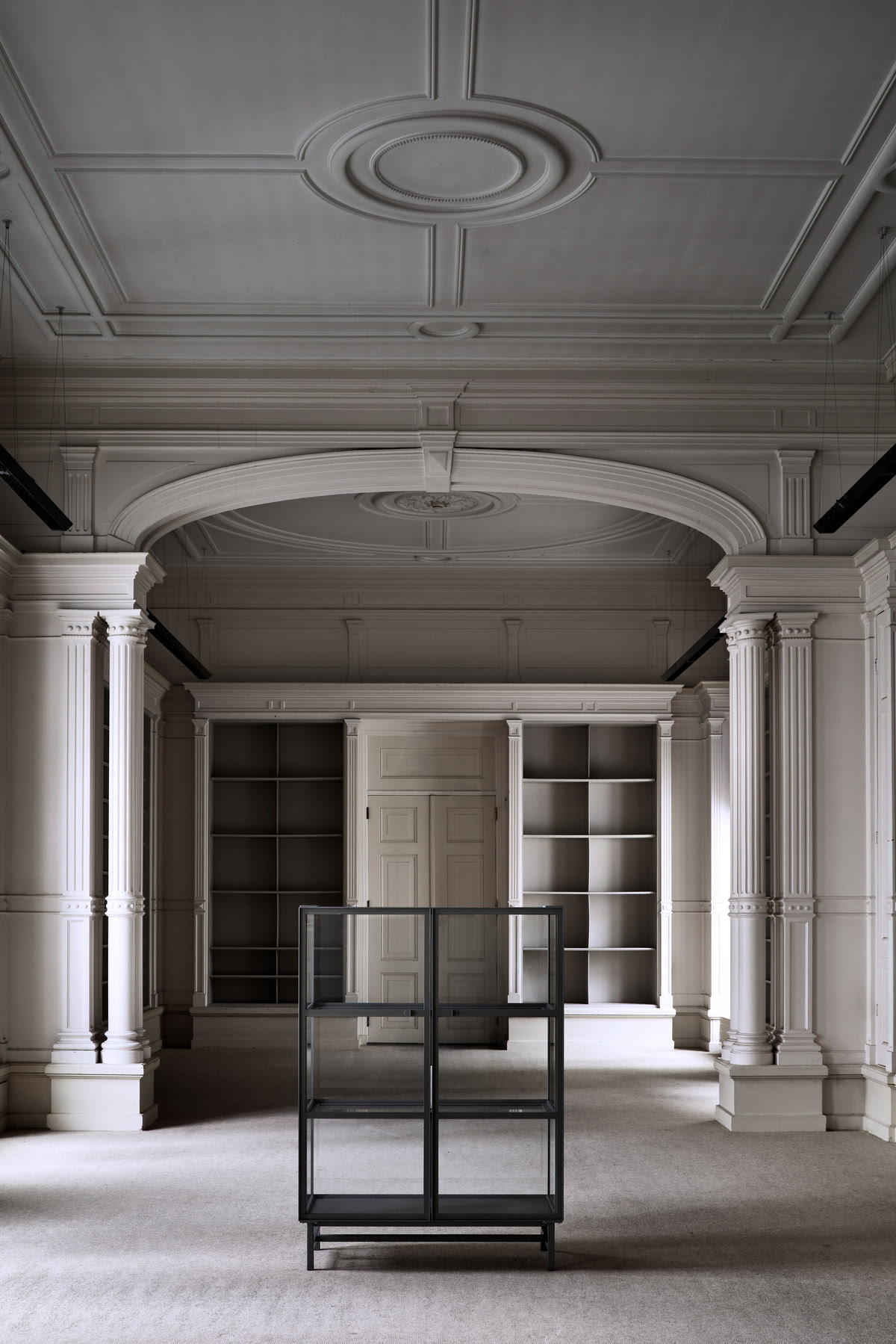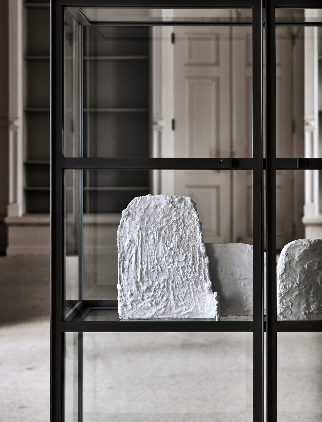 Витрина Finn Cabinet имеет каркас из стали с порошковым покрытием и безопасные стёкла. Двери закрываются с помощью магнита.