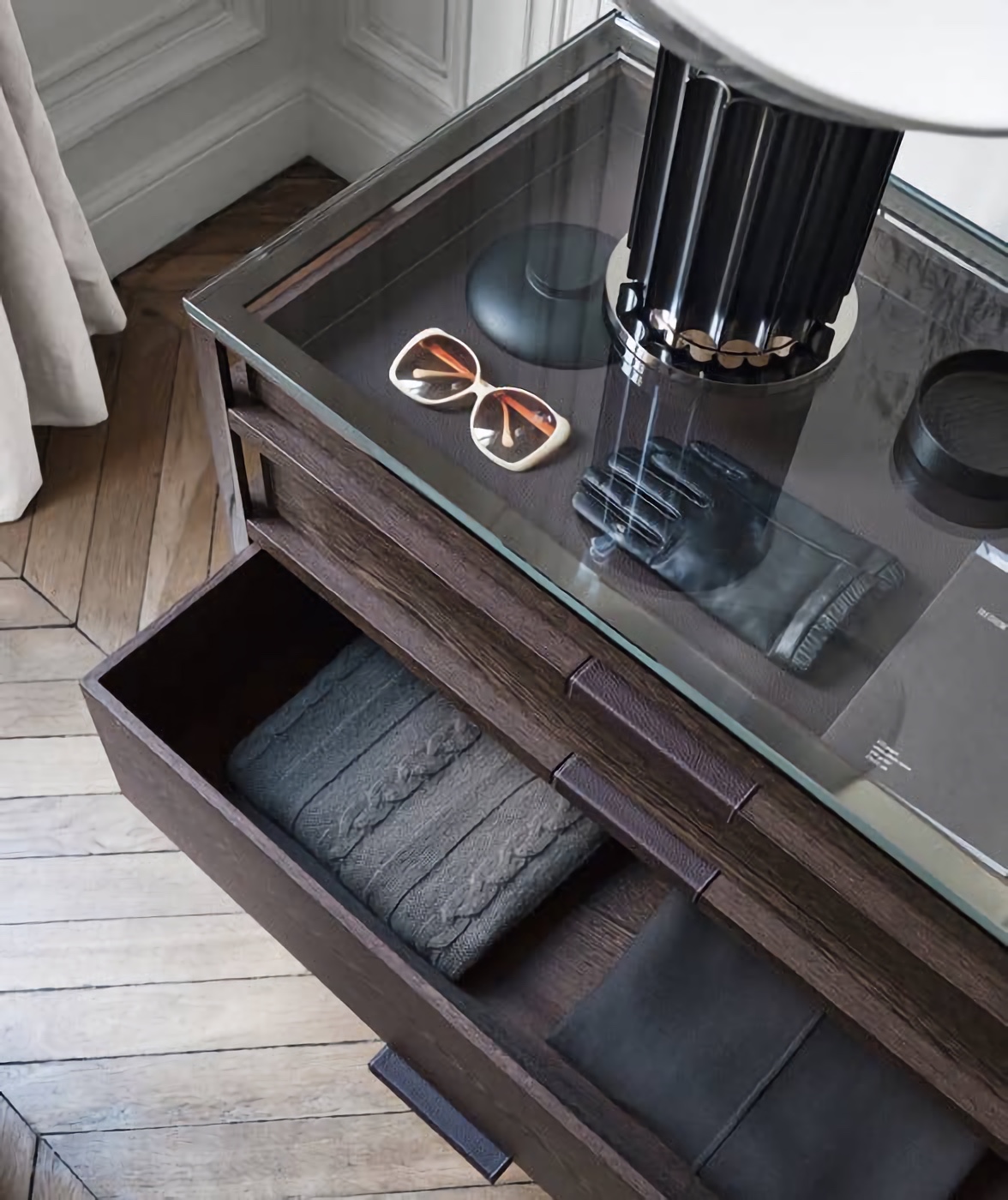 Витрина Maxalto Lithos элегантно продемонстрирует самые ценные предметы декора. Витрина компактного размера имеет небольшую высоту и подходит для размещения не только у стенки, но и в центре комнаты. Выдвижные ящики Lithos обиты роскошной натуральной кожей.