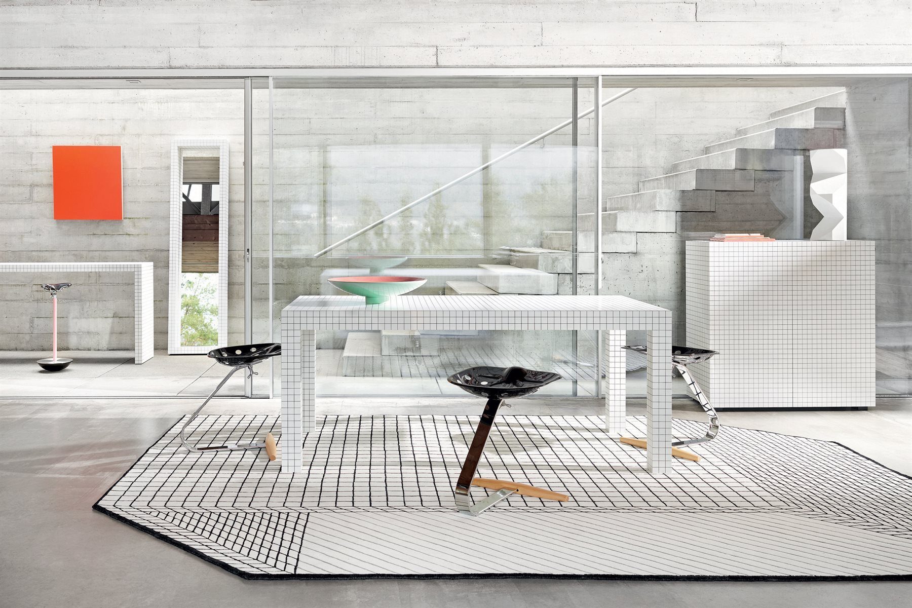 Напольное зеркало Zanotta Quaderna Mirror 476 привнесёт в интерьер строгость и графичность. Зеркало в полный рост обрамляется массивной рамой с принтом в клетку. Зеркальное полотно утопленное внутрь рамы создаёт эффект объёмного окна или портала.