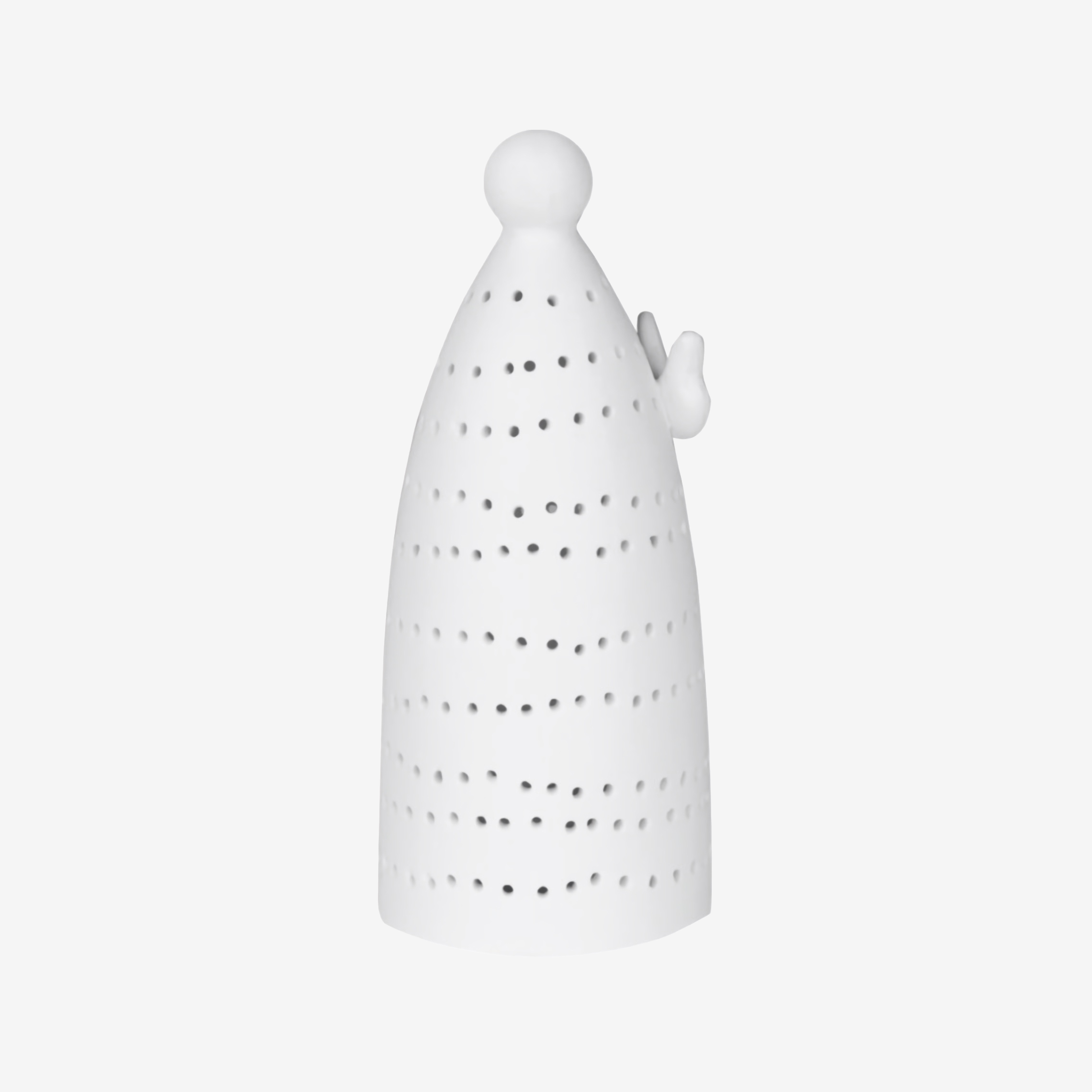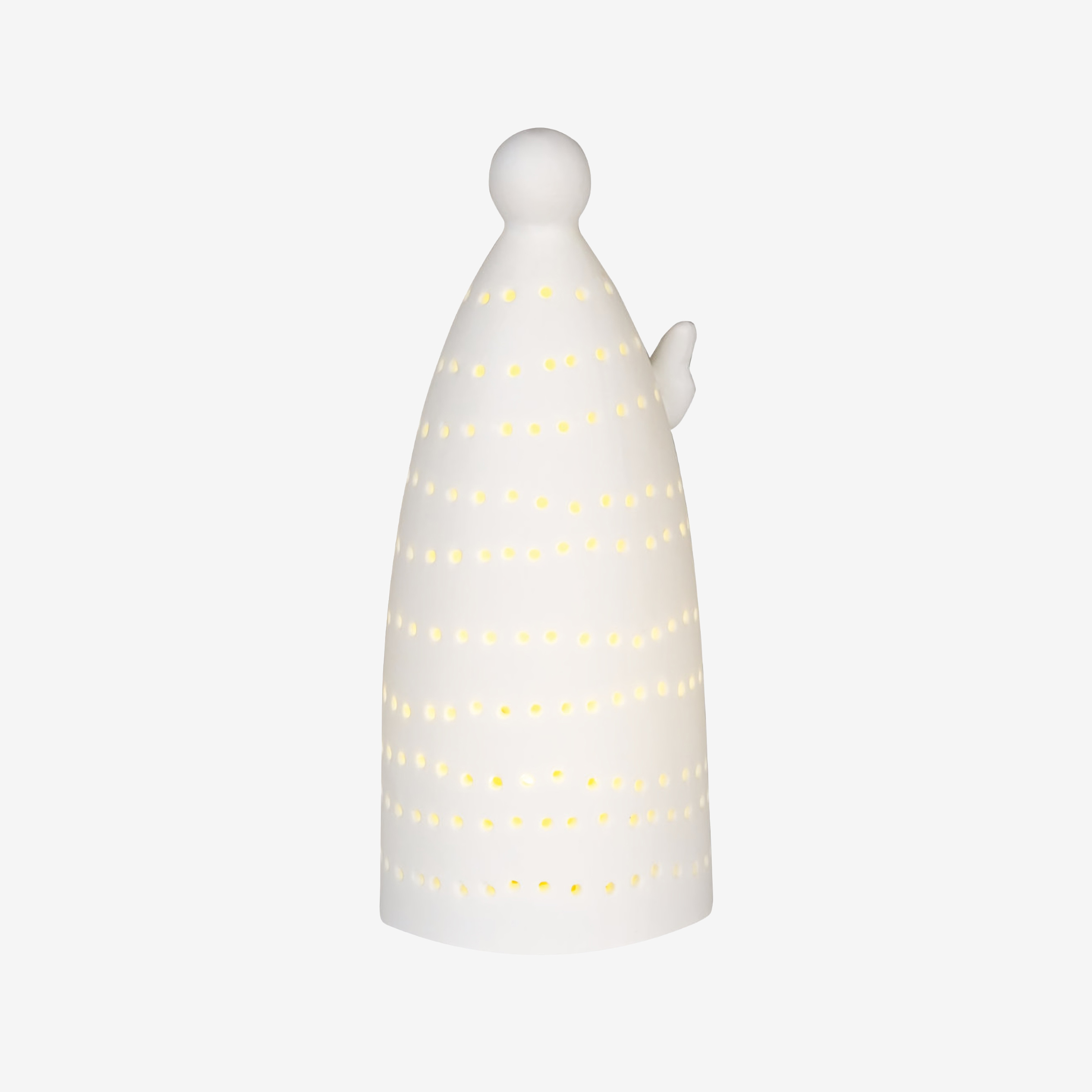 Декоративная статуэтка-светильник Räder Heavenly light — Lines, large — небольшой ангел, выполненный из белоснежного прочного фарфора. Маленькие прорези на поверхности светильника не только выступают в виде элементов декора, но и создают необычные световые узоры при включении лампы. Статуэтка-ангел выполнена в фирменном минималистичном стиле фабрики.