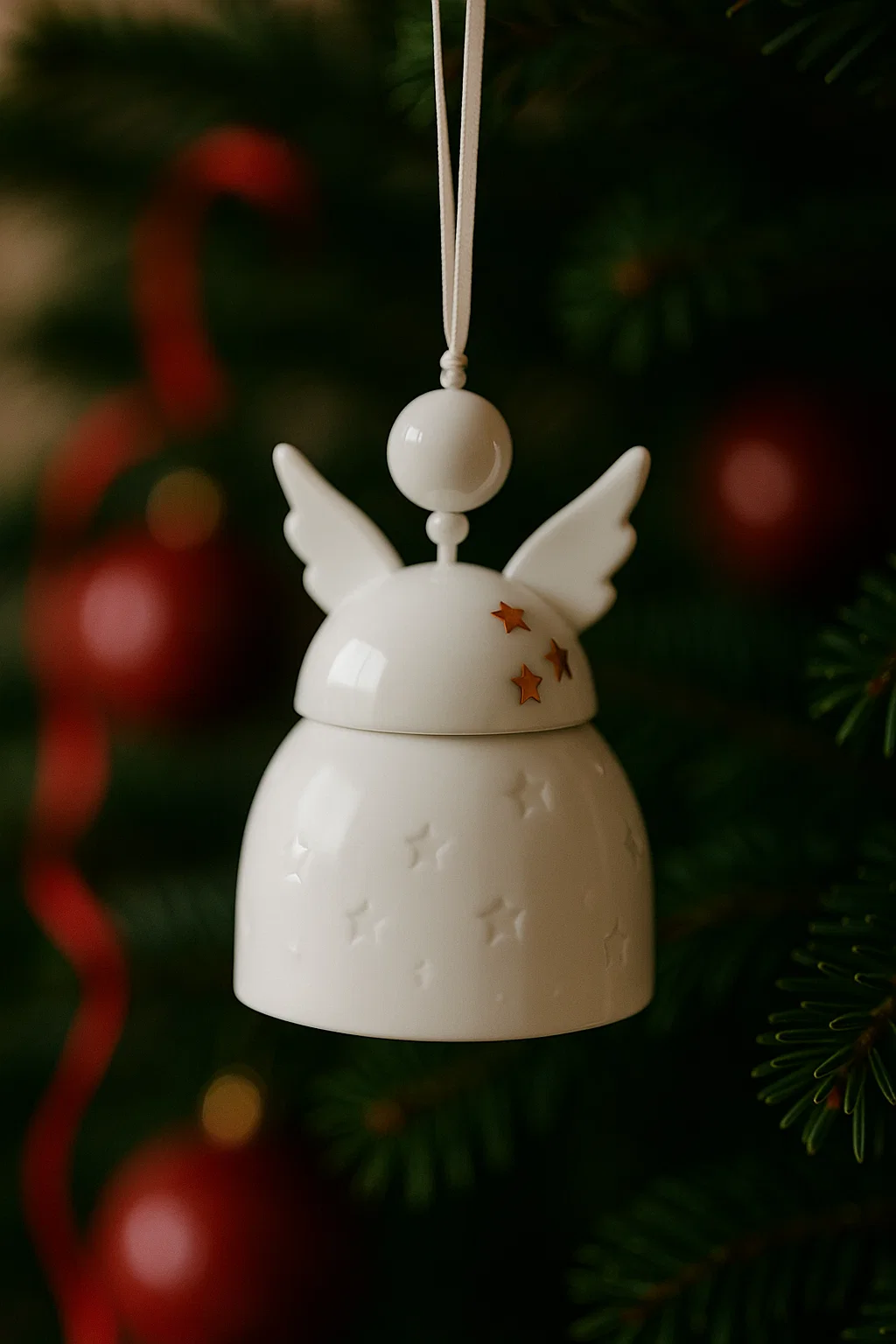 Декоративный подвес-колокольчик Räder Lady Bell hanger — Stars воплощает минималистскую эстетику бренда. Неглазурованный фарфор с бархатистой поверхностью идеально сочетается с лаконичной формой ёлочной игрушки. Корпус подвеса-колокольчика украшен деликатным рельефом и сияющими золотыми звёздами.