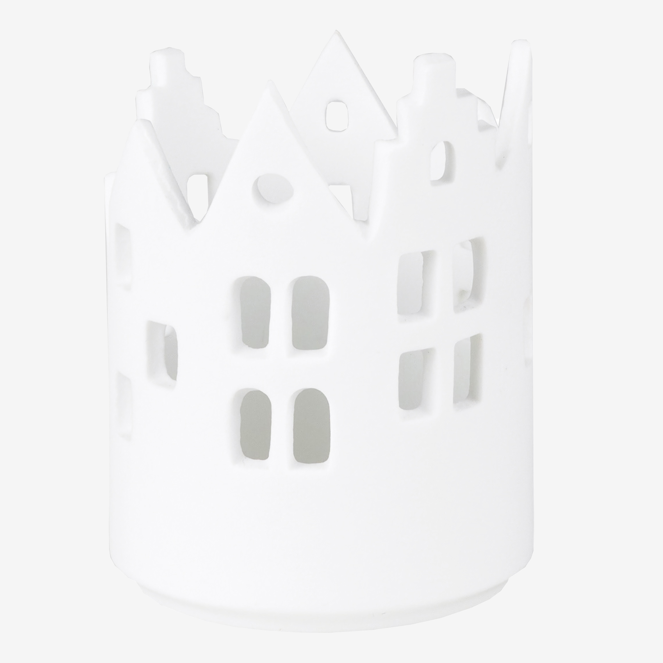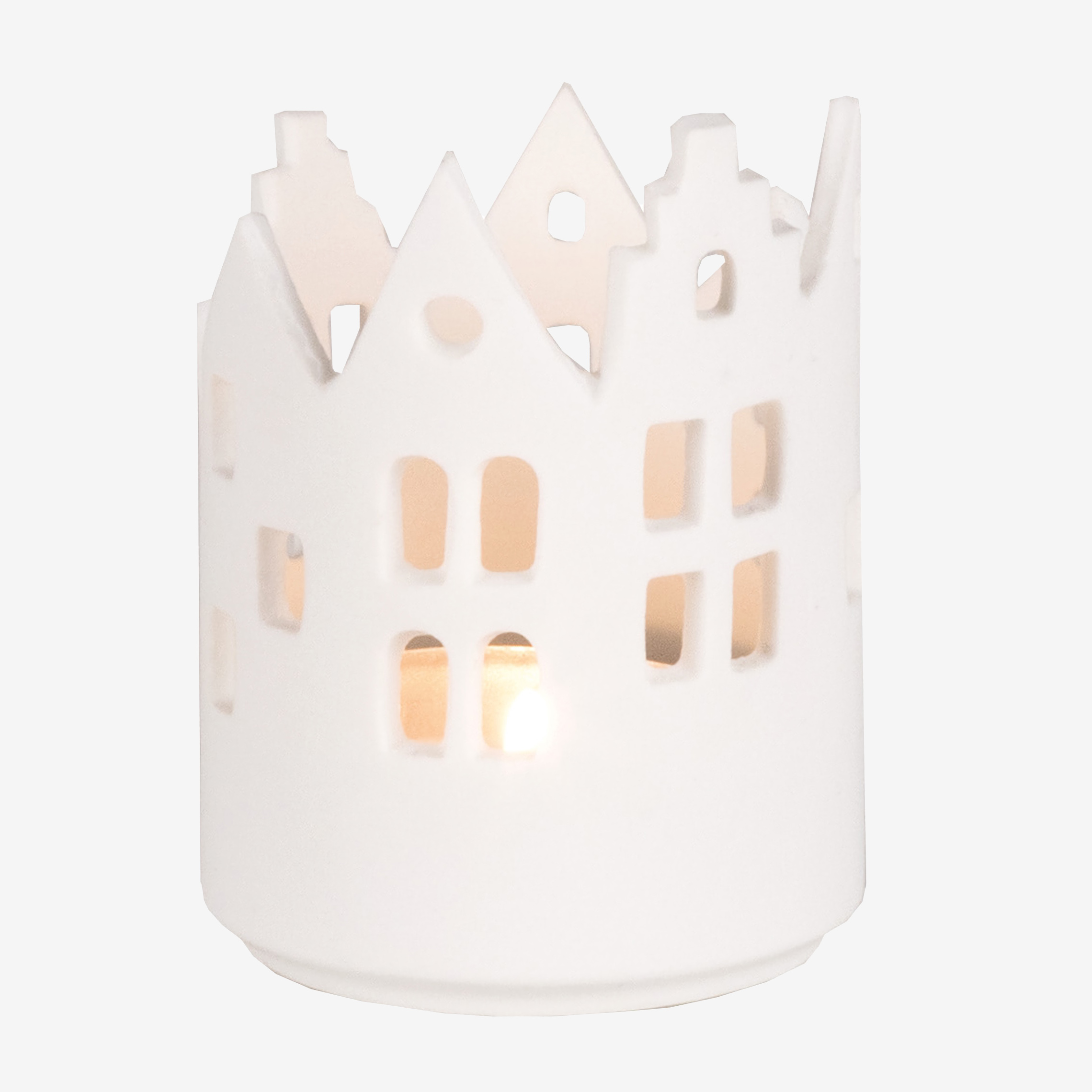 Домик-подсвечник Räder City lights — Inner courtyard — самая компактная модель из коллекции подсвечников City lights. Миниатюрный размер позволяет разместить подсвечник Inner courtyard в самых укромных уголках дома, например, на книжной полке или на подоконнике. Модель выглядит уникально из-за скульптурных краёв, выполненных в форме городских домиков.