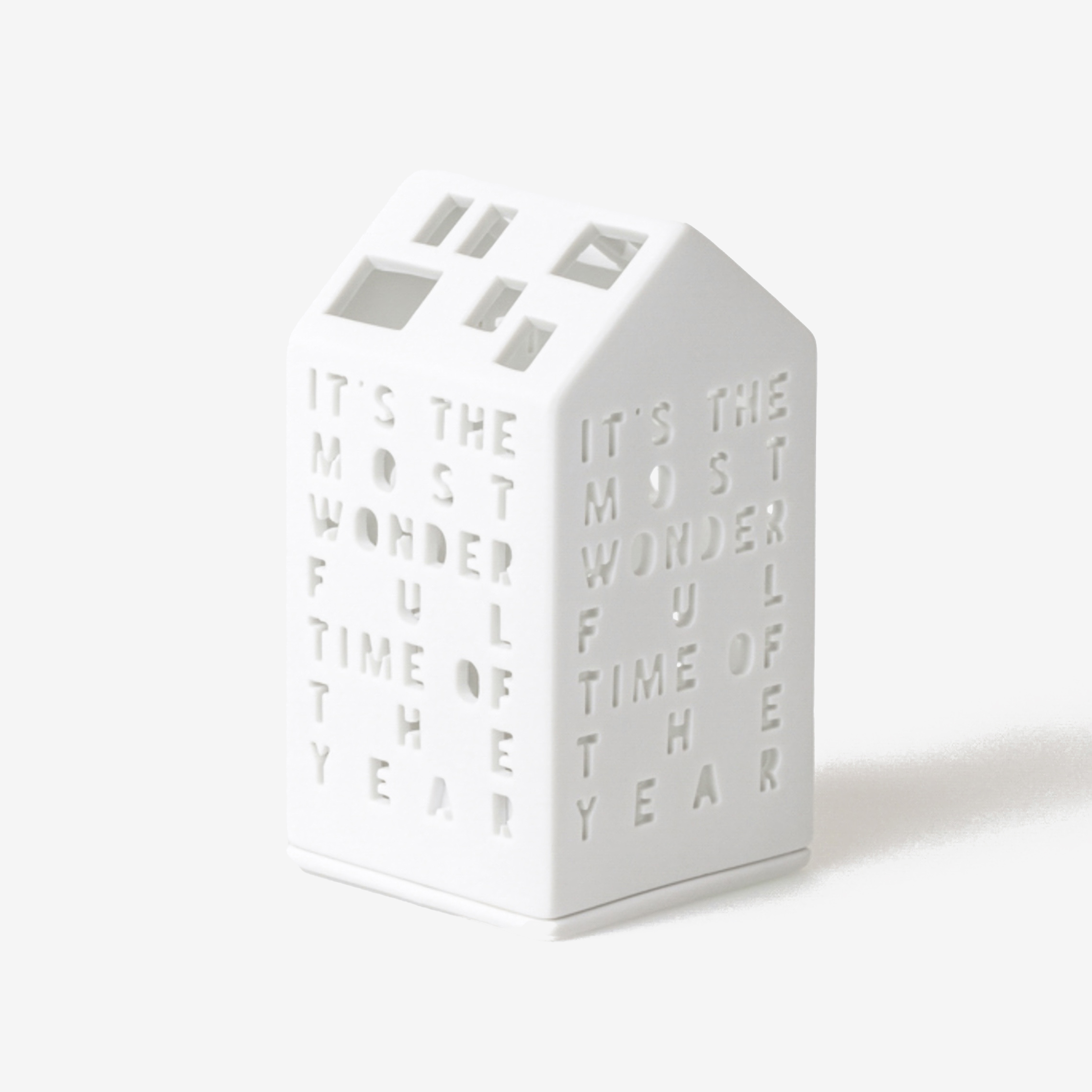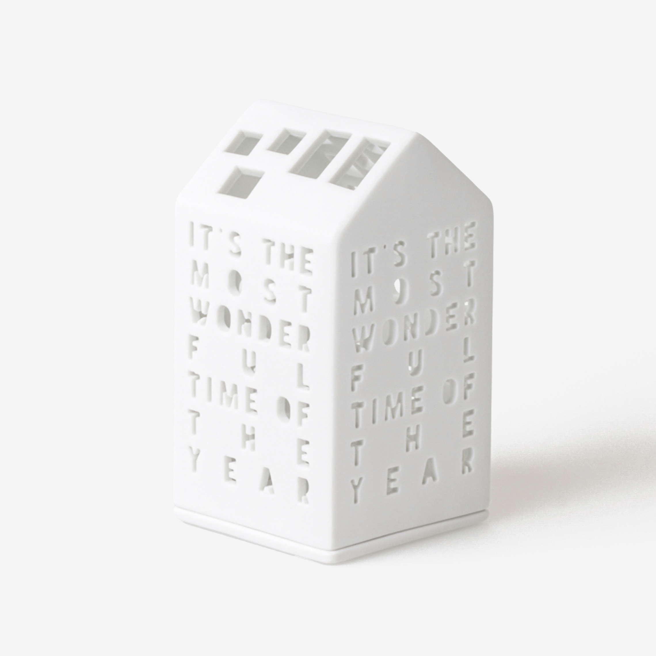 Домик-подсвечник Räder It’s the most wonderful time of the year создаёт атмосферу тихого ожидания Рождества. Лаконичную белую поверхность подсвечника покрывают вдохновляющие надписи. Пламя свечи отражается от прорезных окон и букв на фасадах домика, образуя мягкий световой поток.
