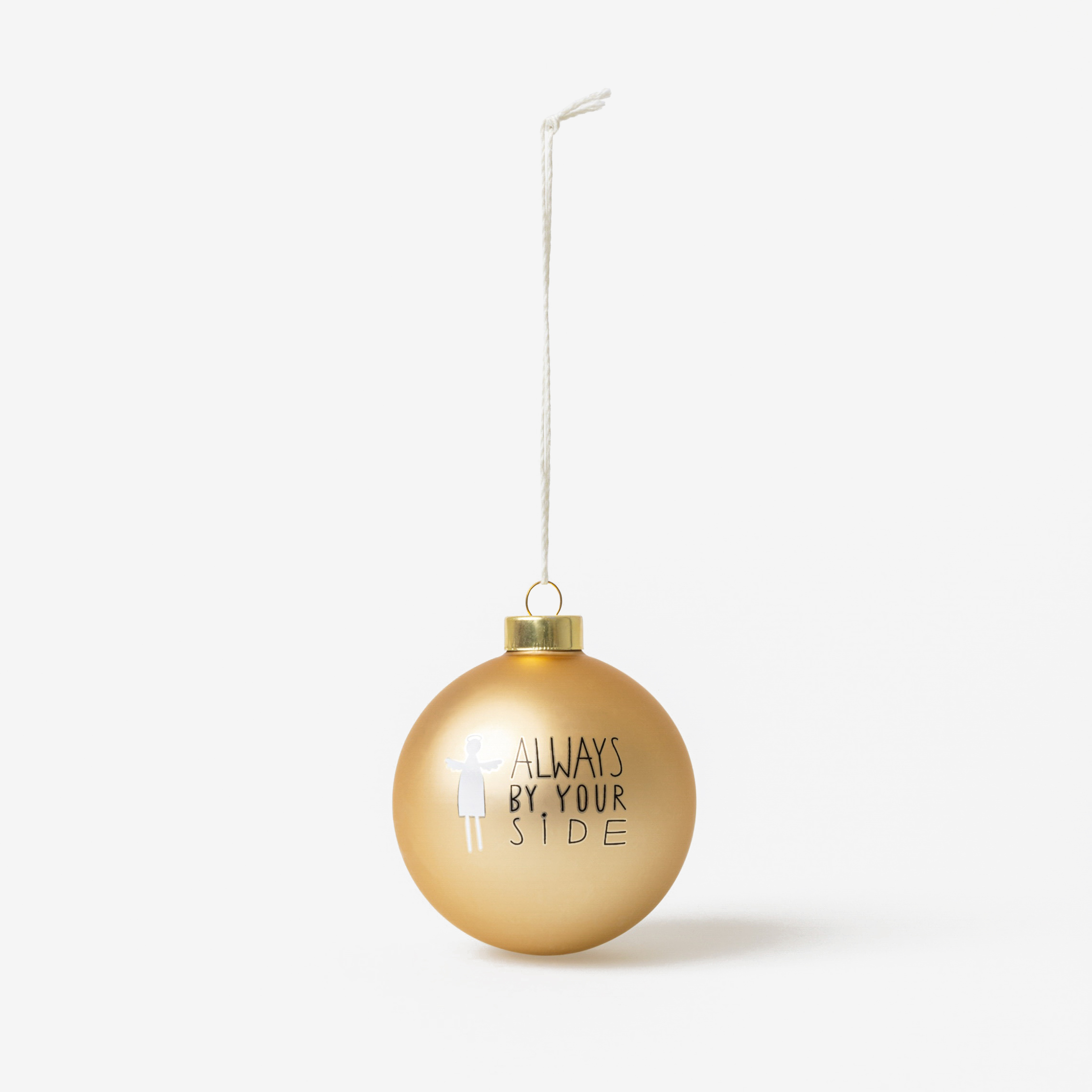 Ёлочная игрушка Räder Always by your Side — компактный декор для новогоднего дерева. Поверхность шара выполнена в праздничном, но не кричащем золотистом оттенке. Стеклянная ёлочная игрушка украшена воодушевляющей надписью.