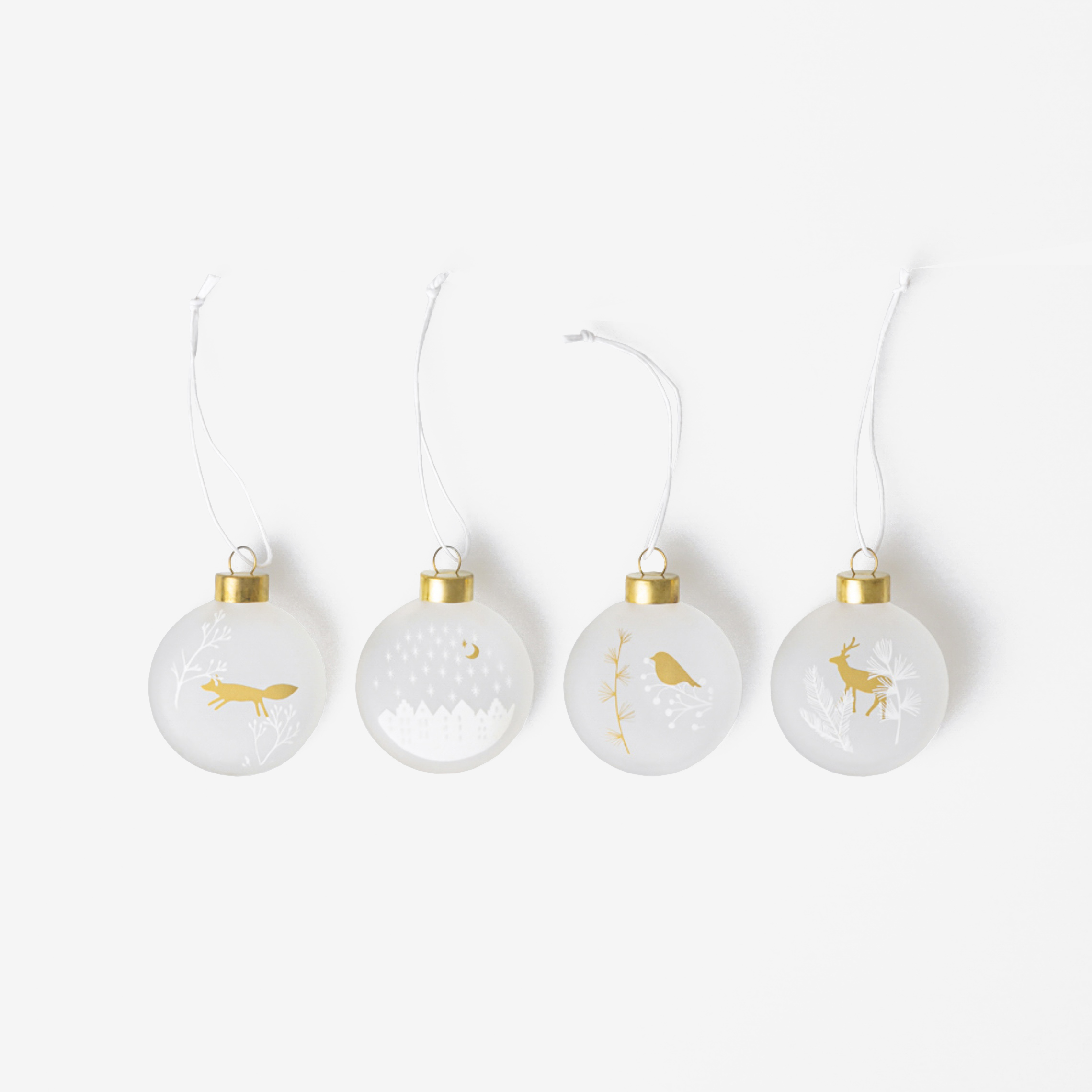 Набор из 4-х ёлочных игрушек Räder Frozen medallion — Set of 4 — миниатюрные произведения искусства, выполненные из тончайшего матированного стекла. На каждом шаре изображён уникальный зимний сюжет. Минималистичные прозрачные игрушки украшены праздничными золотыми элементами.