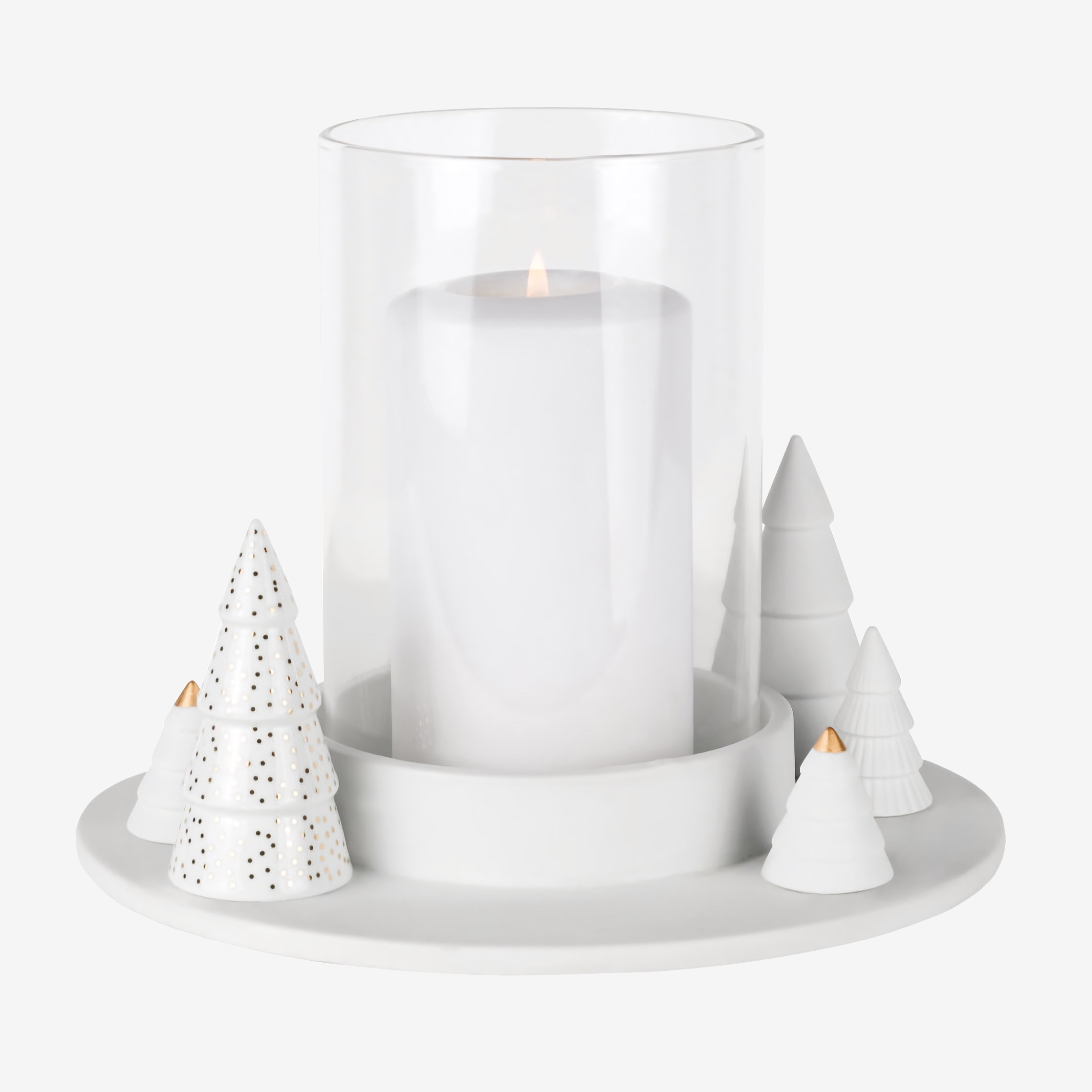 Подсвечник Räder Fir trees — рождественская композиция с высокой степенью детализации. Прозрачное стекло гармонирует с белоснежным фарфором, создавая нежный, но торжественный декоративный предмет. Небольшие ёлочки, расположенные по бокам подсвечника, выглядят акцентно за счёт узоров из золотой деколи.