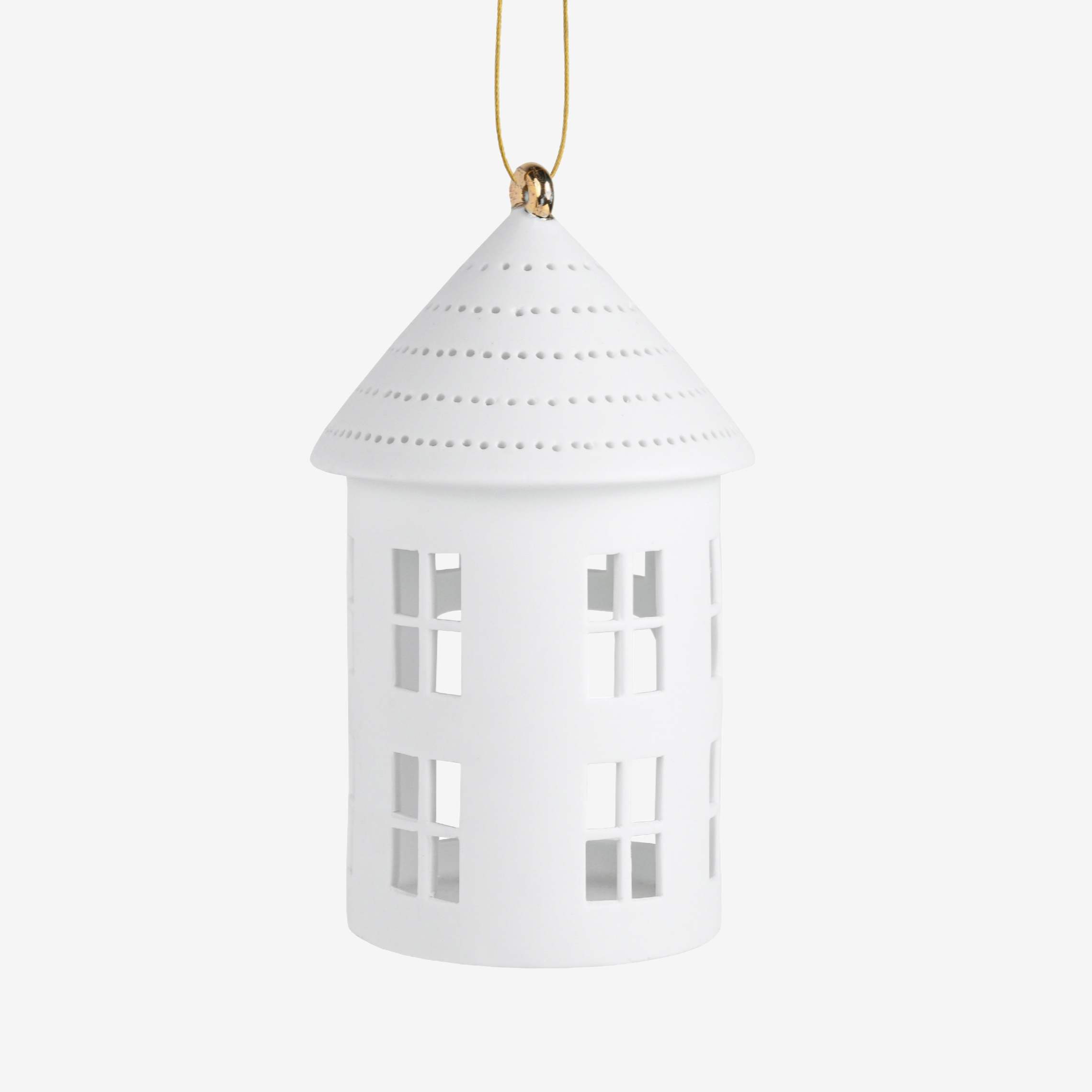 Ёлочная игрушка Räder Light-house — Round, large сочетает мягкий округлый силуэт и минималистскую эстетику бренда. Резные окна домика мягко отражают свет ёлочных гирлянд и выполняют роль точечных декоративных акцентов. Игрушка гармонично смотрится рядом с белоснежными украшениями фабрики Räder.