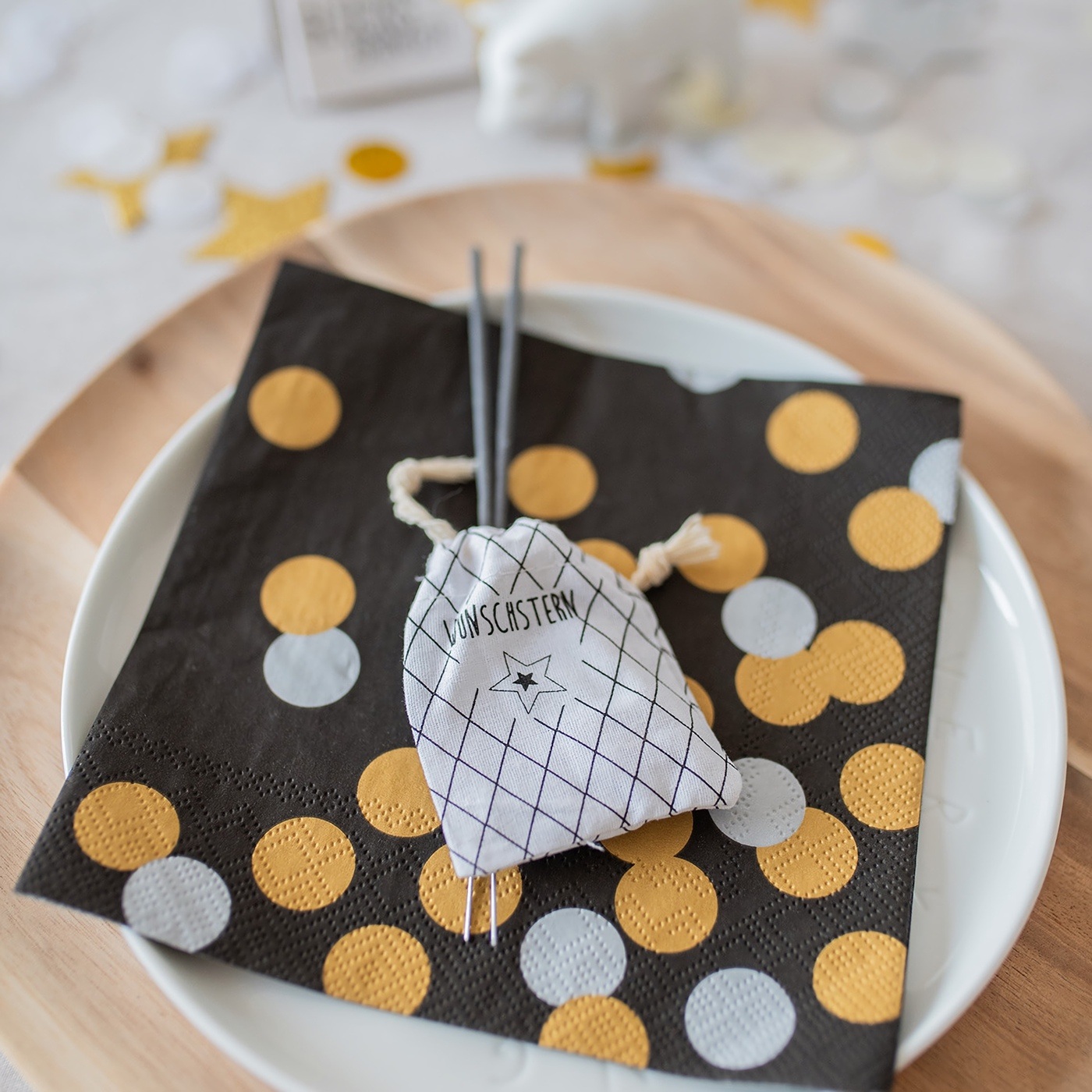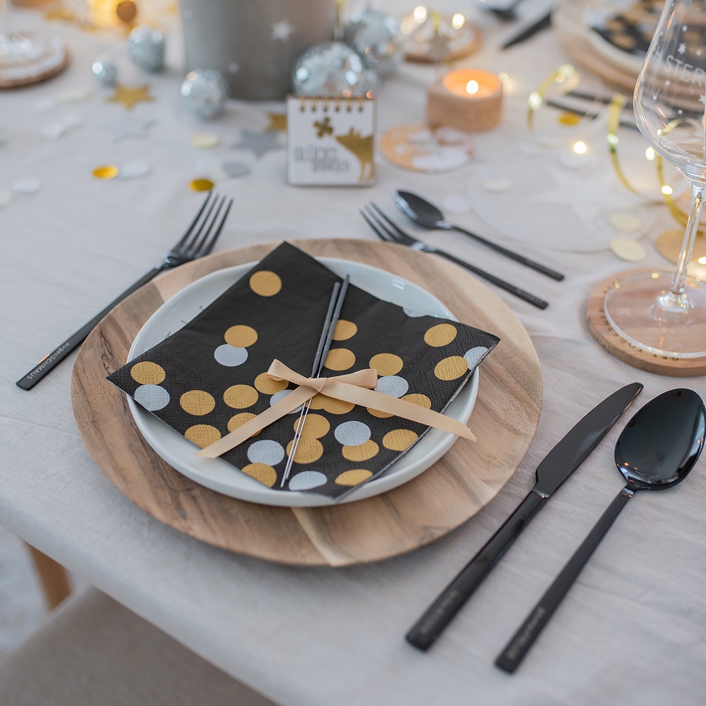 Набор бумажных салфеток Räder Polka dots придаст сервировке праздничный блеск. На элегантную чёрную поверхность салфеток нанесены яркие мерцающие круги золотого и серебряного оттенков. Трехслойная структура изделий обеспечивает высокую впитываемость.