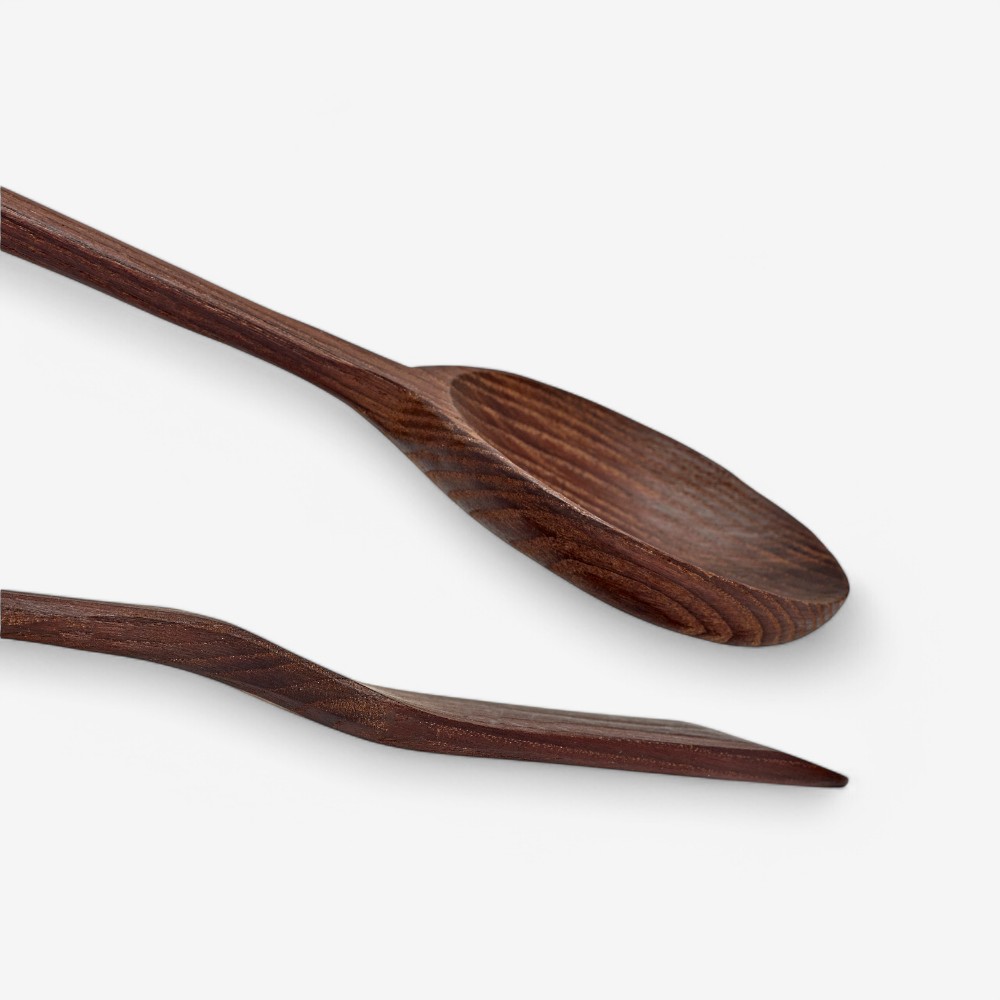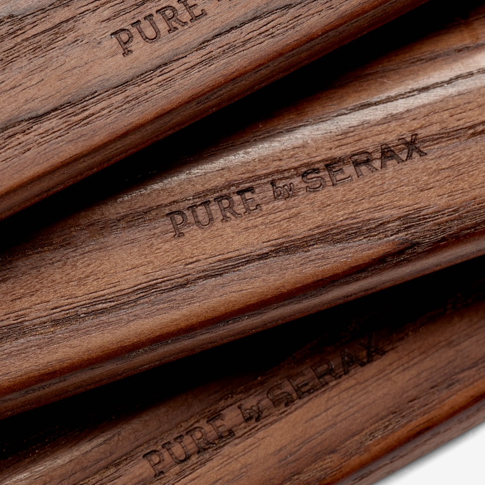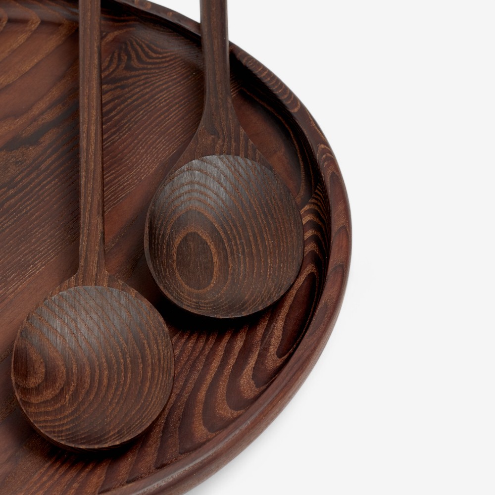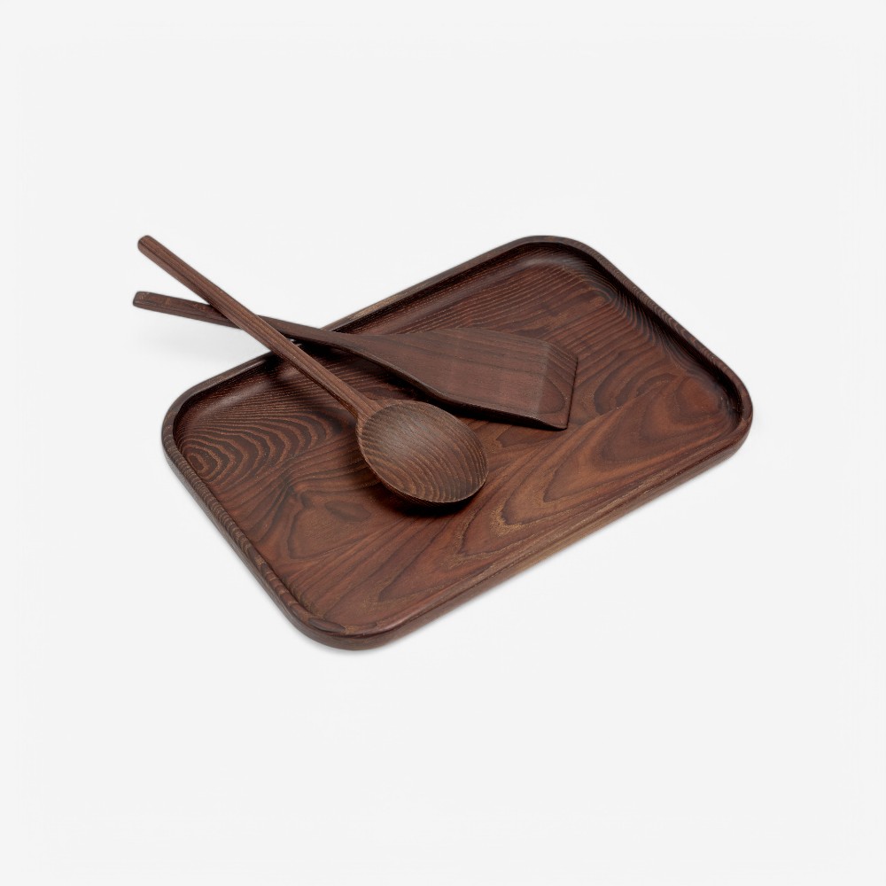 Набор кухонных принадлежностей из 5 предметов Kitchen Utensils Set 5 Pure, созданный в коллаборации с бельгийским дизайнером Pascale Naessens, можно использовать по назначению и для декоративной подачи блюд. В набор входят три лопаточки и две ложки из карбонизированного ясеня тёмно-коричневого оттенка.