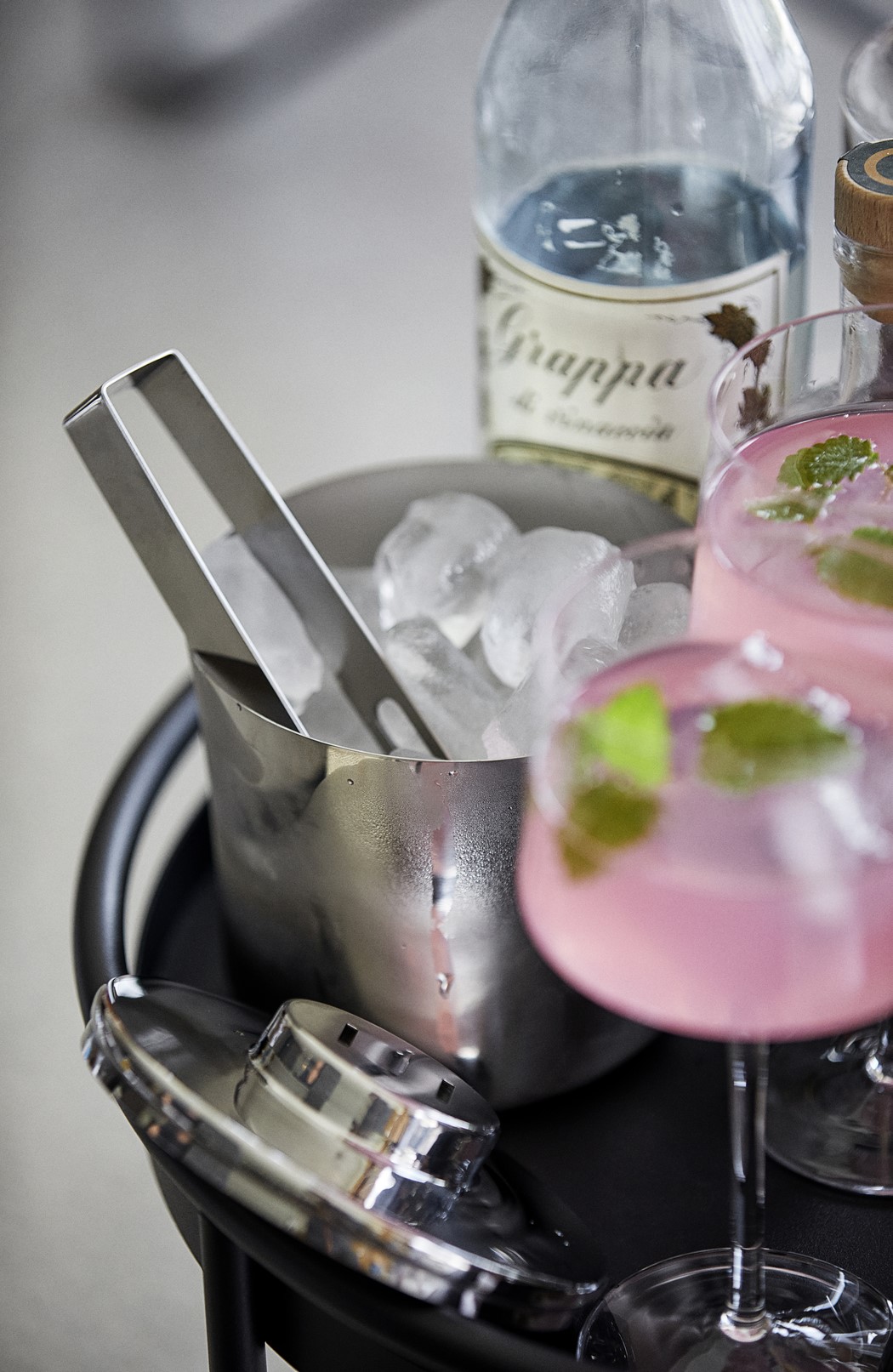 Ведёрко для льда с крышкой и щипками Rocks сделано из полированной нержавеющей стали.
