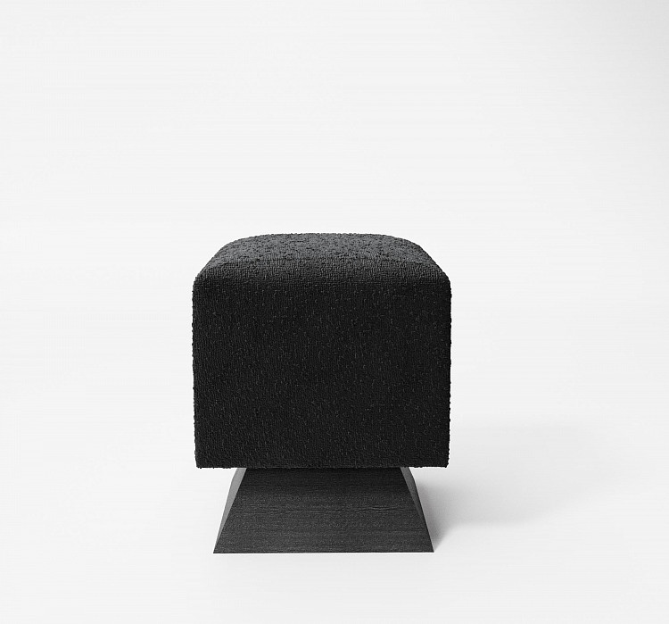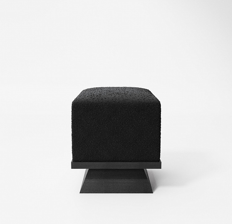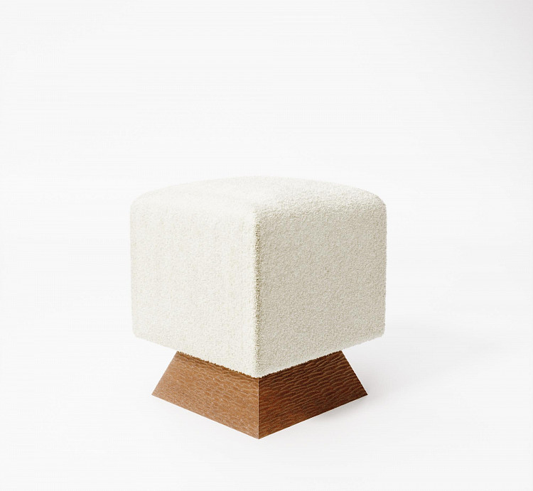 Пуф Modénature Alfie Pouf от Olga Silanteva представляет собой квадратный модуль с мягкой подушкой и массивным деревянным основанием. Основание имеет трапециевидный профиль и может быть гладким или с рельефной фактурой. В одной из версий между подушкой и основной опорой добавлена тонкая деревянная окантовка. Обивка выполнена из плотной ткани в темном или светлом оттенке.