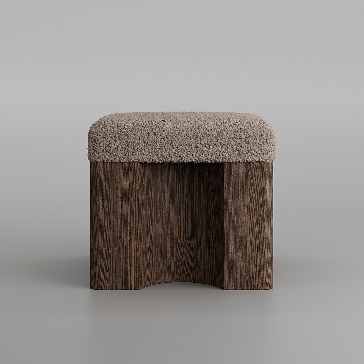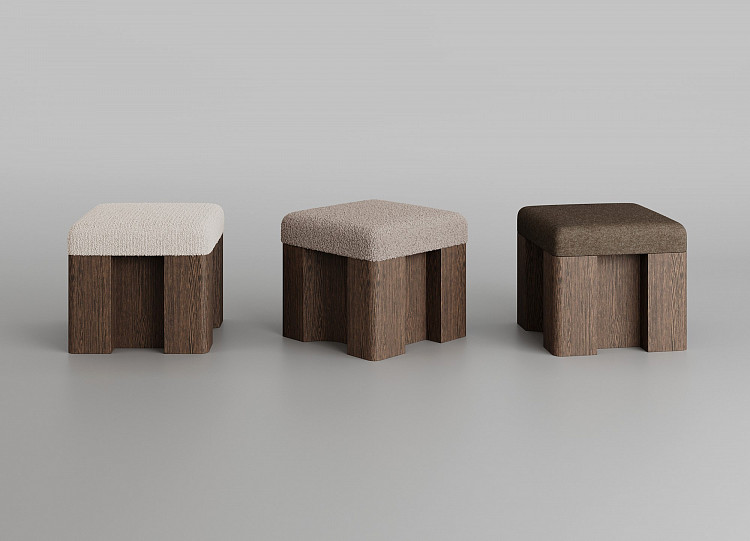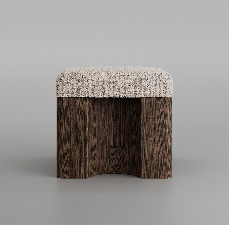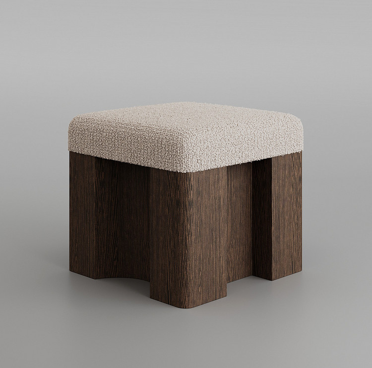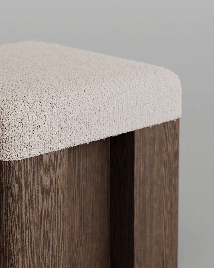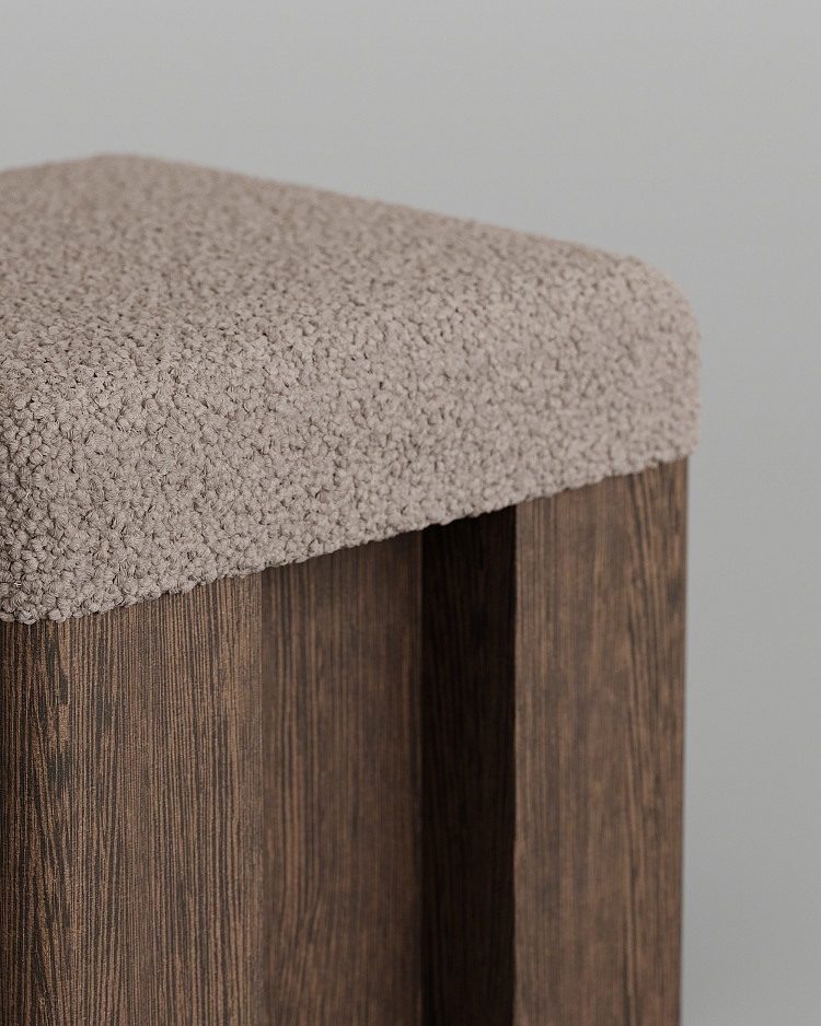 Пуф Modénature Cuuppa Pouf #1 от Daria Zakharian напоминает высокий табурет. Он состоит из мягкого верха и жесткого низа. Низ — это тяжелое основание из темного дерева с декоративной обработкой боковин. Верх — это цельная высокая подушка. Она имеет плавные очертания и покрыта фактурной тканью.