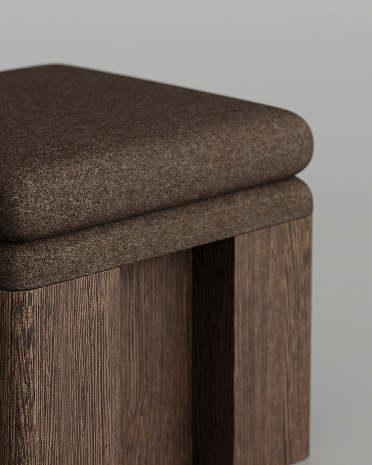 Пуф Modénature Cuuppa Pouf #2 от Daria Zakharian — это вариация первой модели. Как и она, пуф напоминает высокий табурет с тяжелым основанием из темного дерева. Отличие — в форме подушки. Здесь она не цельная, а собрана из двух отдельных мягких объемов. Они образуют ступенчатую композицию и покрыты фактурной тканью.