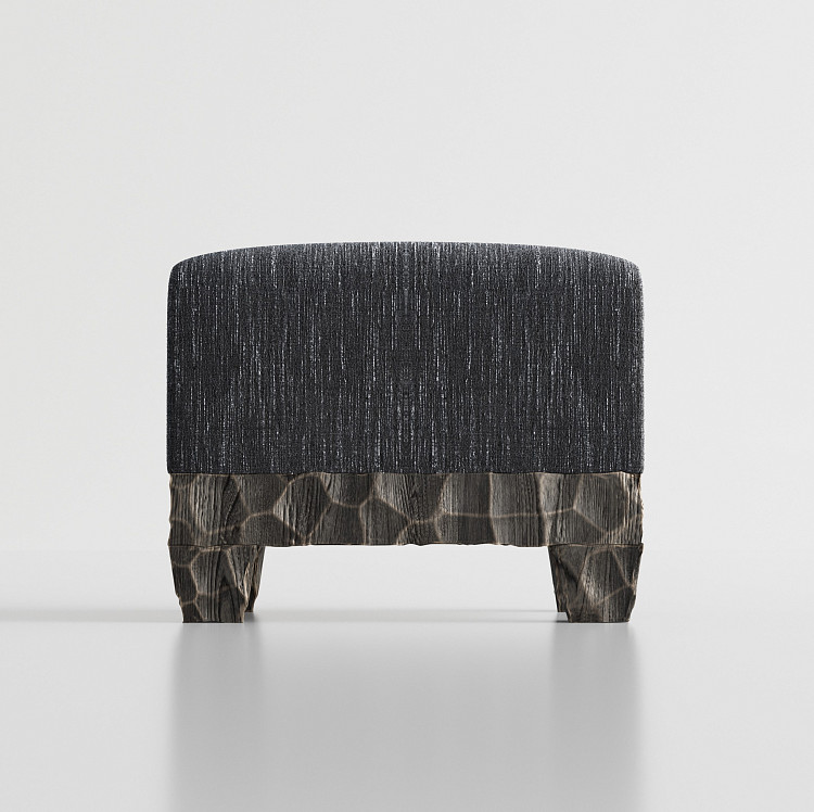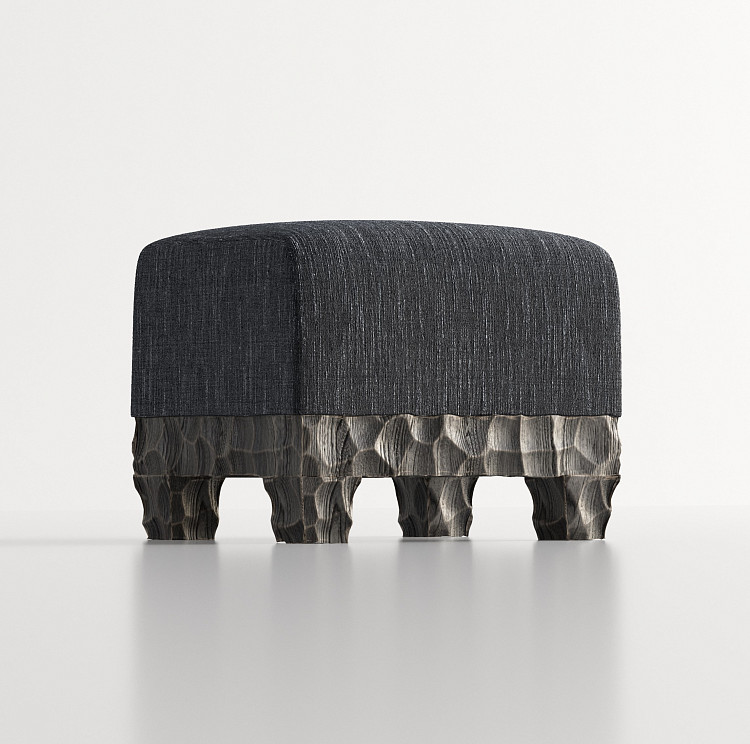 Композицию пуфа Modénature Megeve Pouf от Gaetan D Hotel создает сочетание мягкого верха и фактурного низа, что типично для коллекции Megeve. Низ — это квадратное основание с волнообразным узором на дереве. Верх — квадратная подушка в темной обивке. Четыре невысокие ножки продолжают общий рельеф.