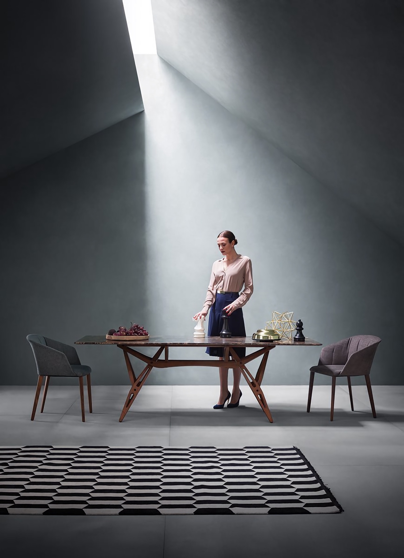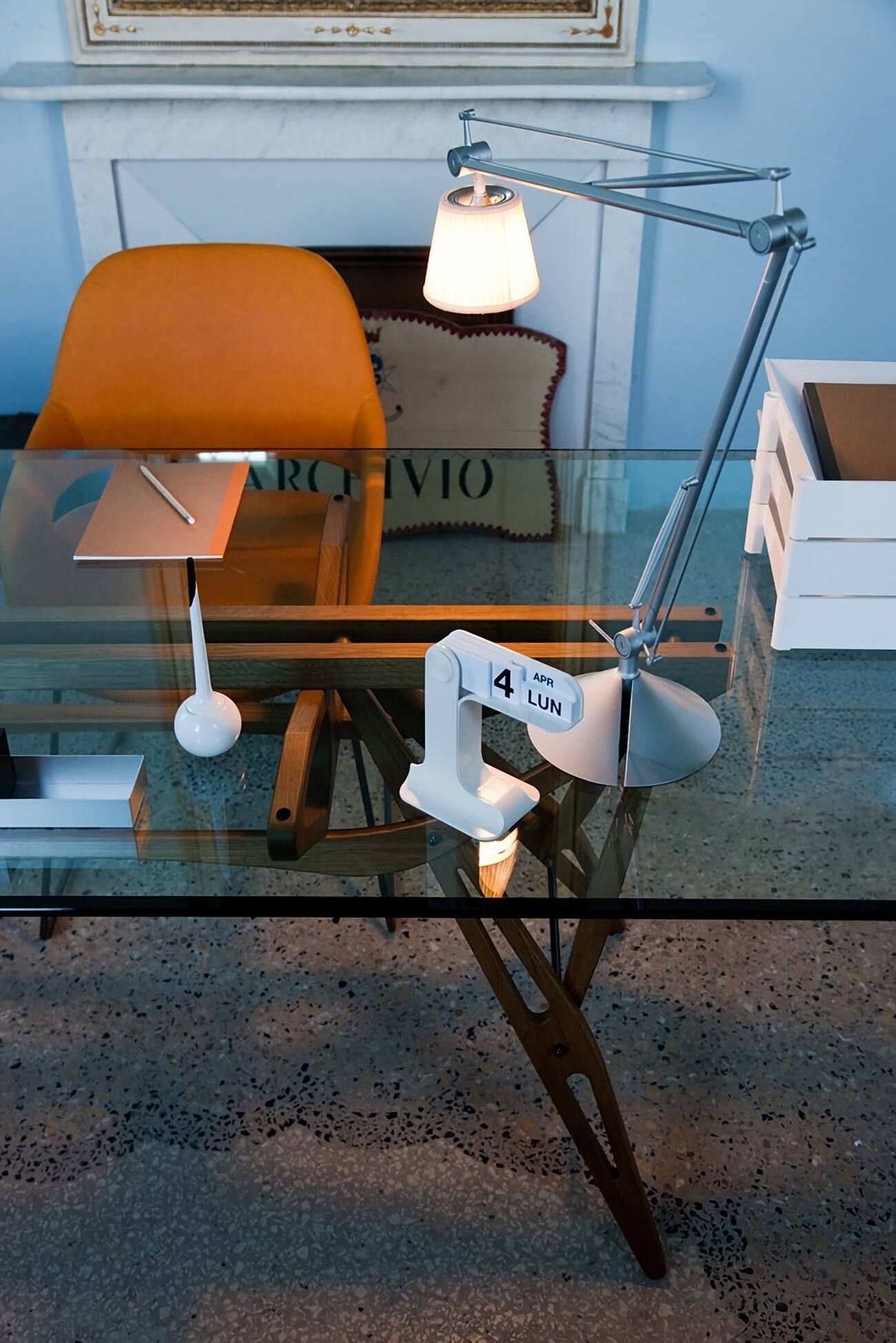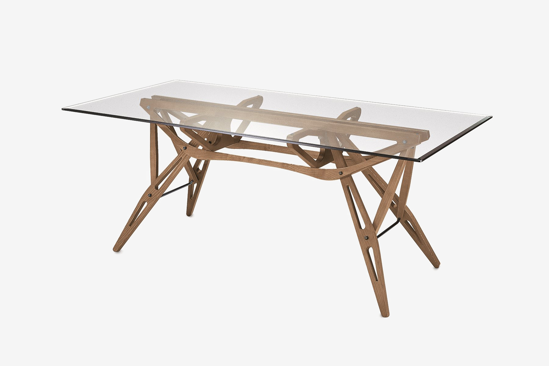 Обеденный стол Zanotta Reale воплотил в своём дизайне страсть к аэродинамике и сложным конструкциям, напоминающим каркасы старинных самолётов. Деревянное основание стола представляет собой сложнейшее переплетение наклонных опор и растяжек. Прозрачная стеклянная столешница позволяет беспрепятственно любоваться виртуозной столярной конструкцией, при этом выступая в качестве удобной рабочей поверхности.