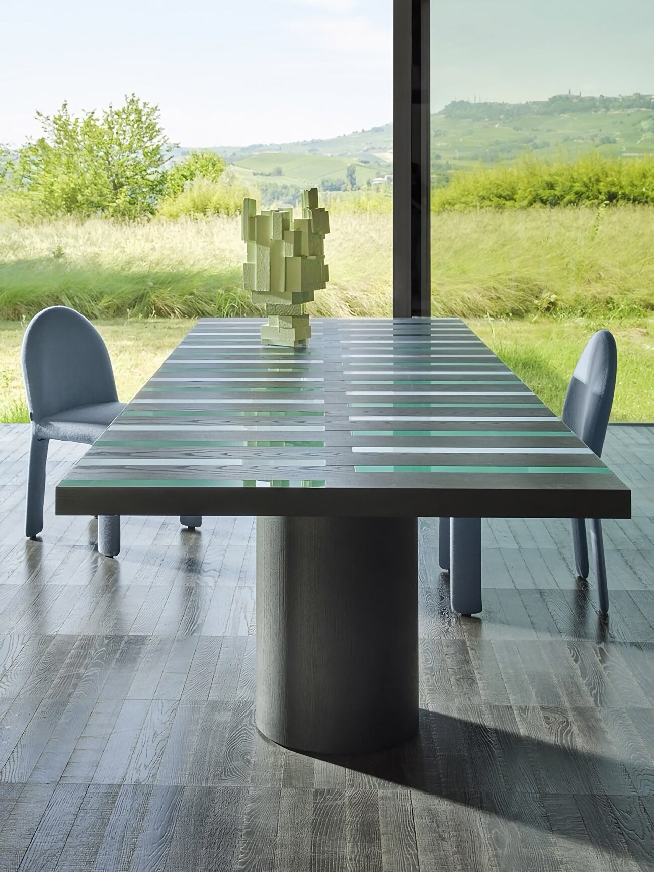Дизайн обеденного стола Zanotta Riga-Riga строится на ритмичной игре линий. Строгое основание из древесины поддерживает тонкую столешницу модели, создавая силуэт, который кажется одновременно массивным и лёгким. Riga-Riga остаётся максимально функциональным, но при этом изысканным визуальным акцентом пространства.