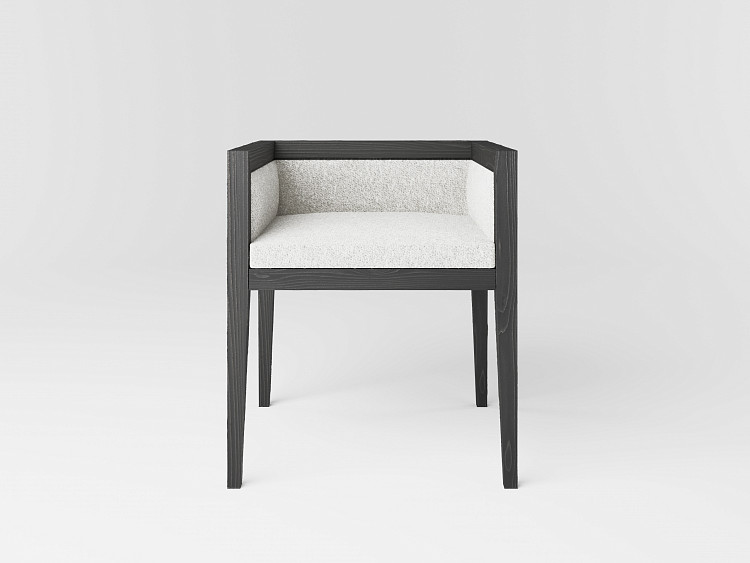 Стул Modénature Hug Bridge Chair — конструкция в виде высокого прямоугольного короба с открытой передней частью. Боковые панели одновременно служат подлокотниками и спинкой. Сиденье глубокое, полностью занимает внутреннее пространство. Ножки сужаются книзу, создавая визуальную легкость.