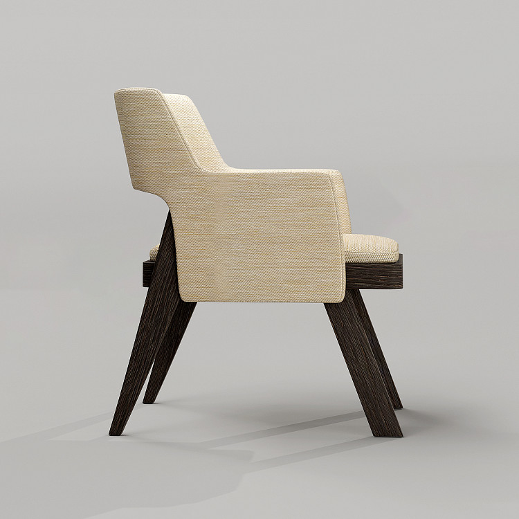 Стул Modénature Jann Chair от Alexandra Lykova. Модель с наклонными задними ножками и массивным деревянным основанием. Спинка и подлокотники образуют единый мягкий объем. Сиденье прямоугольное, со скругленными углами. Конструкция выглядит одновременно легкой и устойчивой.