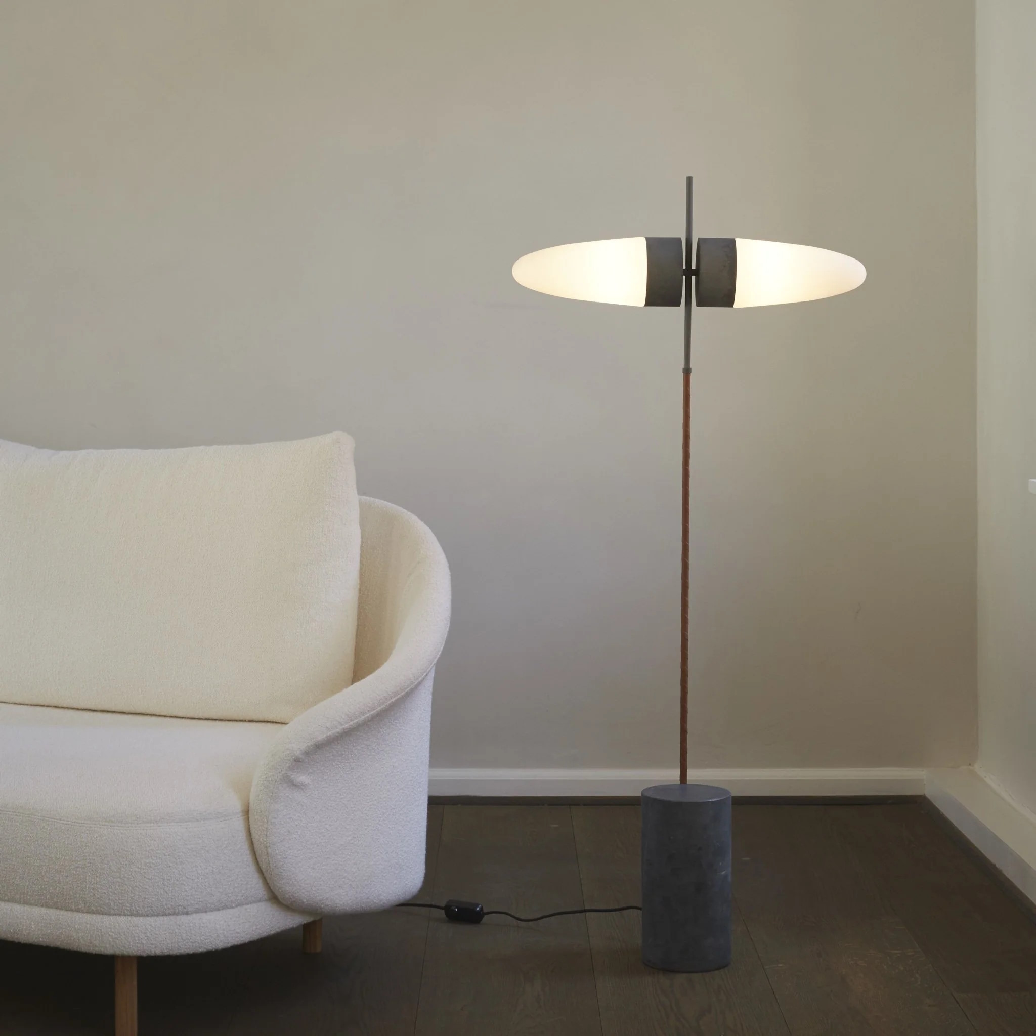 Торшер 101 Copenhagen Bull Floor Lamp получил своё название от похожих на быка абажуров из опалового стекла, обеспечивающих плавное рассеяние света. Корпус предмета интерьера состоит из основания из неполированного серого мрамора с алюминиевым стержнем, обтянутым кожей коньячного цвета, и верхней частью из оксидированного алюминия.