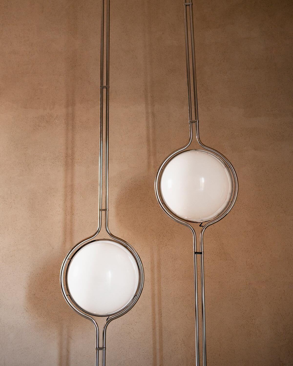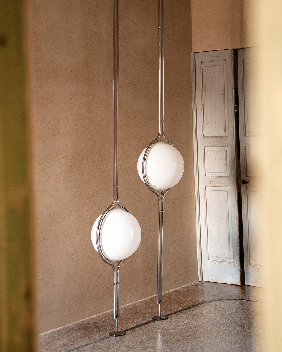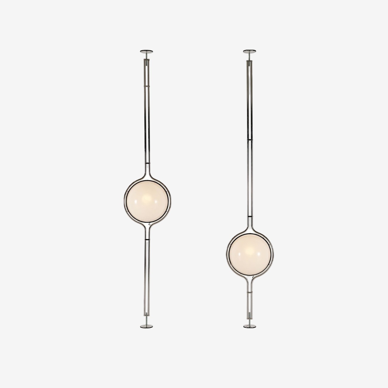 Торшер Tacchini Dana от Jean-Pierre Garrault & Henri Delord - светящаяся сфера в строгом каркасе из хромированного металла. Два стержня создают легкий прозрачный объем вокруг матового шара. Высокая вертикальная форма доминирует в пространстве, зафиксированная между потолком и полом.