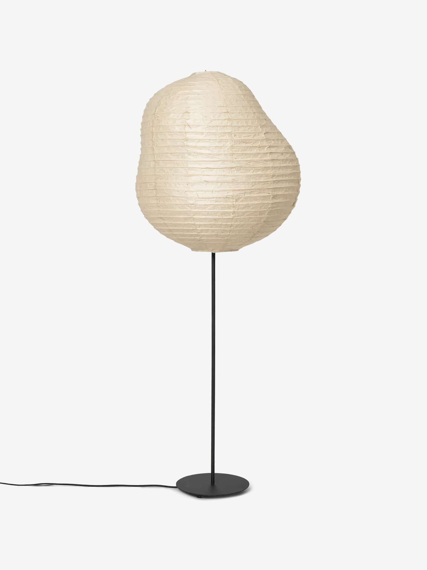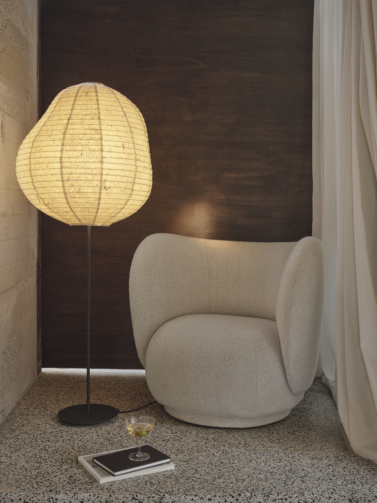 Торшер Ferm Living Kurbis Floor Lamp — Tall переосмысливает традиционный дизайн напольных светильников. Лампа сочетает элегантный металлический стержень и объёмный абажур из бумаги Васи. Торшер с излучаемым нежным светом идеально подходит для создания читательского уголка.