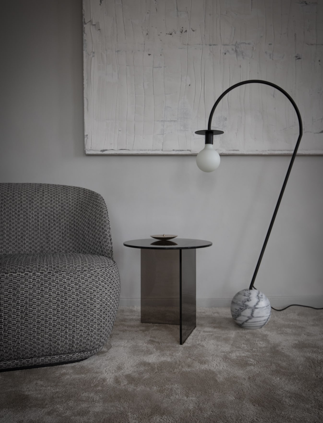 Напольный светильник Friends Founders La Lampe вдохновлён идеей равновесия и контраста. Поэтому объёмное сферическое основание в нём сочетается с тонким изогнутым шестом, а сдержанный металл и прохладный шелковистый мрамор — с глянцевым стеклом.