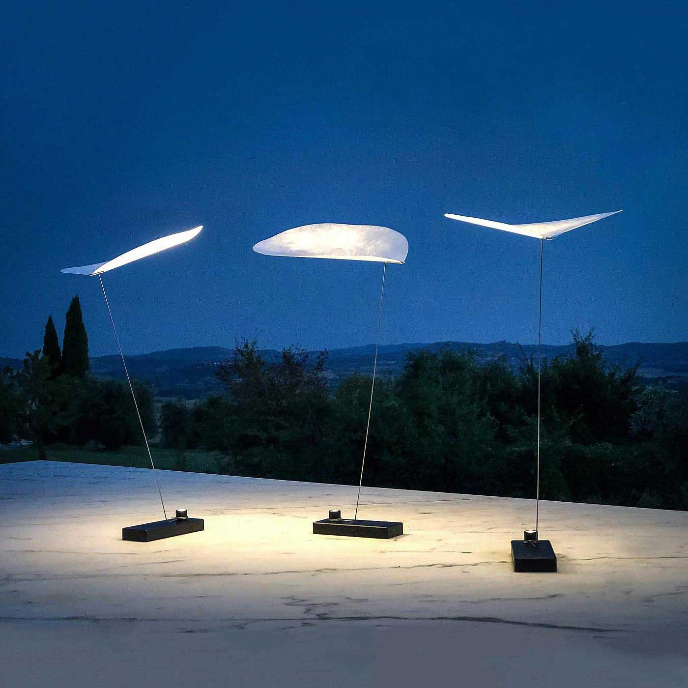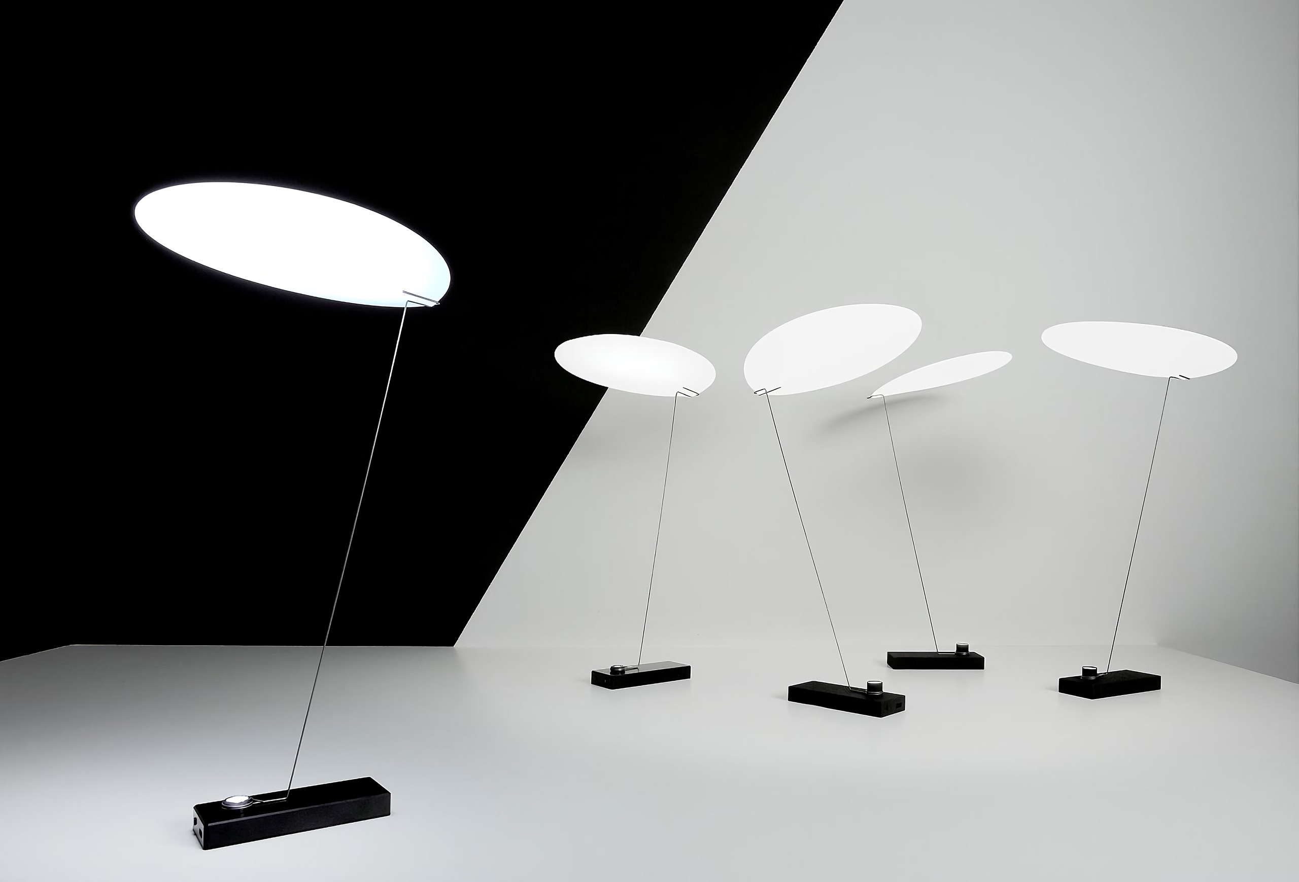 Настольный светильник Ingo Maurer Koyoo состоит из устойчивого чёрного пьедестала и будто парящего в воздухе светящегося круга на тонкой леске. Объёмный бумажный абажур лампы создаёт мягкое расслабленное свечение. Портативный светильник имеет три уровня яркости, настраиваемых одним нажатием кнопки.
