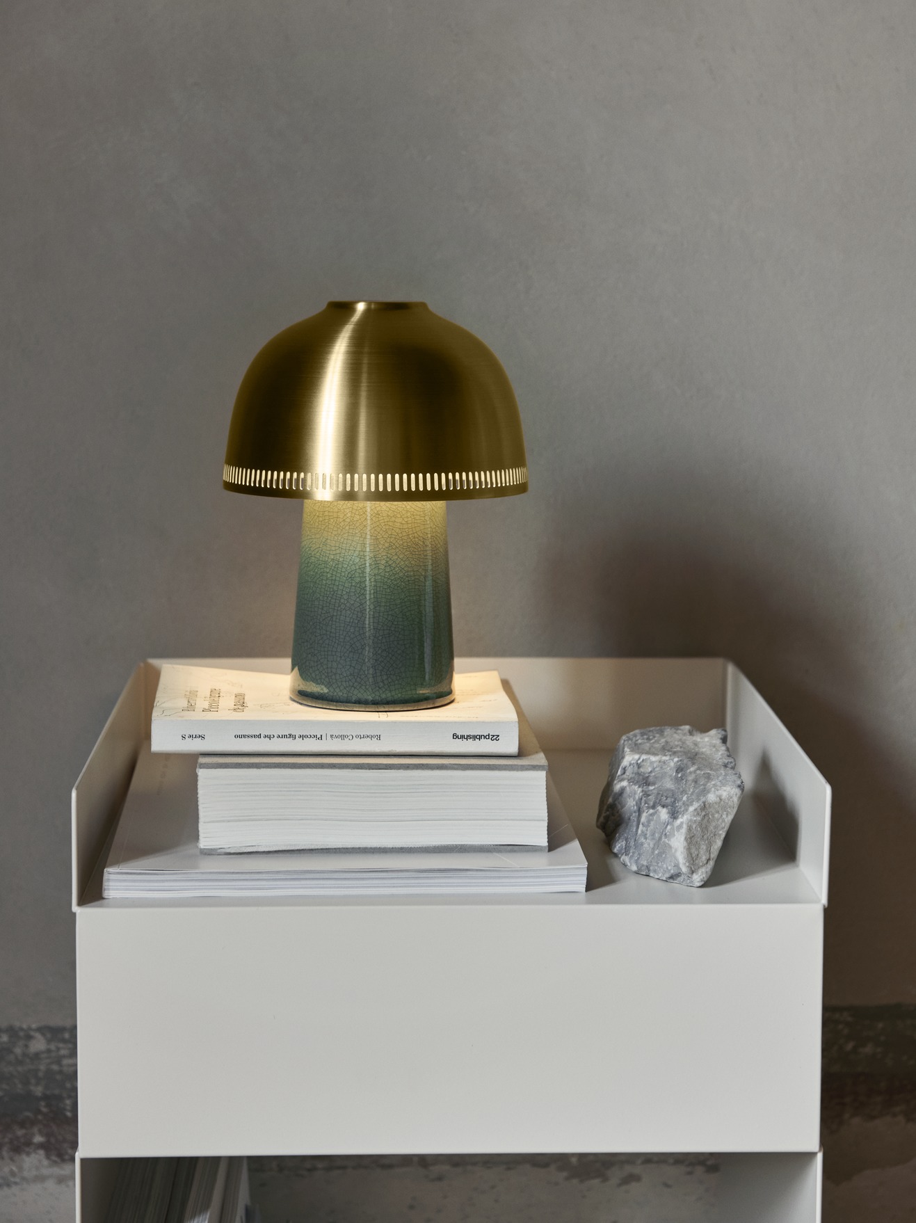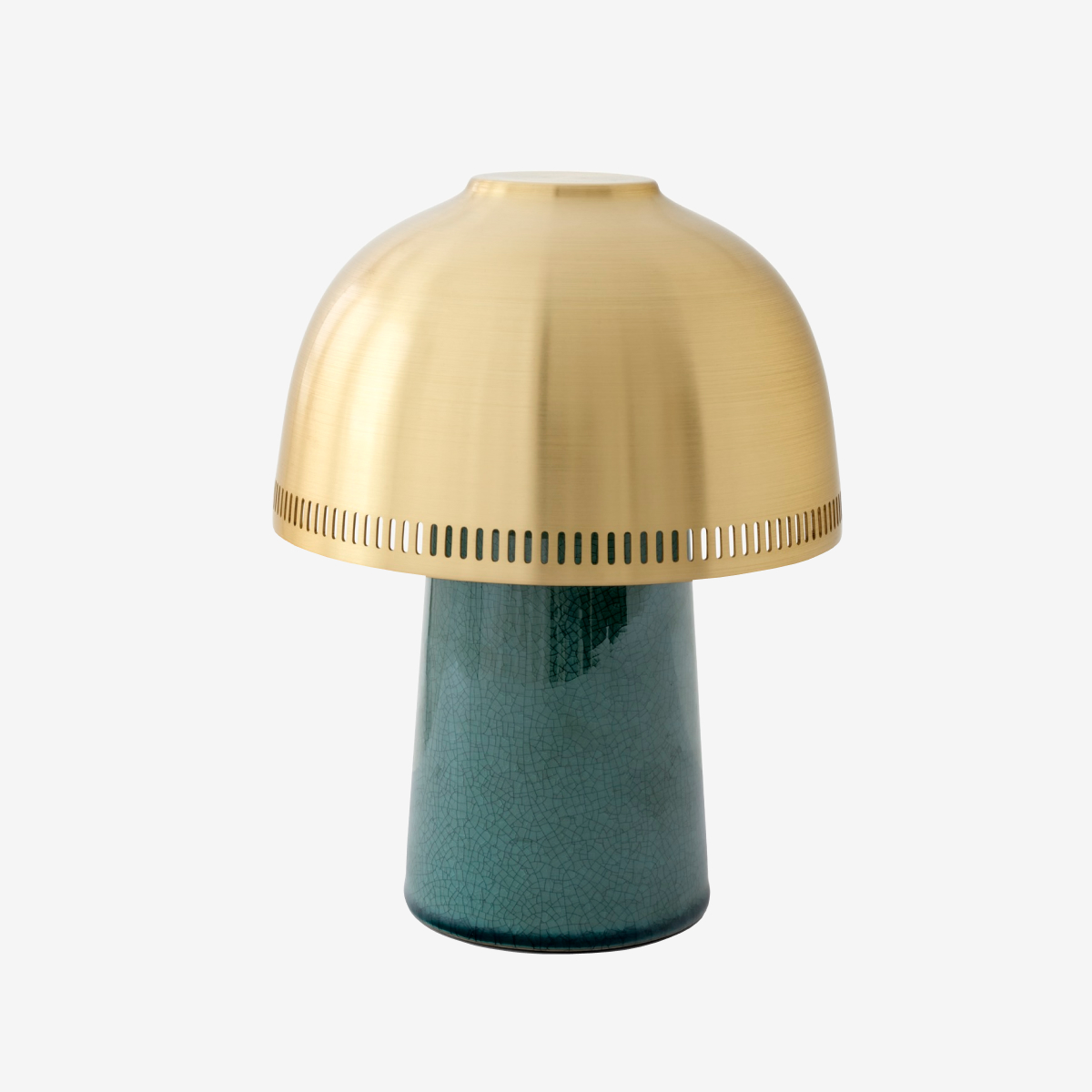 Портативный настольный светильник Raku Portable Lamp SH8 имеет латунный абажур и керамическое основание, покрытое глазурью.