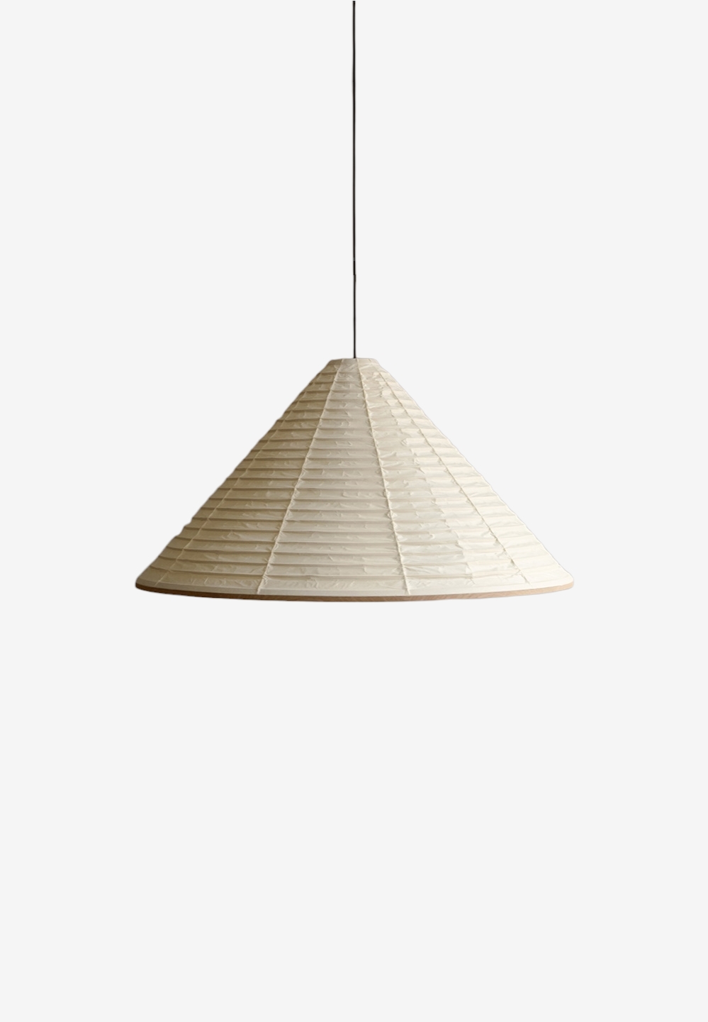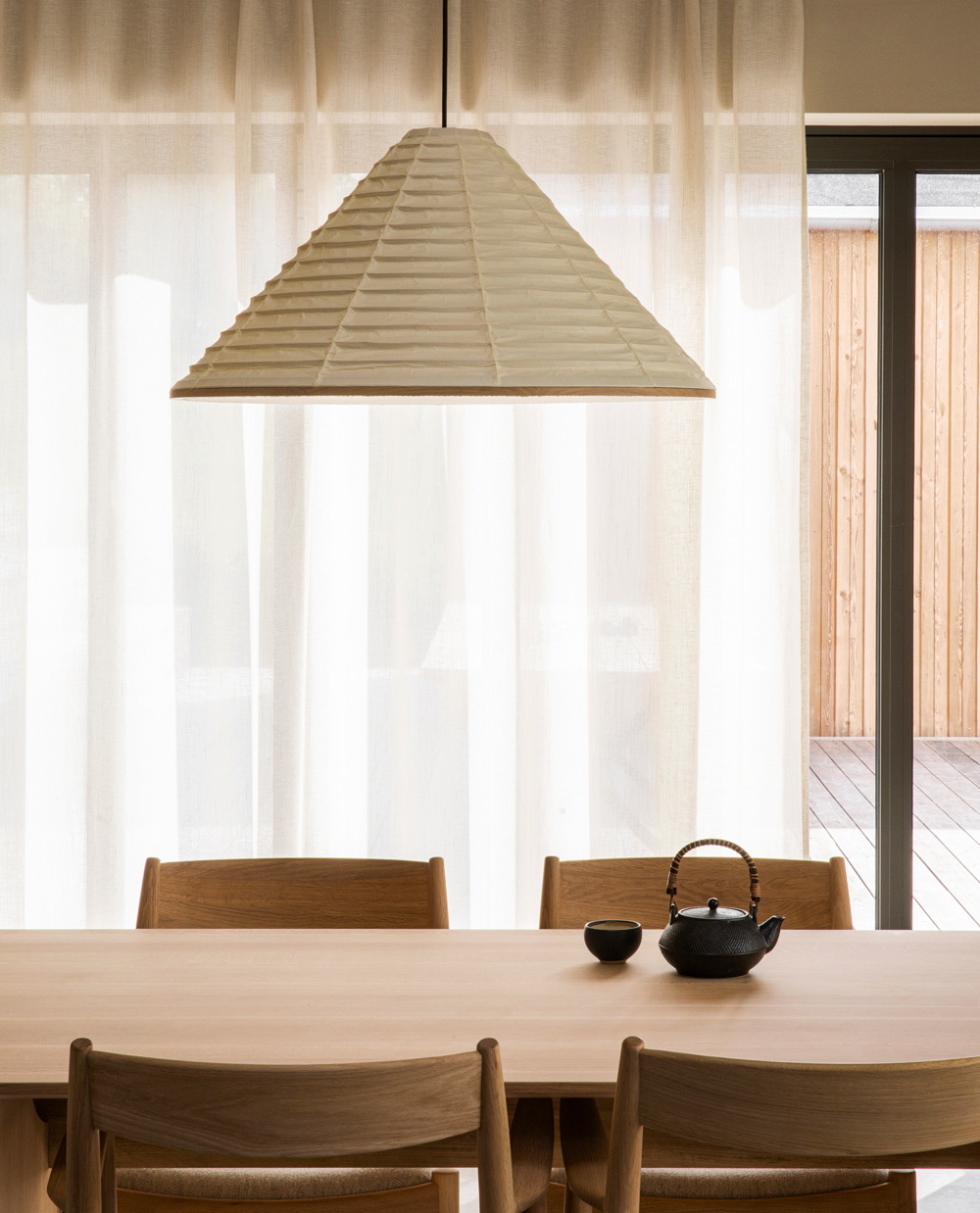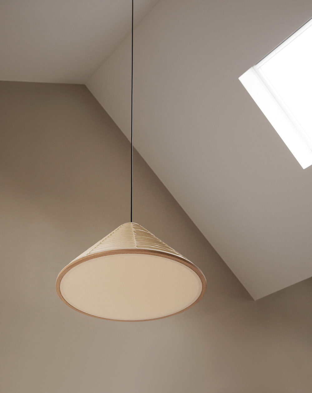 Абажур для подвесного светильника от студии Karimoku Case Study имеет лёгкий и утончённый дизайн, который подчёркивается лаконичностью выбранных материалов. За кажущейся простотой, однако, скрывается функциональность дизайна: нижняя сторона светильника закрыта прикреплённым на магнитах полотном бумаги Washi, создающим уютный рассеянный свет и позволяющим легко и быстро заменить лампочку по необходимости.