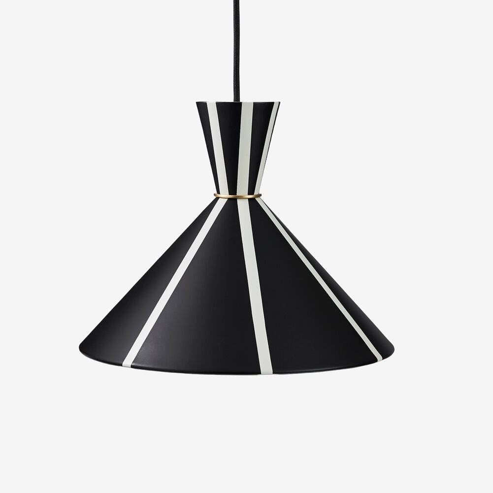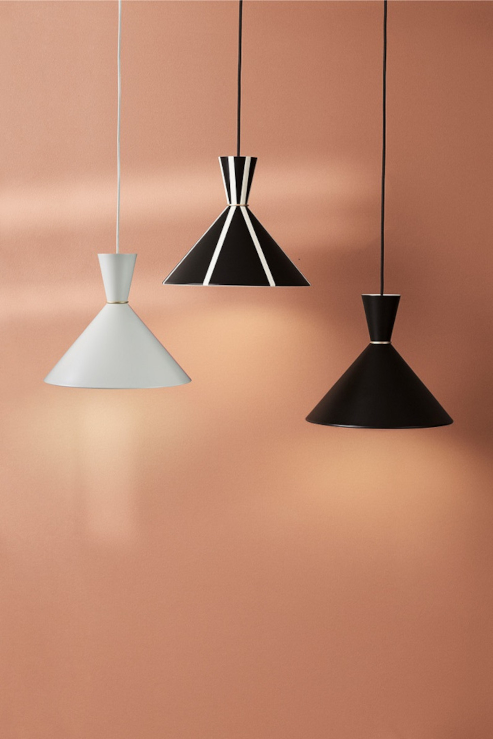 Подвесной светильник Warm Nordic Bloom — это элегантный предмет интерьера, разработанный датским дизайнером Svend Aage Holm-Sørensen. Сочетание металлического абажура и простой формы обеспечивает лёгкий внешний вид. Одной из особенно элегантных деталей является цельное латунное кольцо, завершающее классический облик. Светильник представлен в трёх вариантах, которые могут хорошо смотреться друг с другом или по отдельности. Есть однотонные модели и более яркая полосатая отделка.