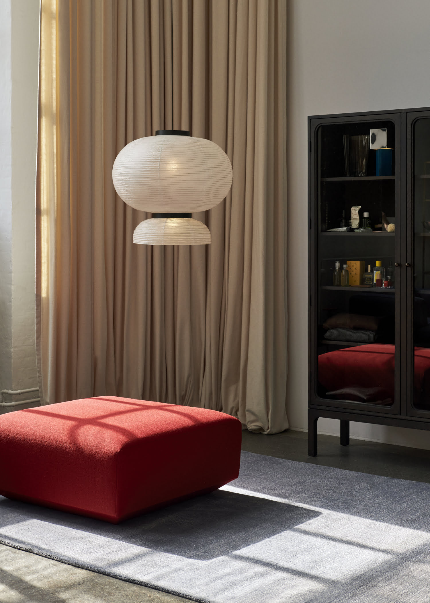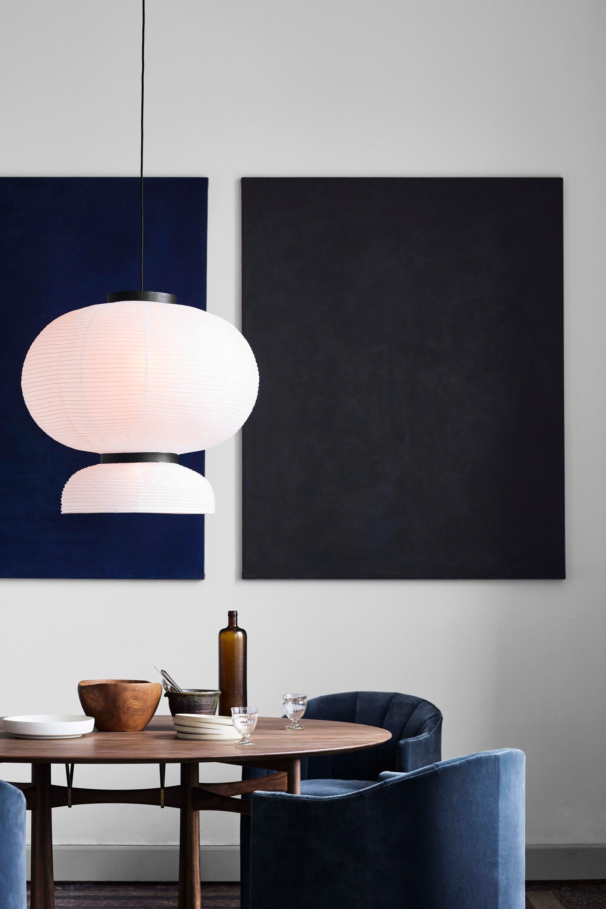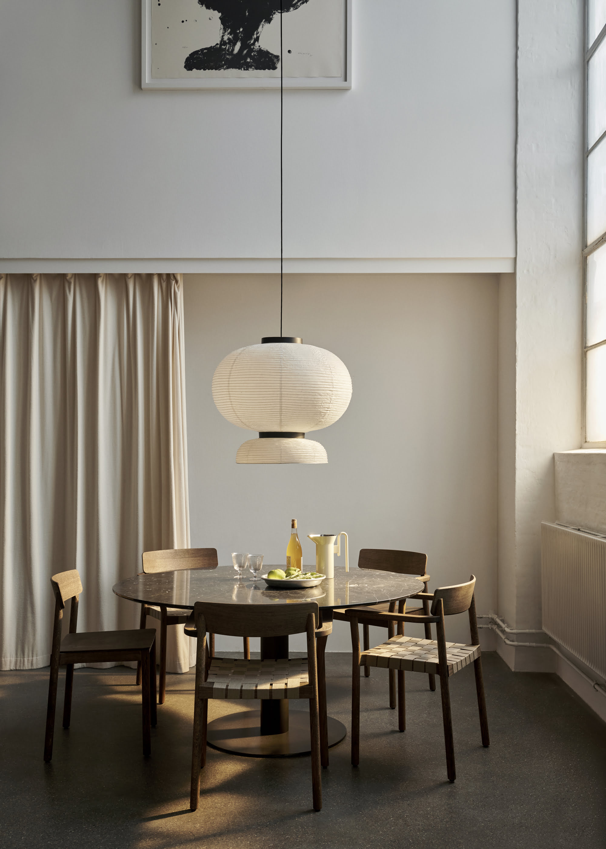 Подвесной светильник And Tradition Formakami Pendant JH5 — современная интерпретация традиционной японской лампы в виде фонаря. Модель гармонично сочетает в себе контрастные по фактуре и цветовой гамме материалы: рисовую бумагу и морёный дуб. Необычная форма светильника способна сделать его акцентной деталью интерьера.