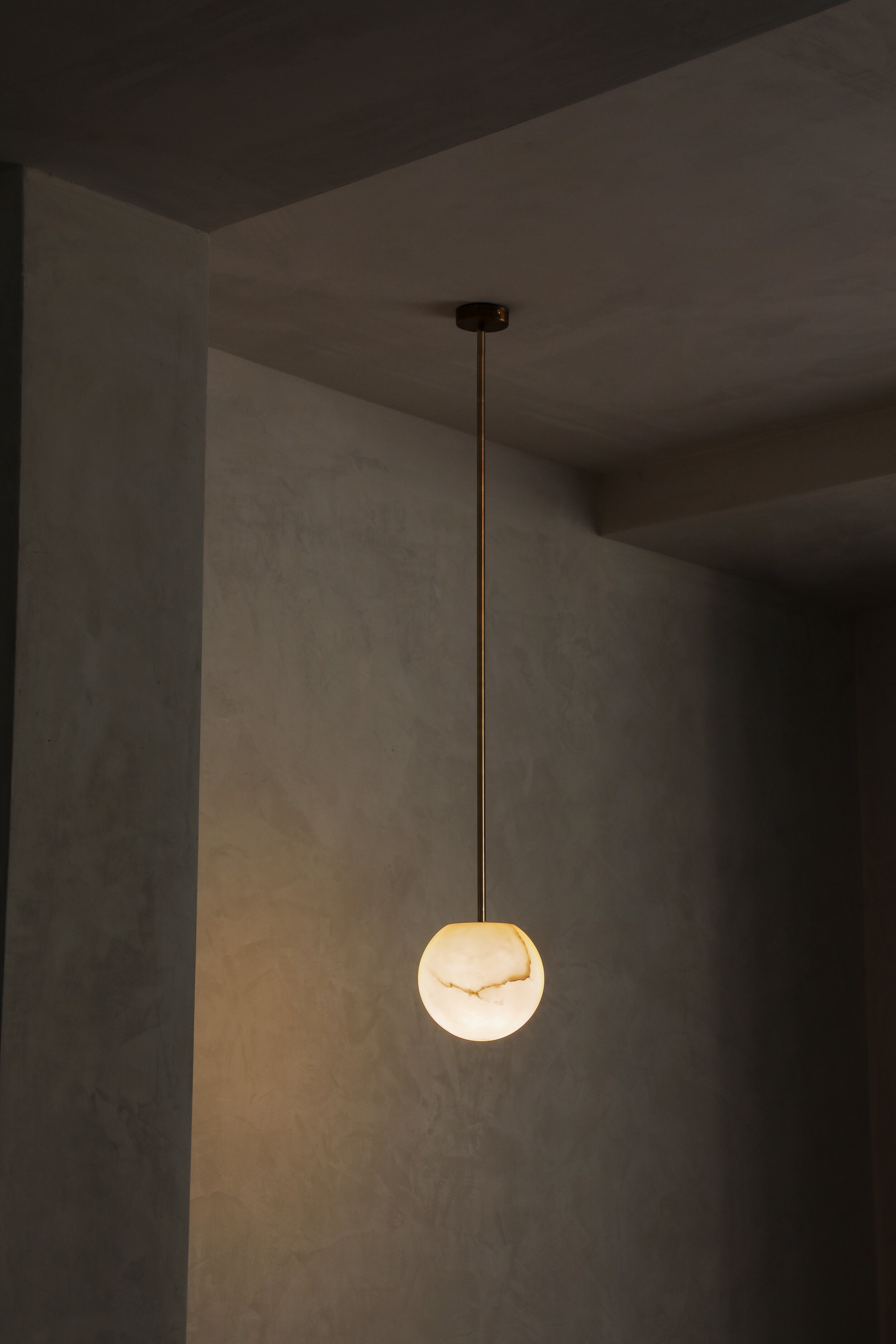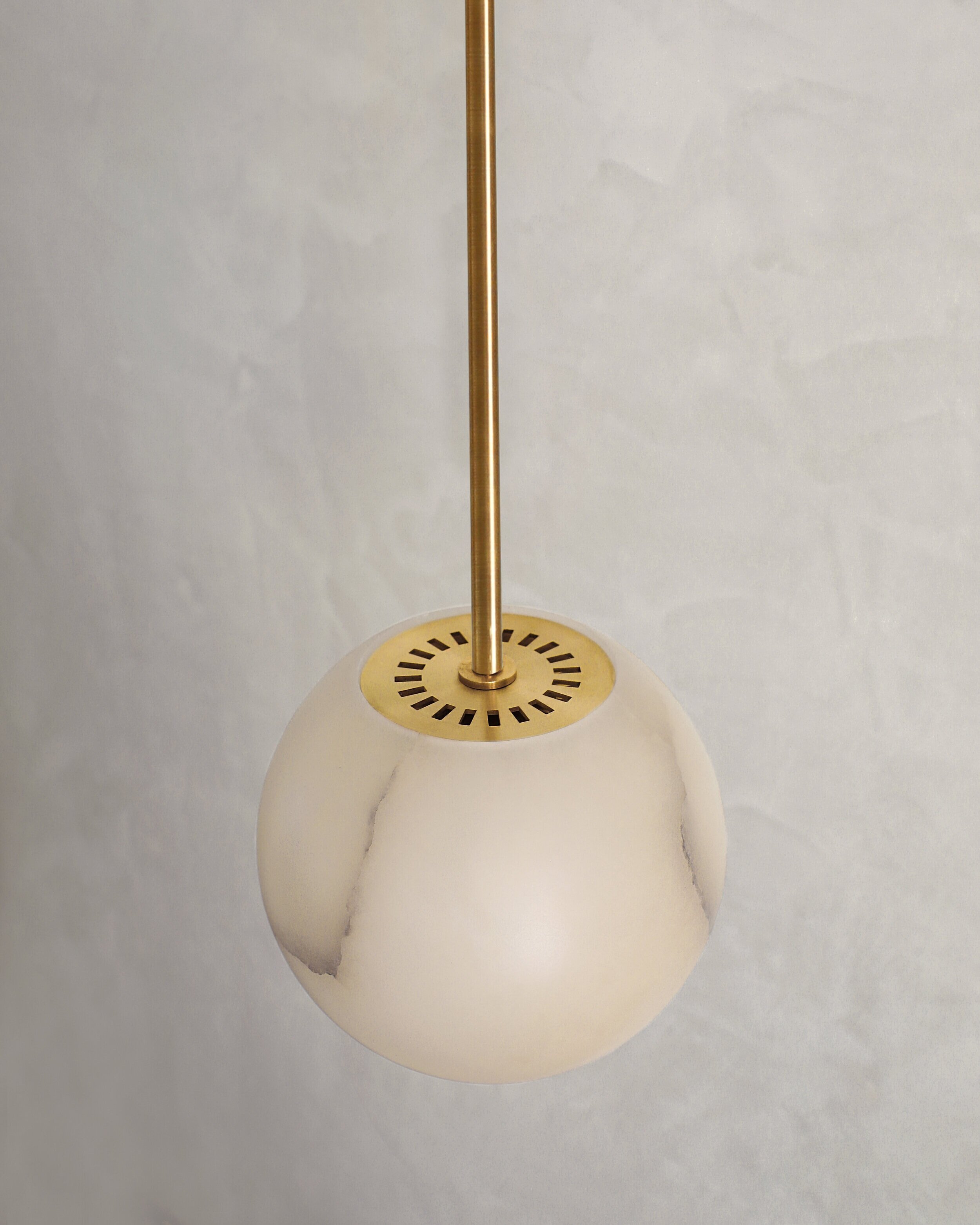 Подвесной светильник Contain Planette Pendant, tube привлекает внимание алебастровым плафоном сферической формы. Из-за малой толщины лампочка просвечивает узор материала, подчёркивая его естественность. Плафон держится на основании из латуни.