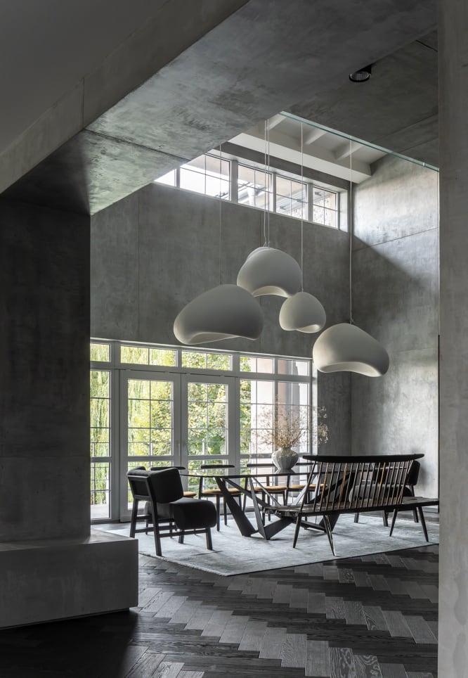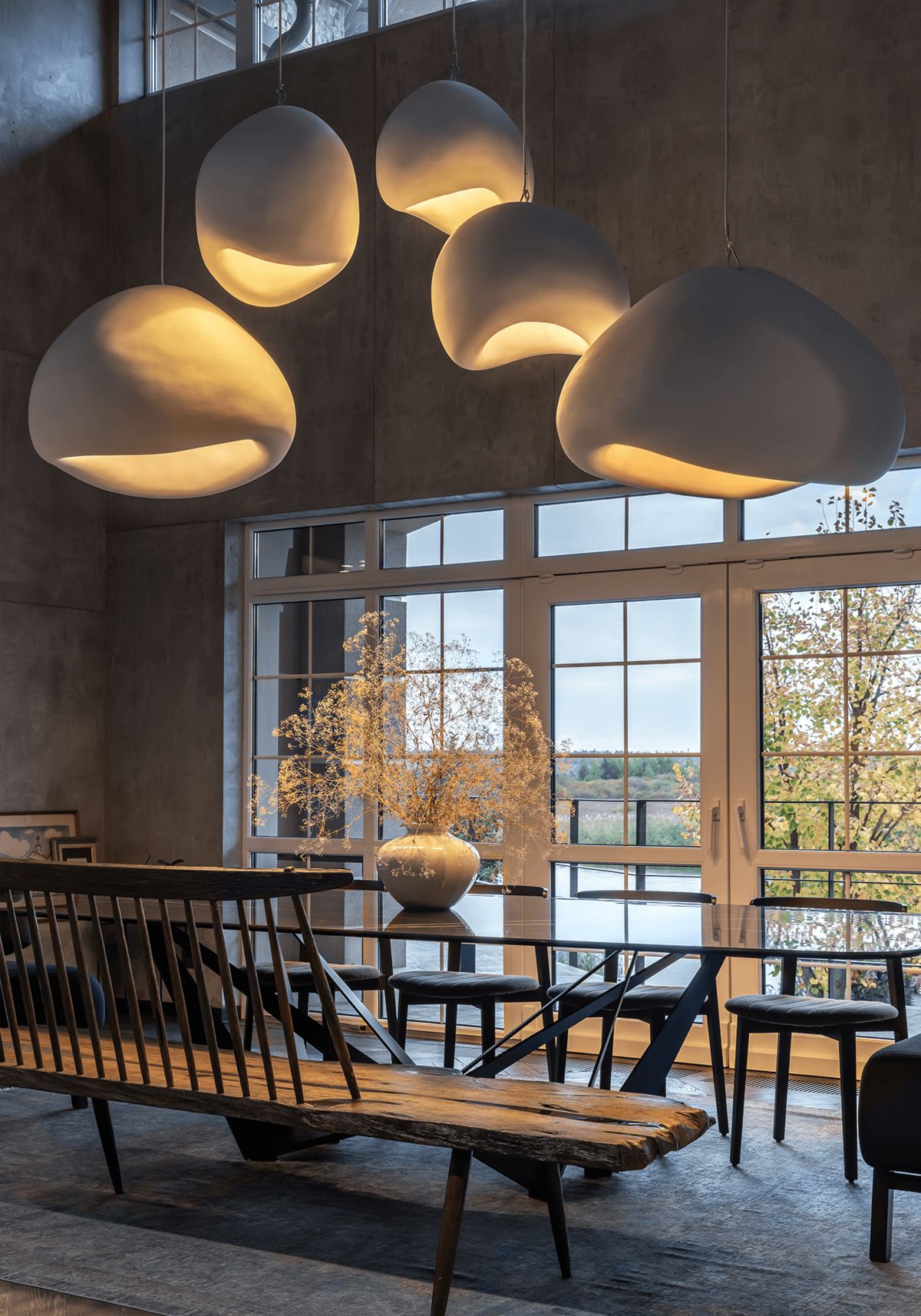 Подвесной светильник Sawinme — это смелое решение для просторных интерьеров с высокими потолками. Плавный силуэт подвесов и однотонный цвет отделки придают им внеземной облик, за счёт чего способны полностью поменять восприятие пространства.