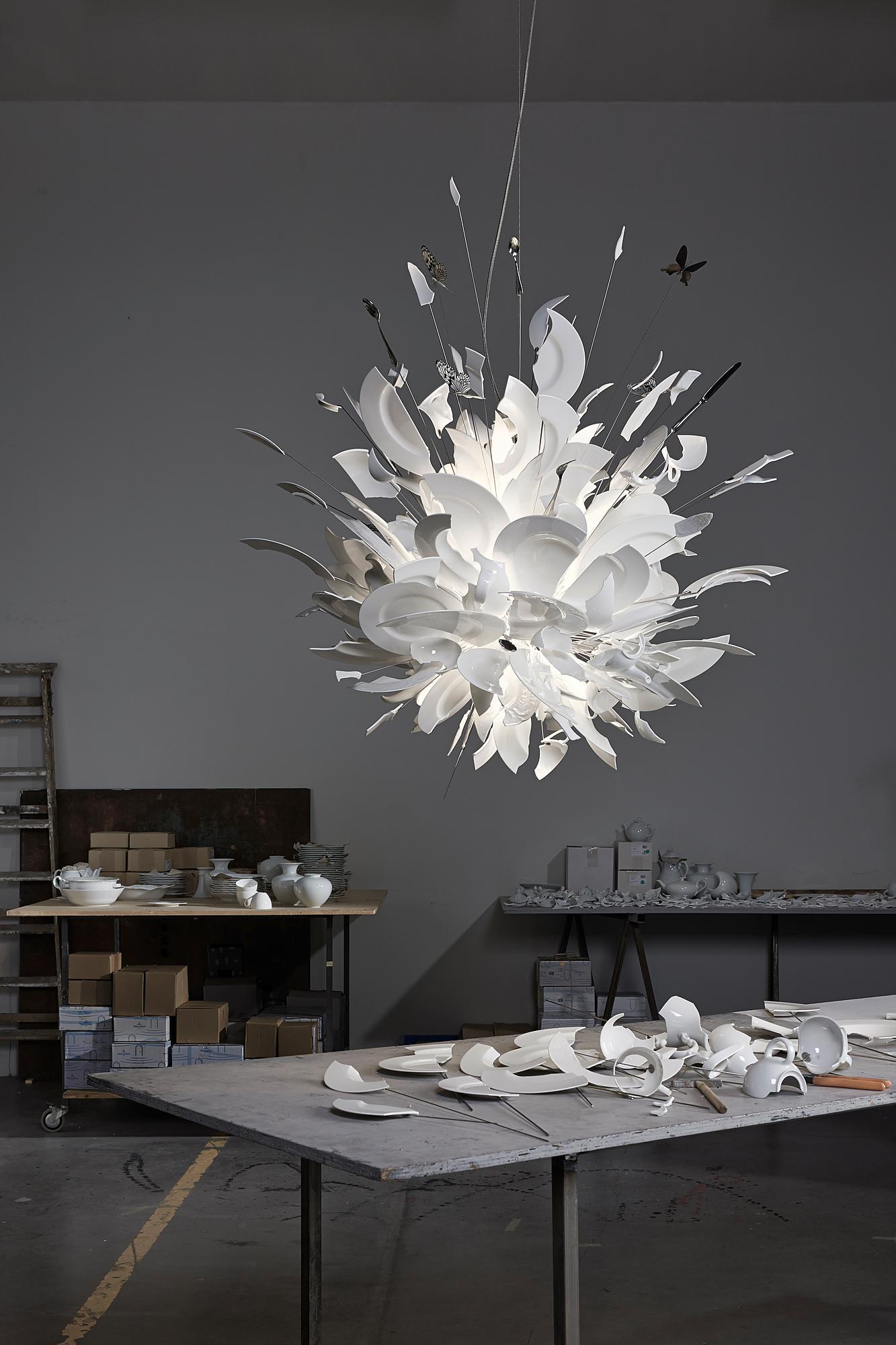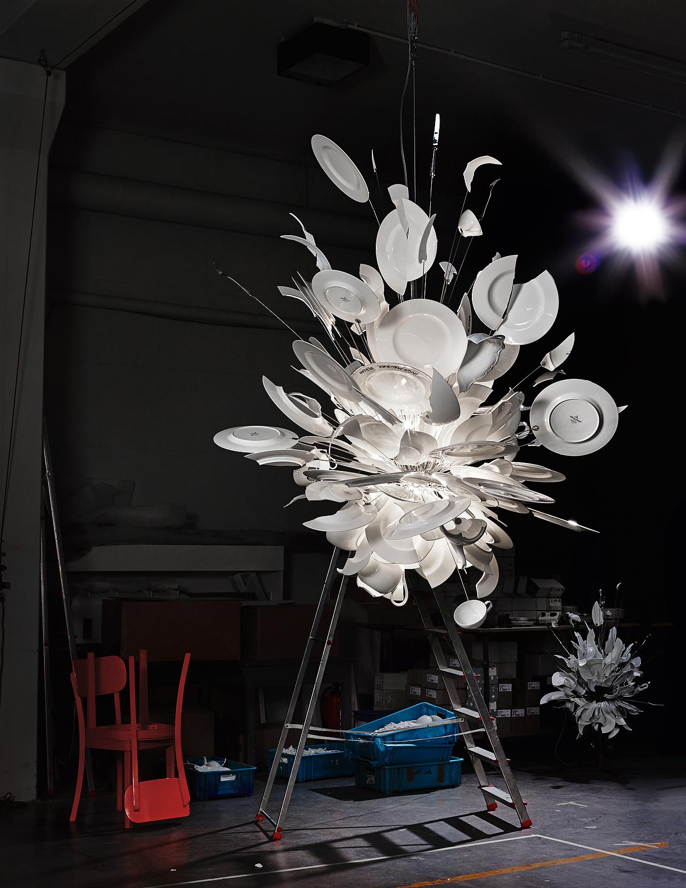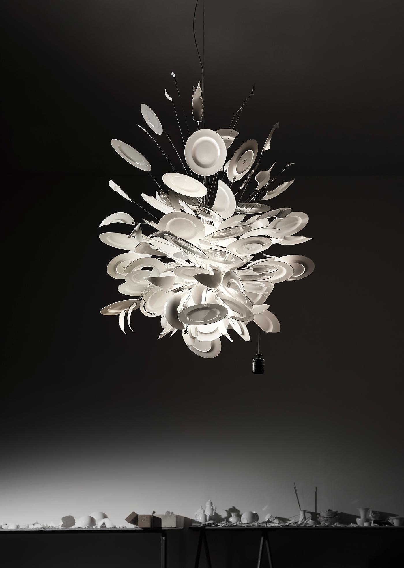 Необычная люстра Ingo Maurer Porca Miseria! выпущена ограниченным тиражом. Модель привлекает всеобщее внимание своей авангардной формой, сформированной битыми тарелками и осколками от статуэток Будды. Porca Miseria! выполняется вручную, поэтому каждый светильник является уникальным.