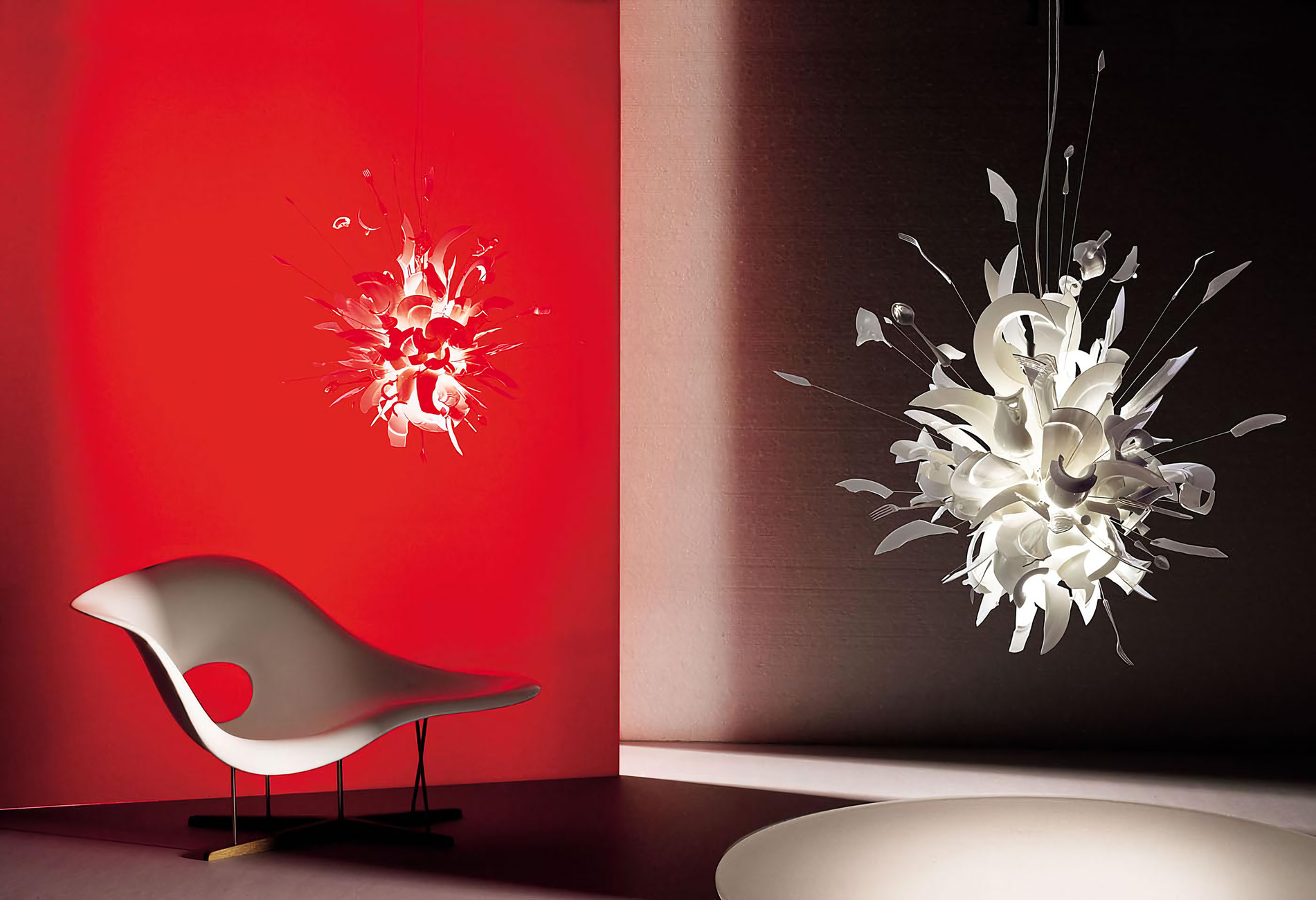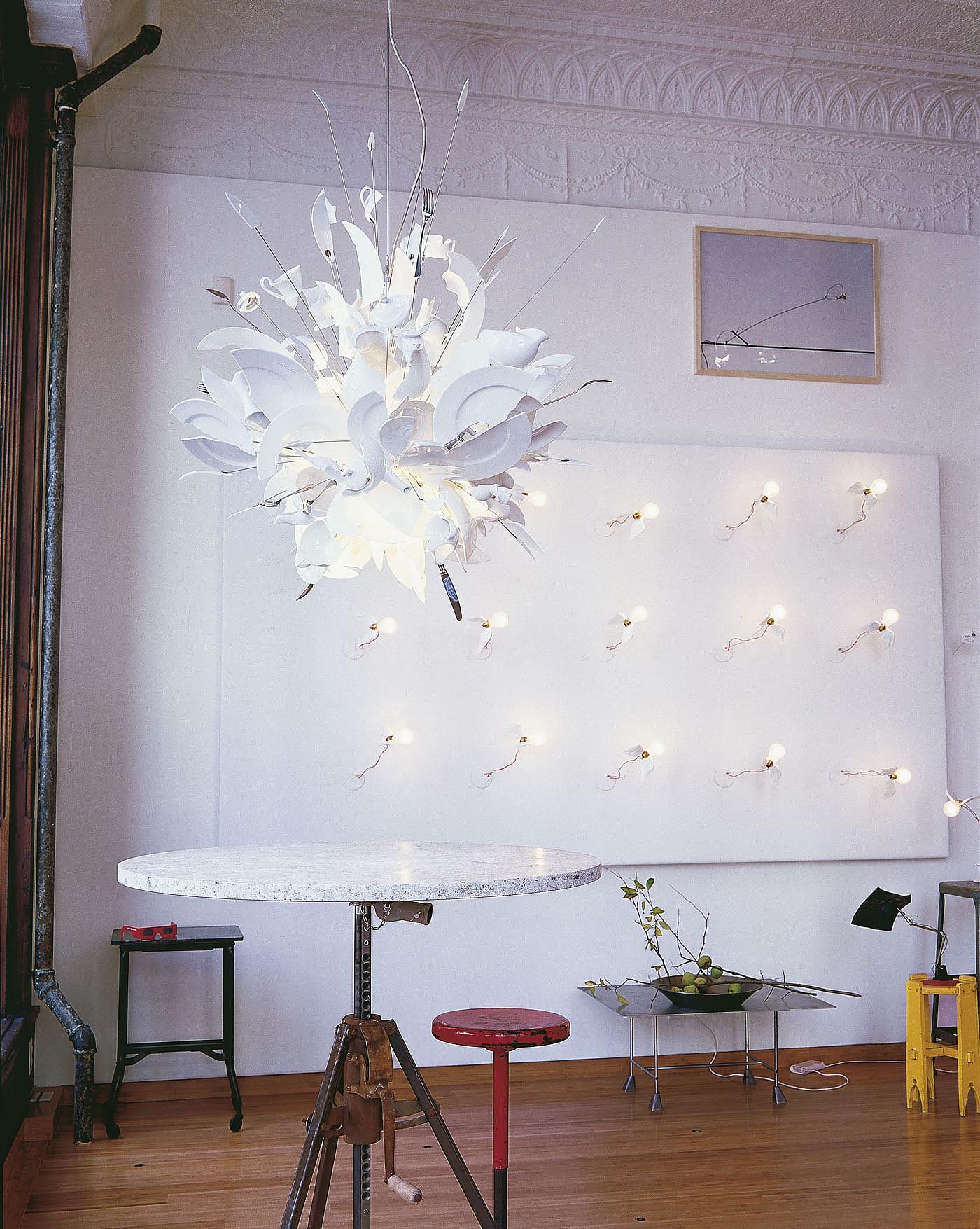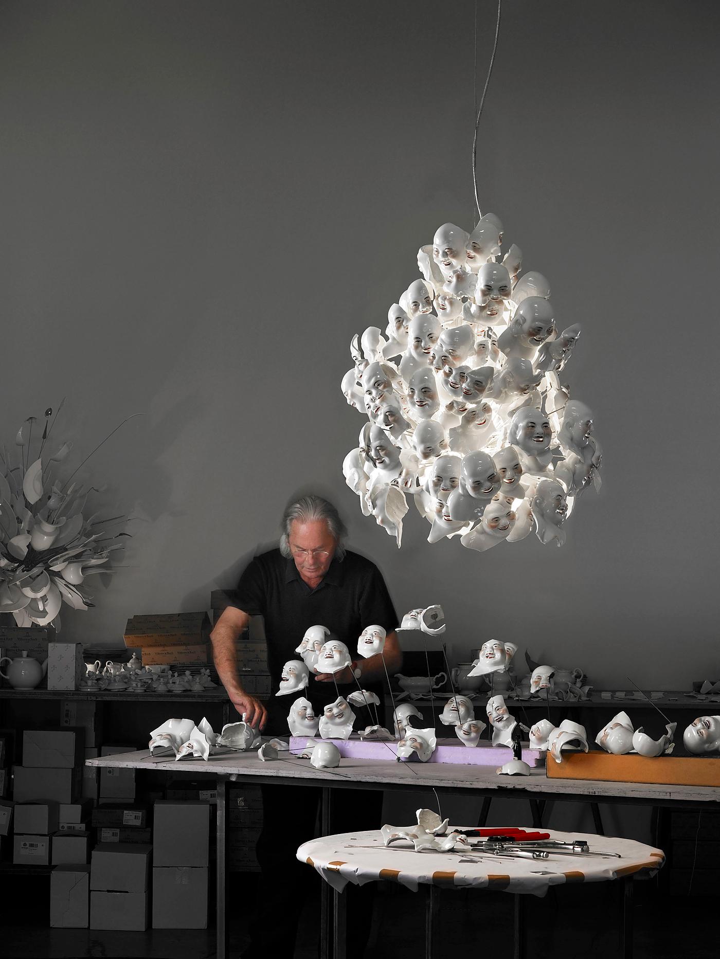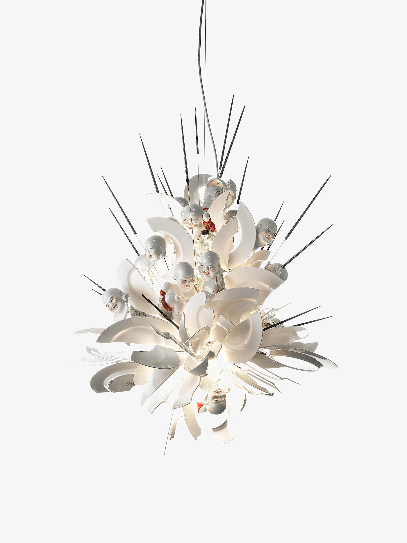 Необычная люстра Ingo Maurer Porca Miseria! выпущена ограниченным тиражом. Модель привлекает всеобщее внимание своей авангардной формой, сформированной битыми тарелками и осколками от статуэток Будды. Porca Miseria! выполняется вручную, поэтому каждый светильник является уникальным.