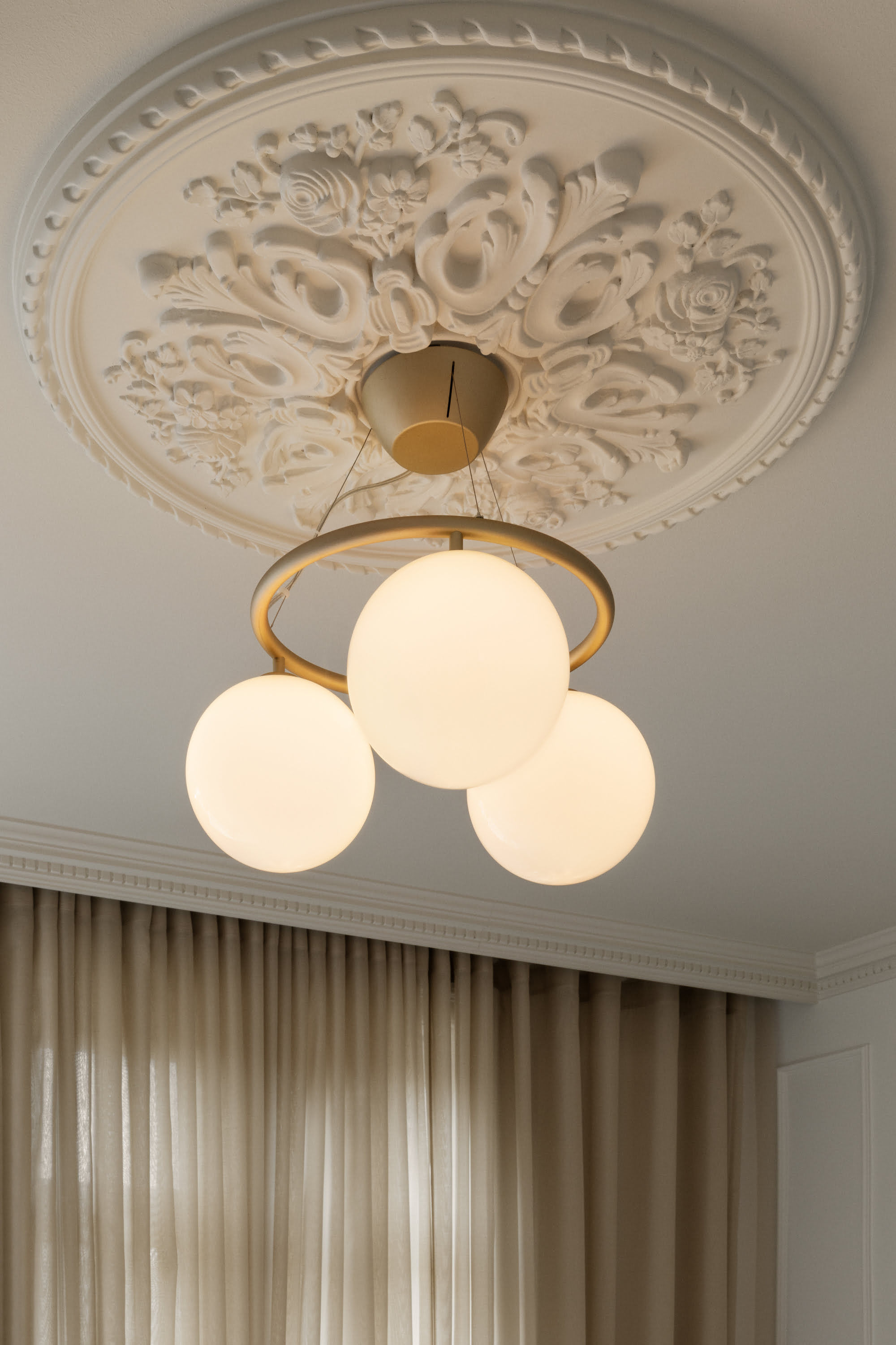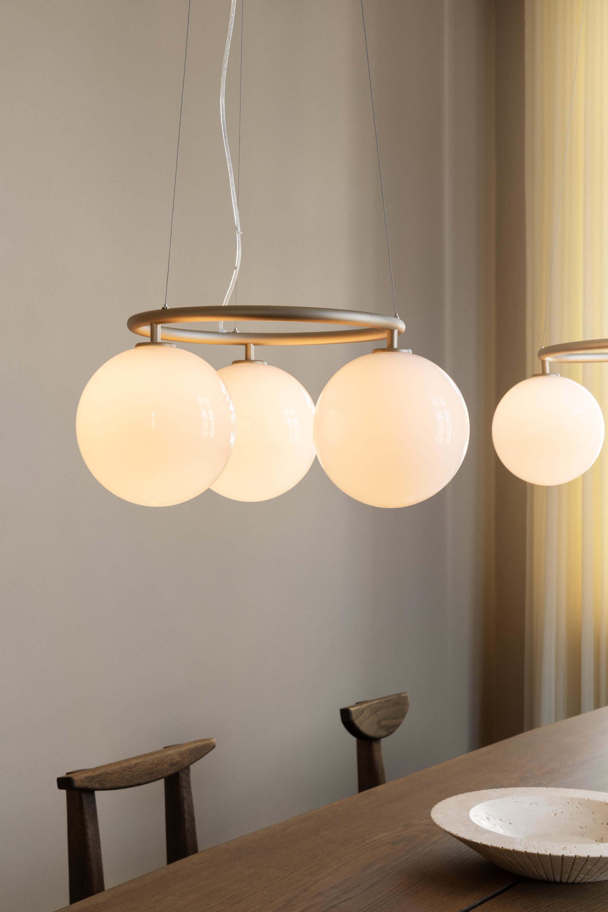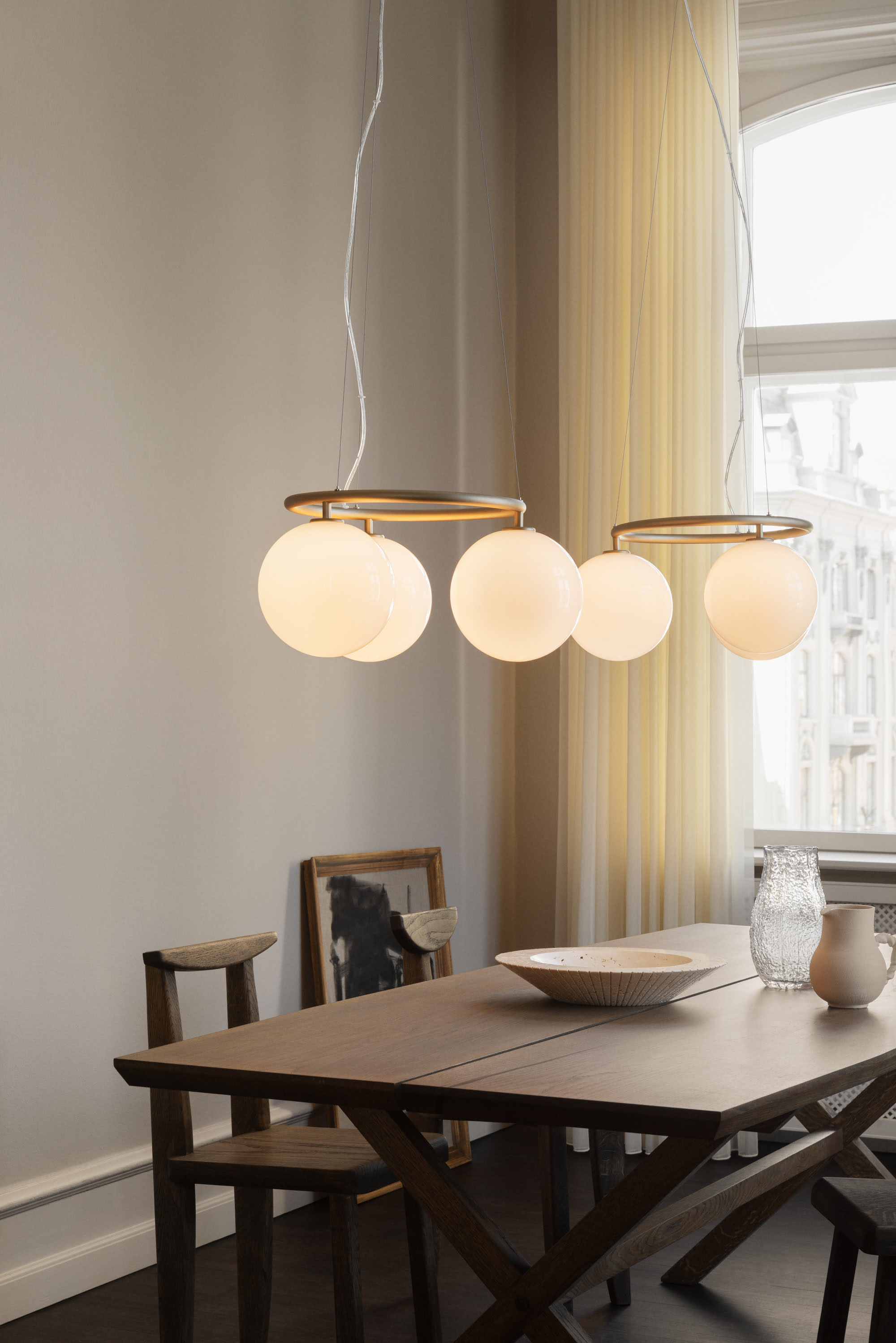 Подвесная люстра Nuura Miira 3 Circular — современная модель в минималистичном стиле. Изделие состоит из гладкого металлического кольца, удерживающего три изящные стеклянные сферы. Люстра может стать центральным источником освещения в небольшой гостиной или частью композиции из осветительных приборов в просторной столовой зоне.