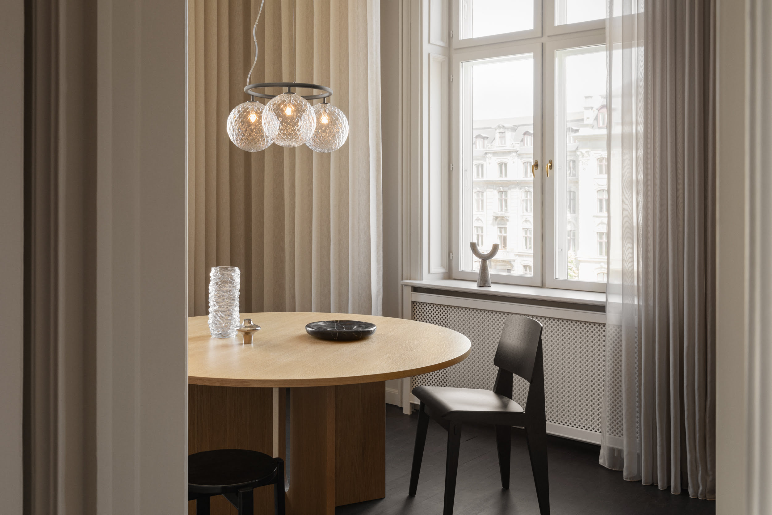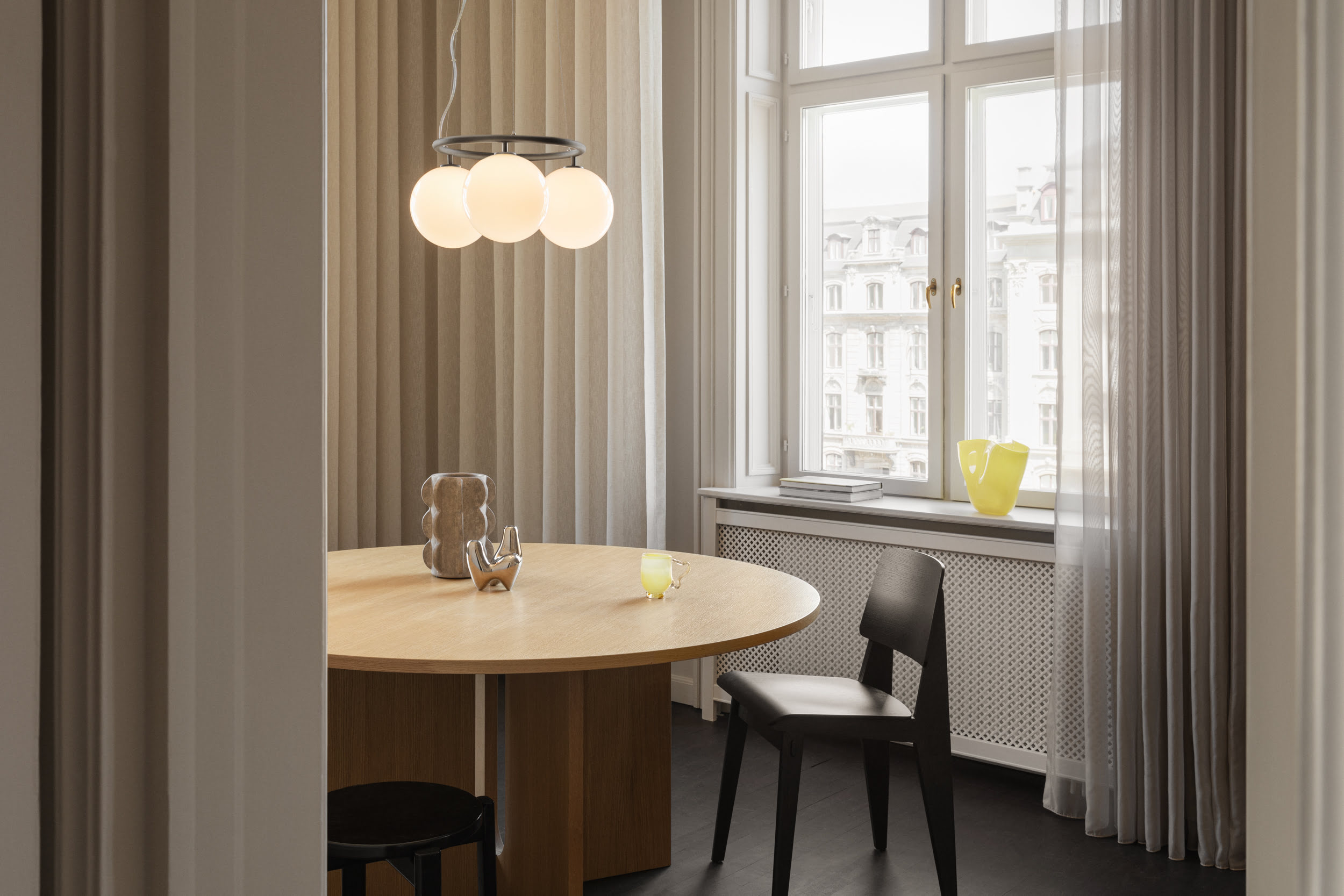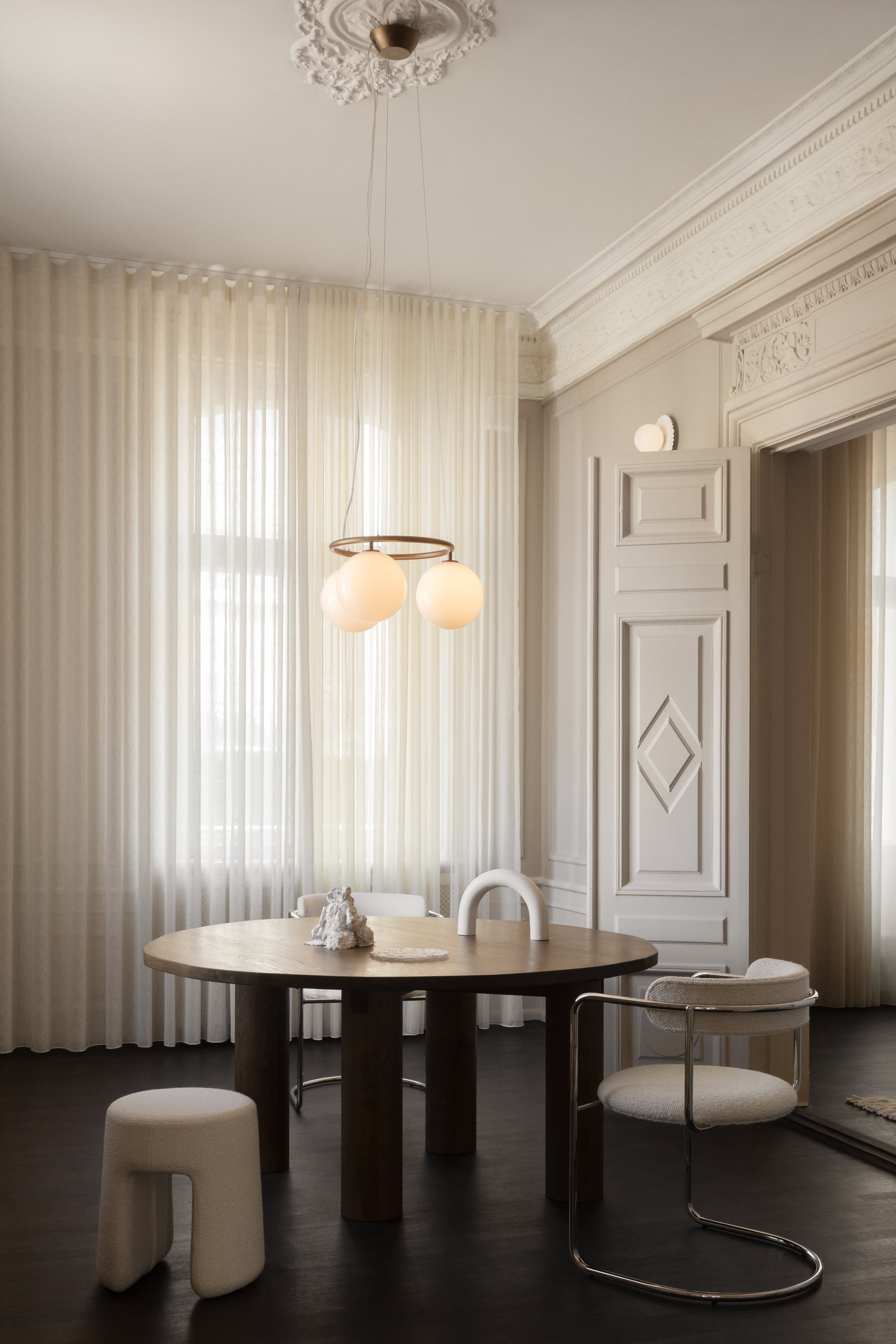 Подвесная люстра Nuura Miira 3 Circular — современная модель в минималистичном стиле. Изделие состоит из гладкого металлического кольца, удерживающего три изящные стеклянные сферы. Люстра может стать центральным источником освещения в небольшой гостиной или частью композиции из осветительных приборов в просторной столовой зоне.