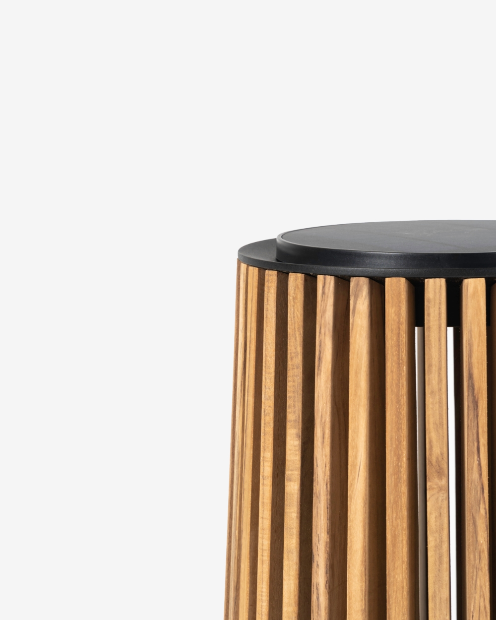 Рама выполнена из алюминия чёрного цвета, вставки – из натурального необработанного тика.
