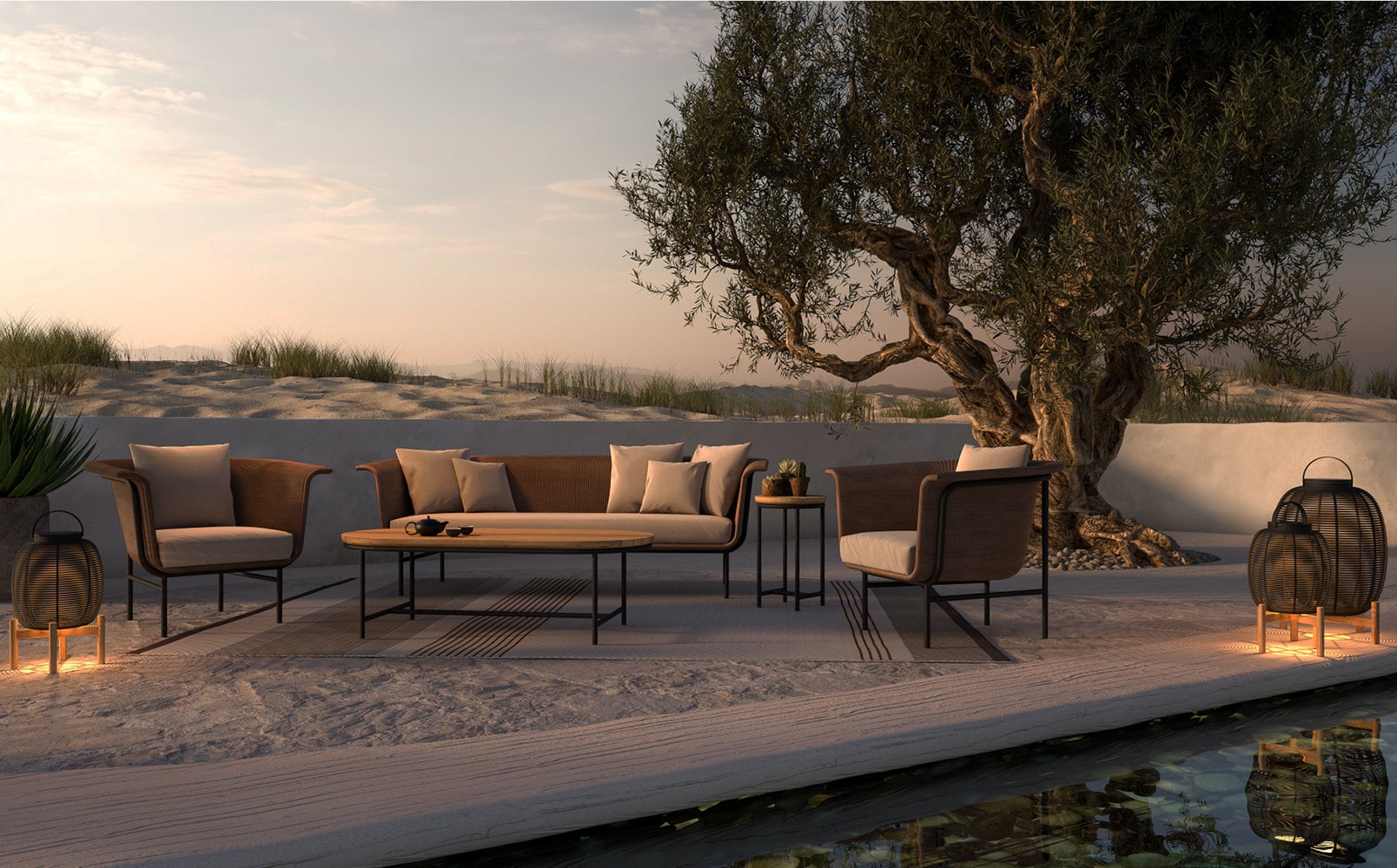 Рама выполнена из алюминия с порошковым покрытием, отделка – плетение из полиэтилена высокой прочности. Дополнительное основание выполнено из натурального необработанного тика.
