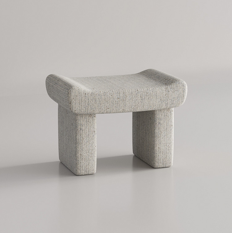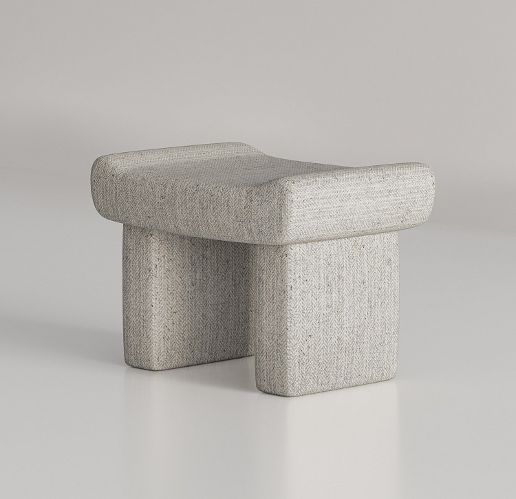 Светлый табурет Modénature Lamar Stool от Marc de Berny — версия с измененной геометрией верха. Здесь сиденье имеет не плавный, а выраженный изгиб по краям с четкими, заостренными углами. Конструкция на массивных боковинах остается прежней. Обивка скрывает стыки, но контур становится более графичным и динамичным.