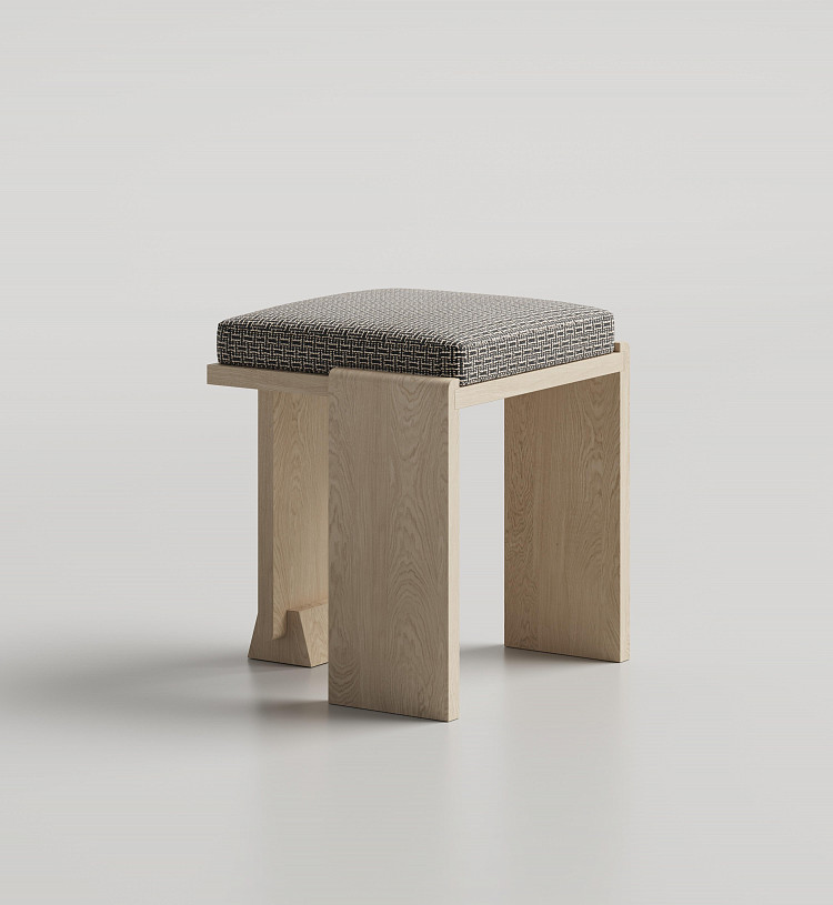 Табурет Modénature Scroll Stool от Viktoriya Kliman повторяет архитектурный принцип одноименных моделей. Его силуэт определяет основание из трех деревянных элементов разной ширины. Над ним расположено сиденье квадратной формы с мягким наполнением. Сиденье обтянуто тканью, чей плетеный орнамент составляет главный декоративный акцент.