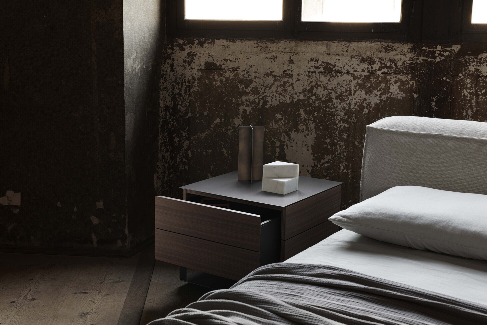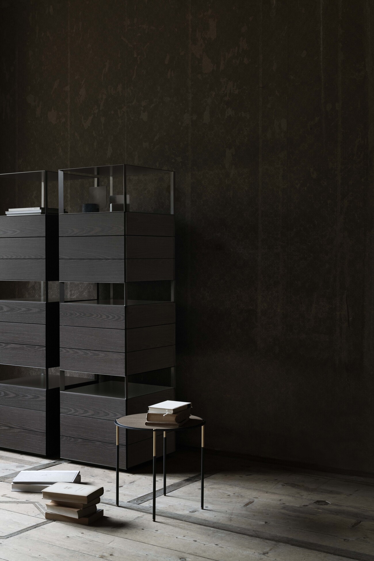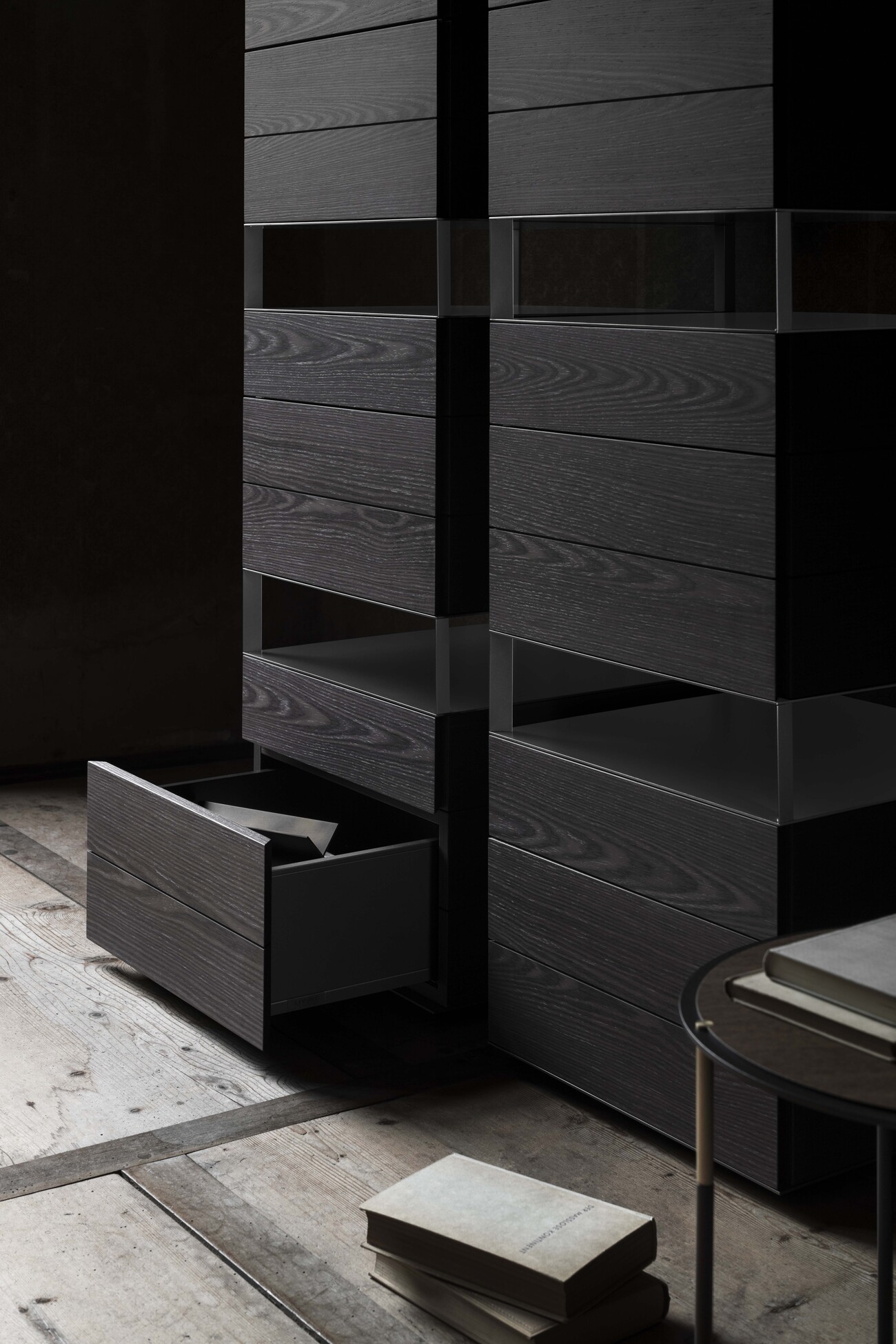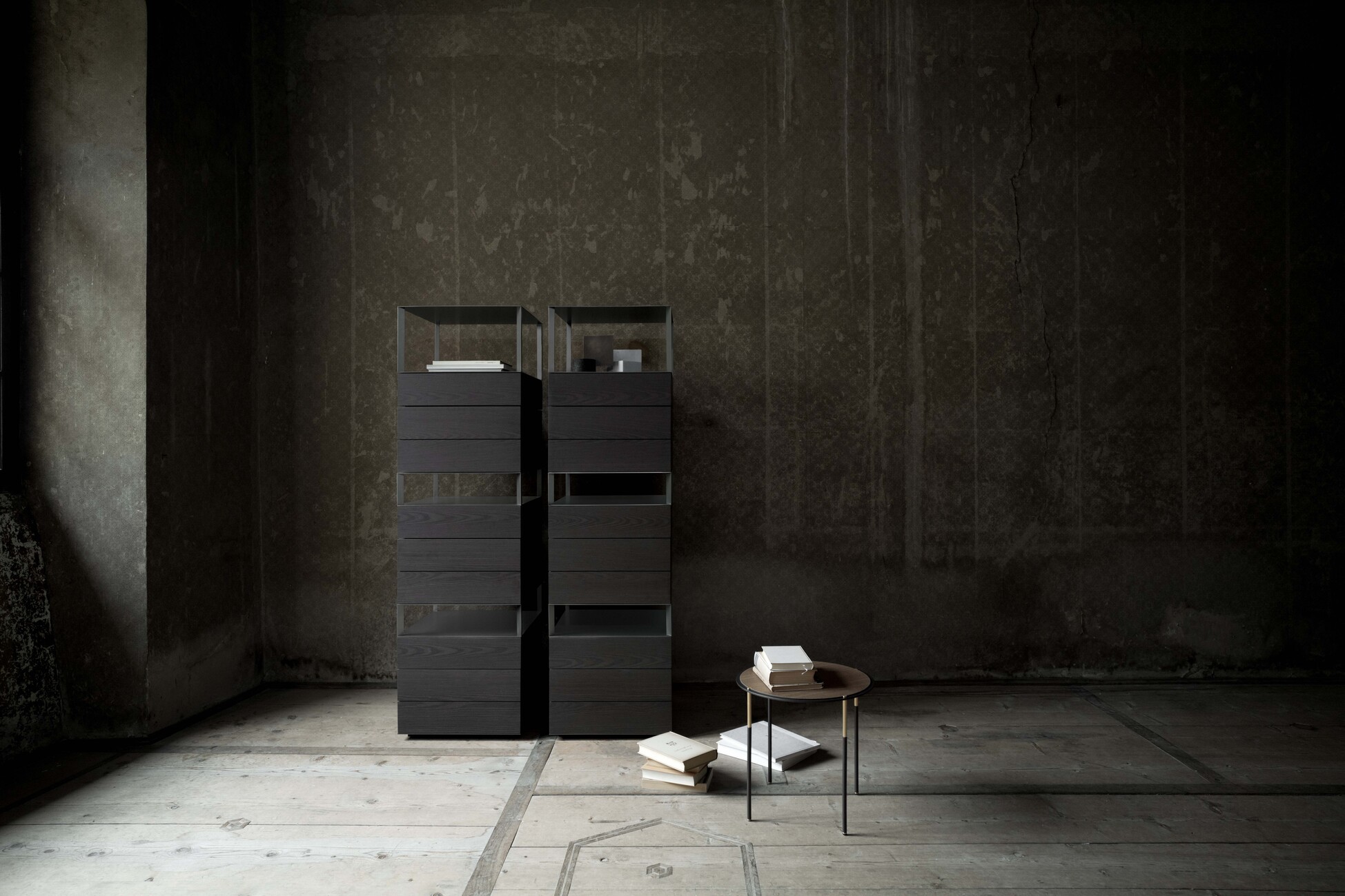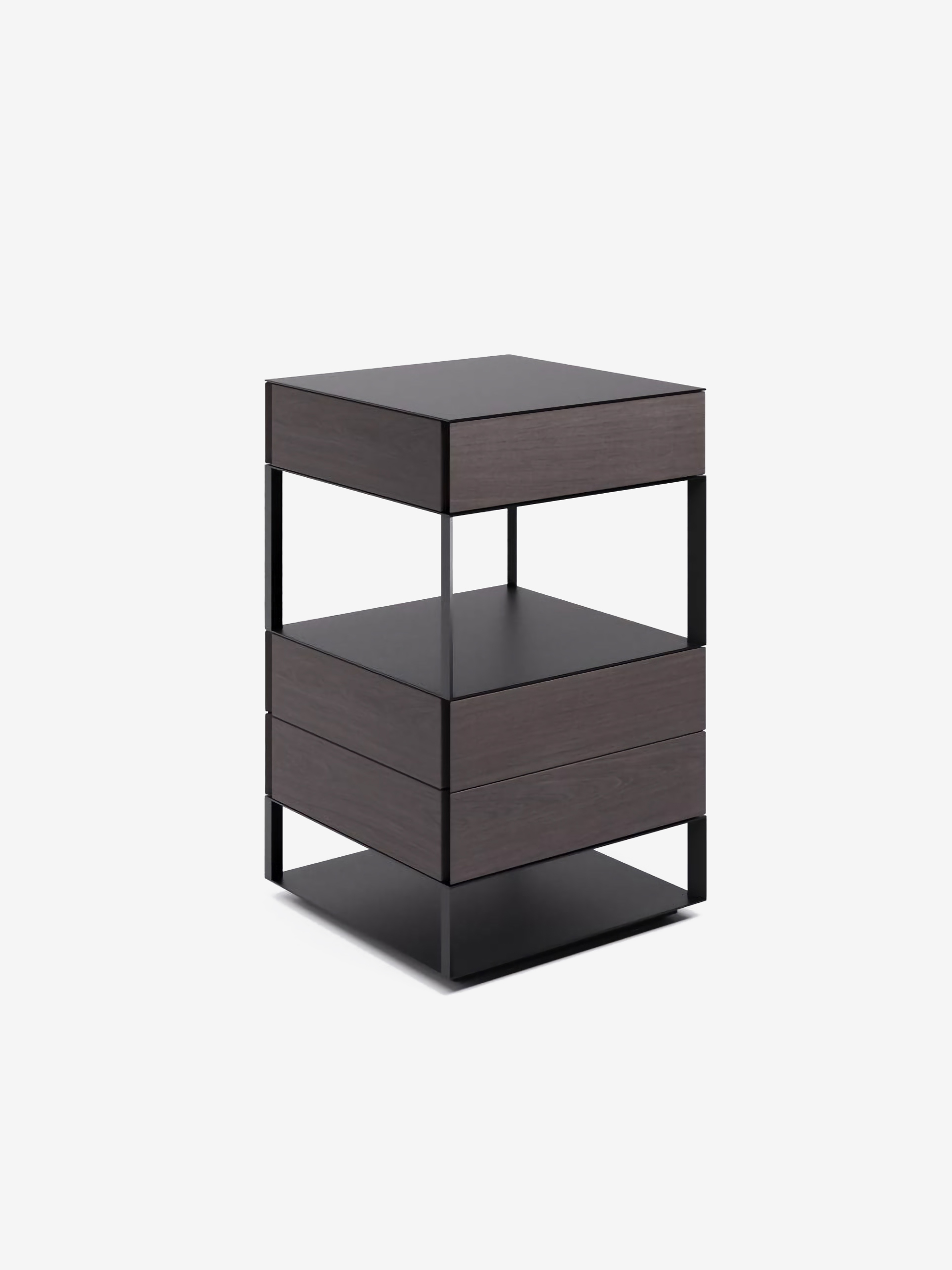 Прикроватная тумба Living Divani Halfsquare — функциональная модель со строгими контурами. Тонкий металлический каркас и деревянные элементы прикроватной тумбы образуют открытые ниши и закрытые секции, создавая многослойную конструкцию. Halfsquare дополняется выдвижными ящиками для книг, технических аксессуаров или косметических принадлежностей.